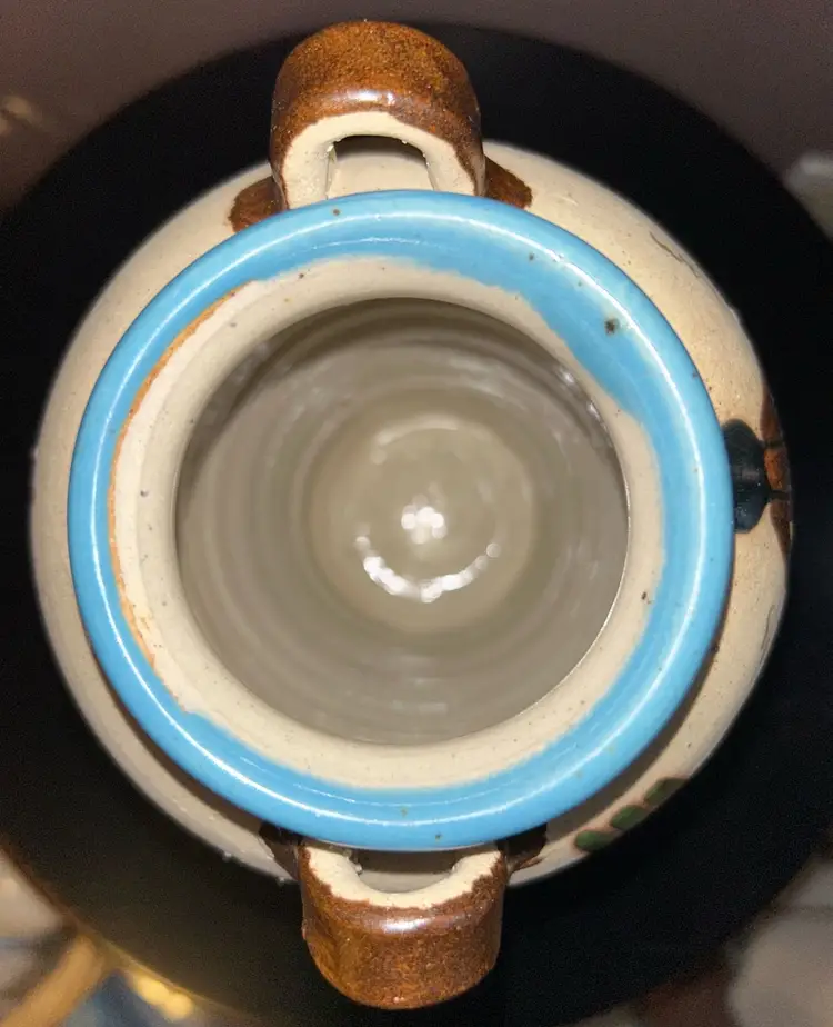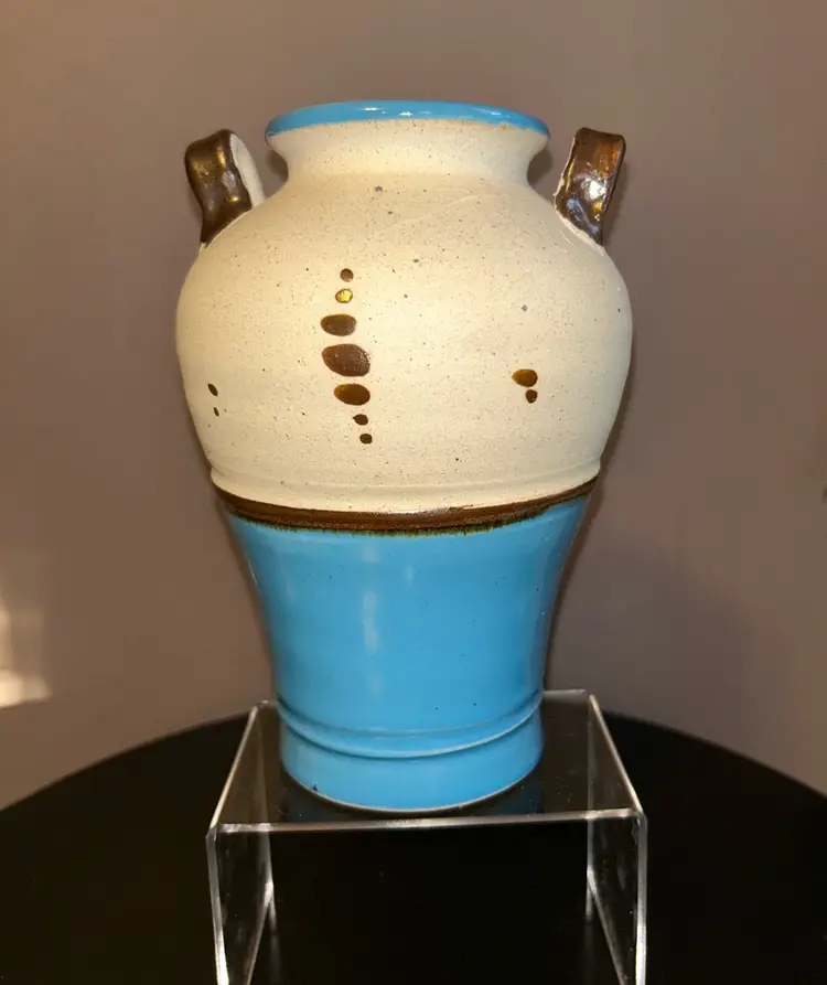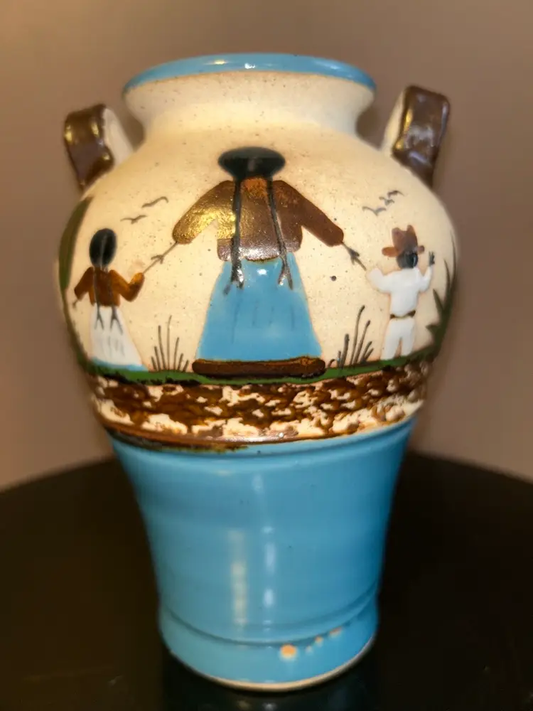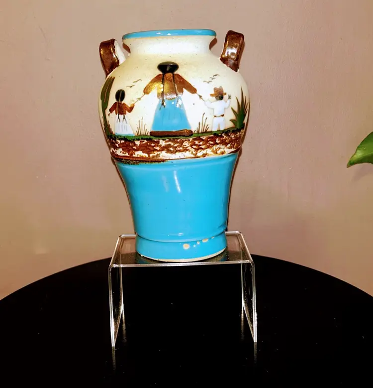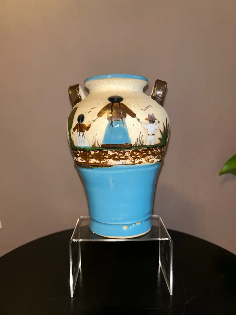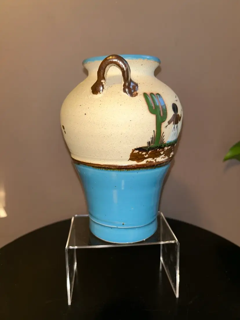 Add a touch of culture to your home with this stunning Tonala vase. This handmade pottery stands 8” tall and showcases the beautiful artwork of Mexican art. Due to age marking is barely visible.