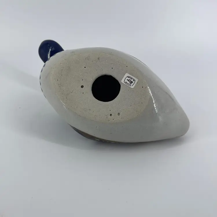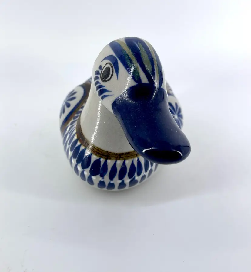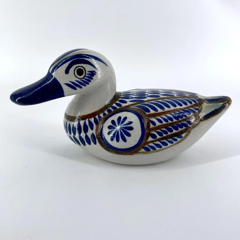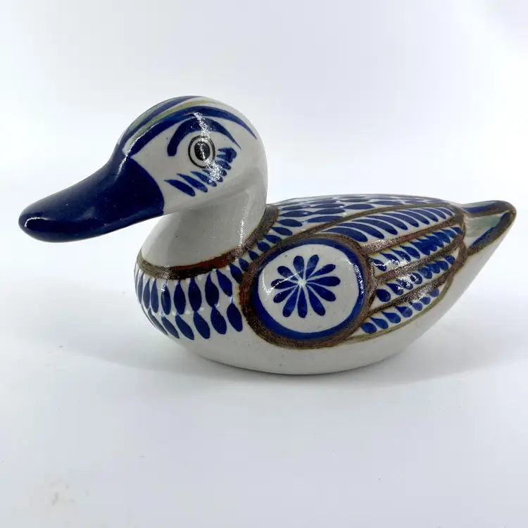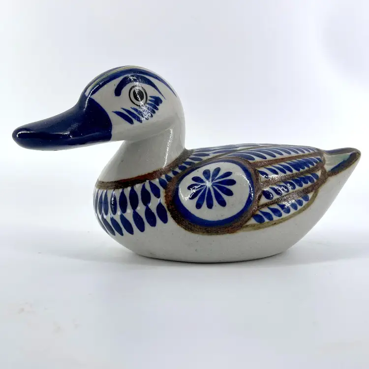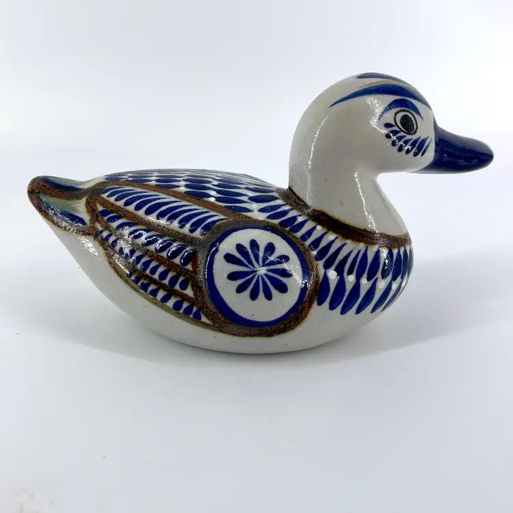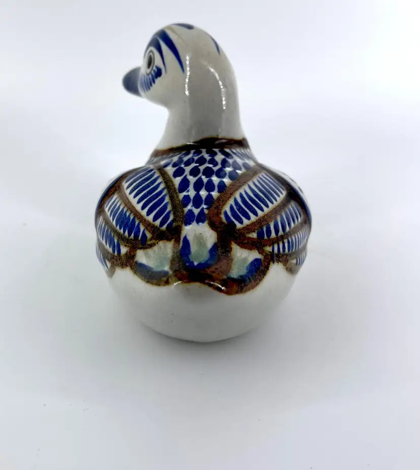 This stunning duck figurine was made in Mexico and features a hand painted iconic Tonala pottery design with blue, green, white and brown. It is 4.25" tall and measures 8"x4". It is excellent condition. There are no cracks, breaks, chips or repairs. (See photos).