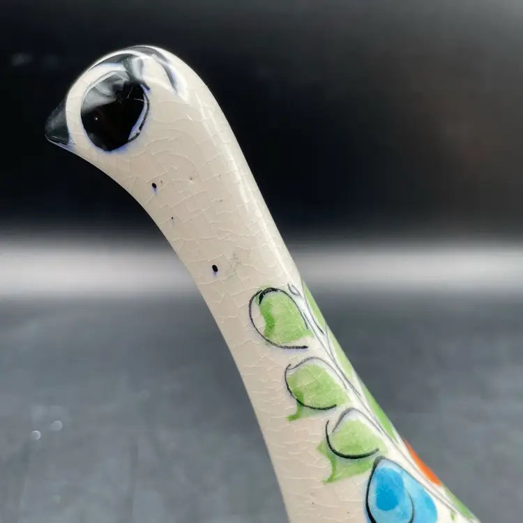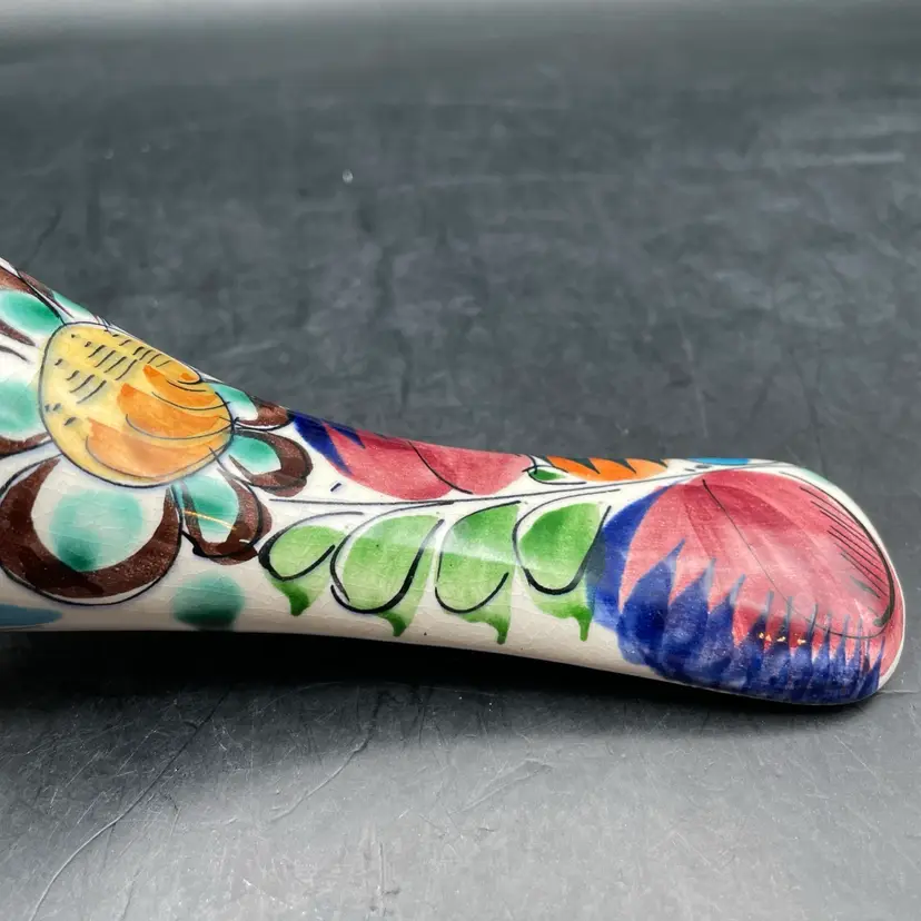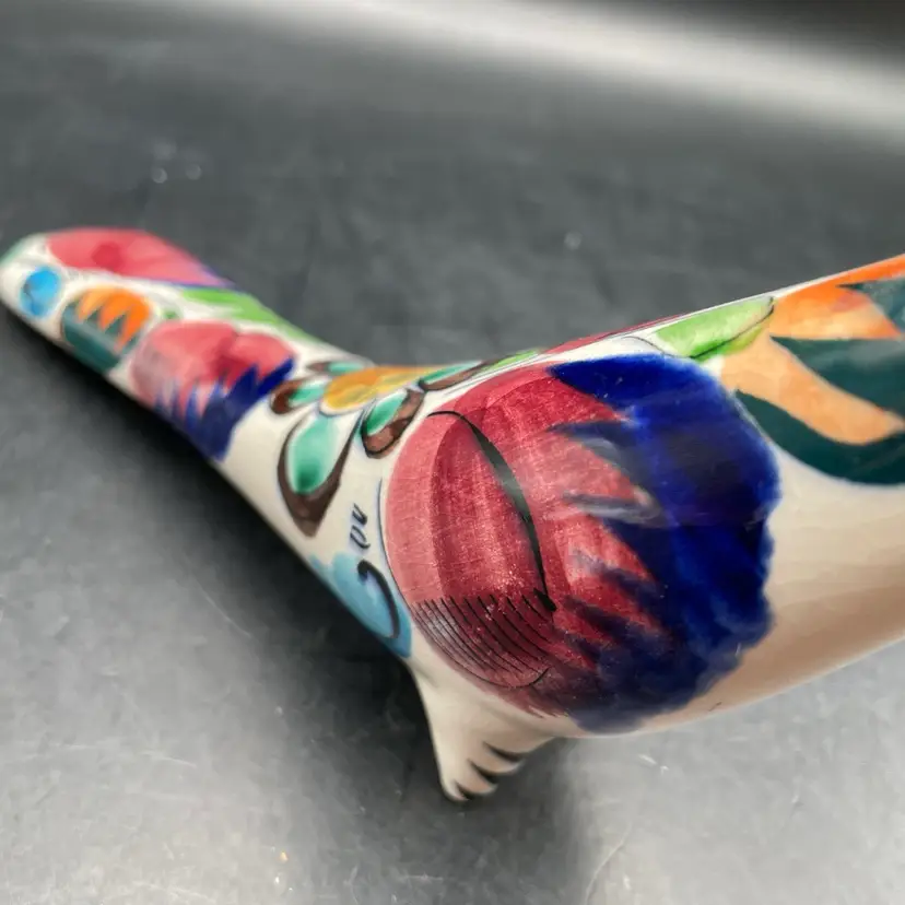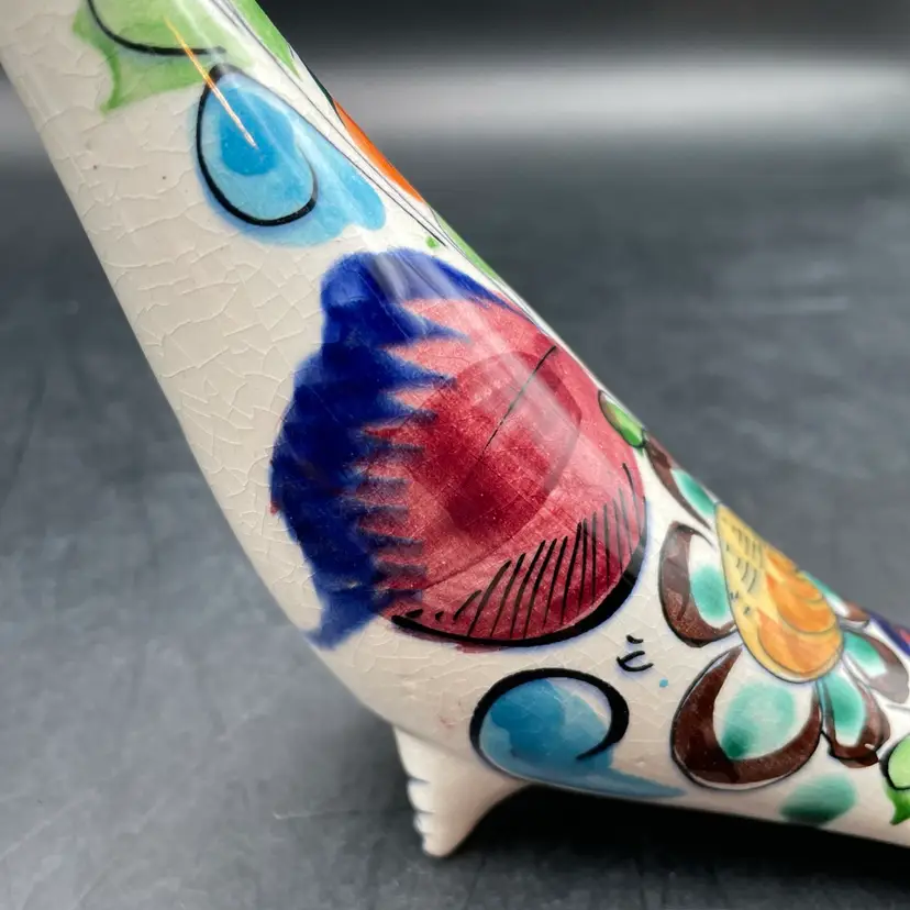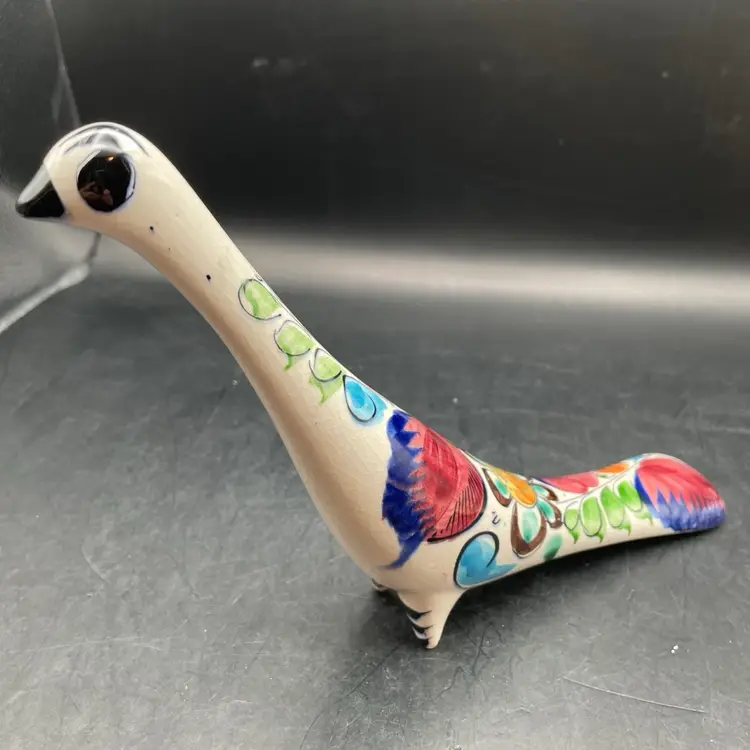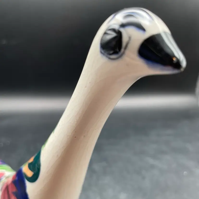 Folk art bird. Approximately 9” x 6.5”. Lots of crazing and the tip of his tail on the underside has no glaze. Please see pictures.