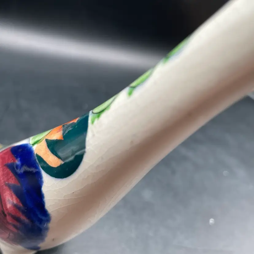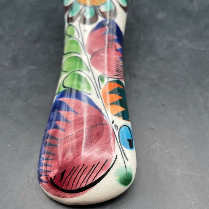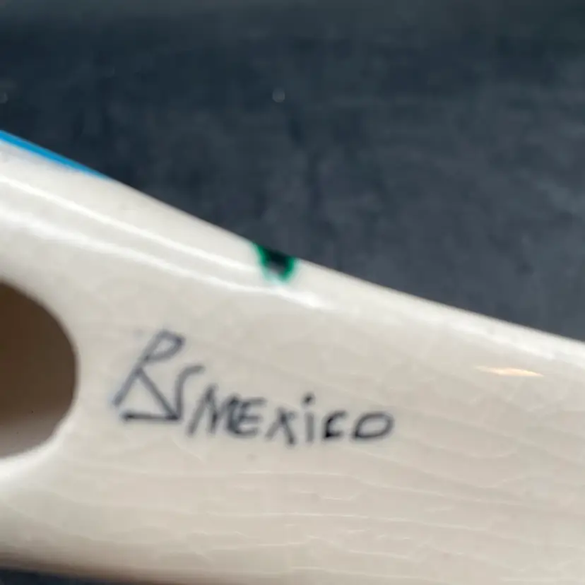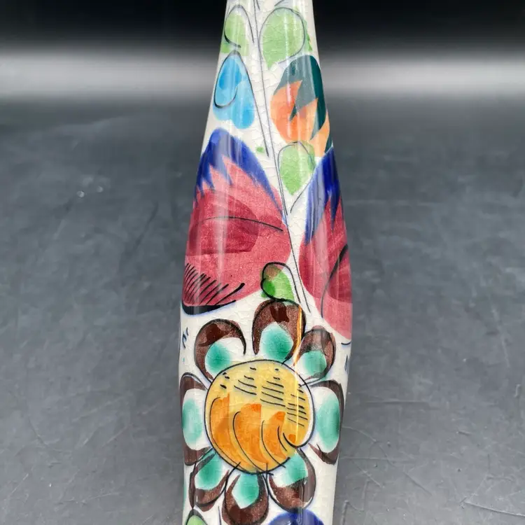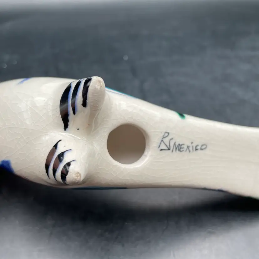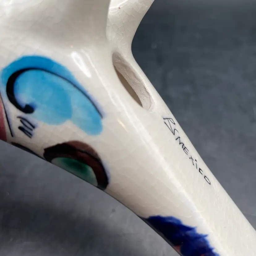 Folk art bird. Approximately 9” x 6.5”. Lots of crazing and the tip of his tail on the underside has no glaze. Please see pictures.