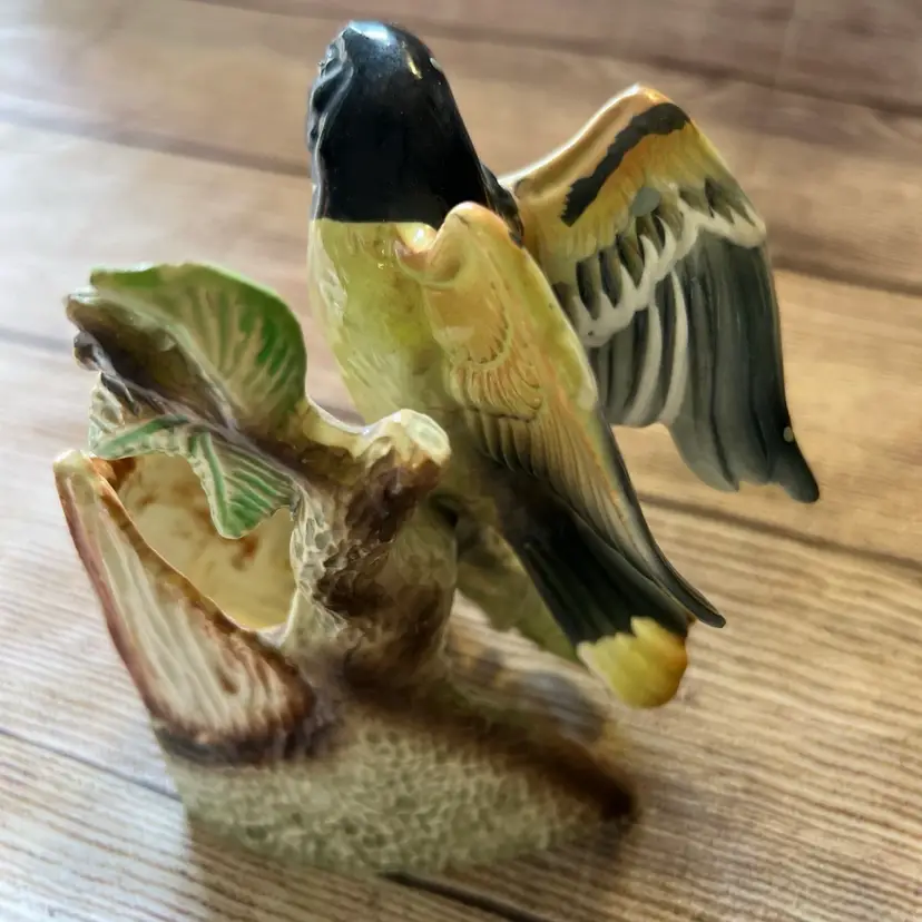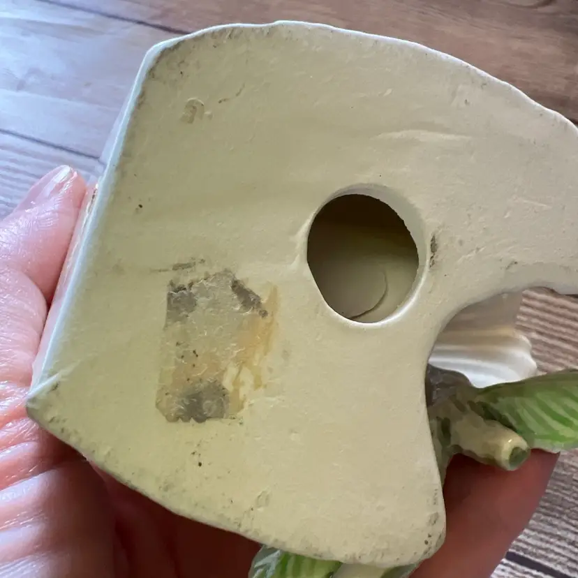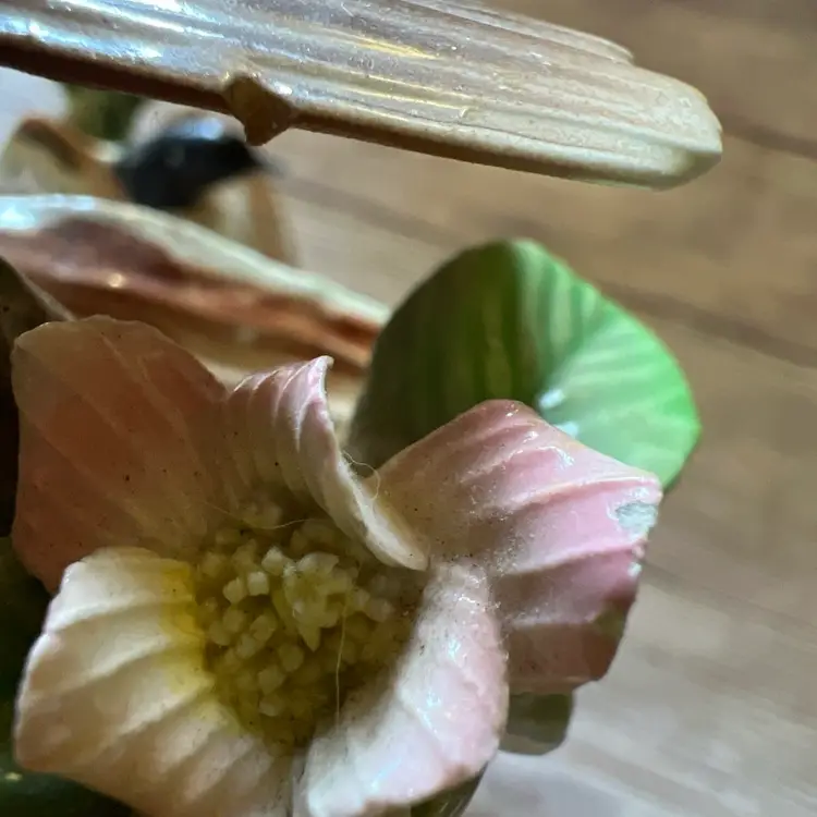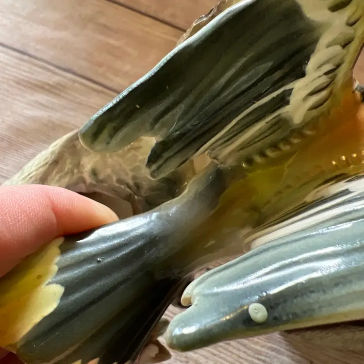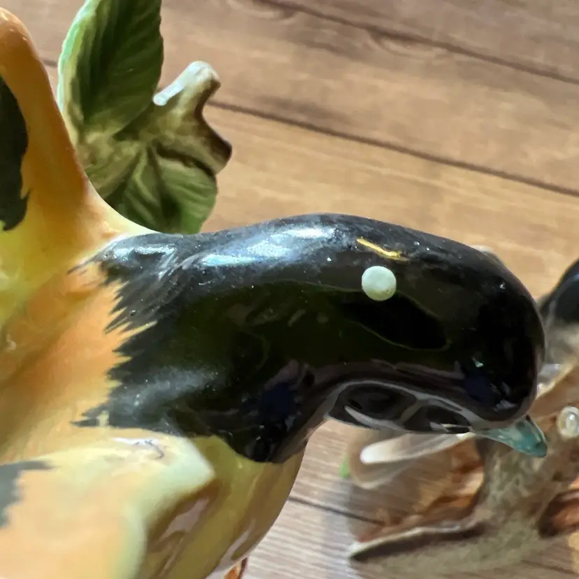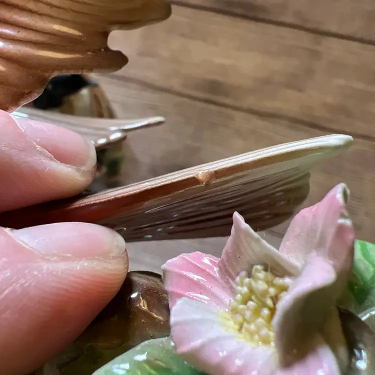 One bird has a couple stray spots of dried paint. The other has an unglazed corner, a nick in a wing that’s been glazed over, and a small chip on one flower petal.