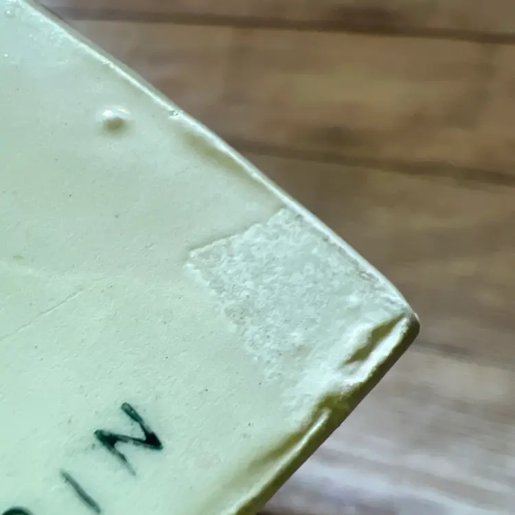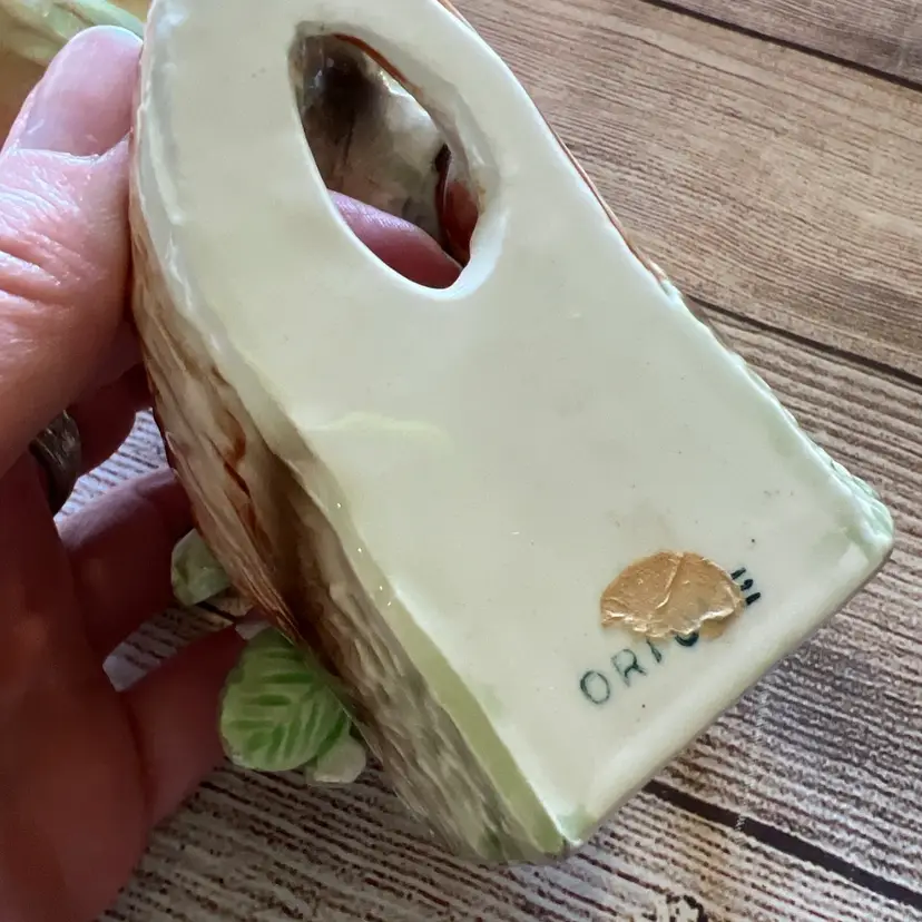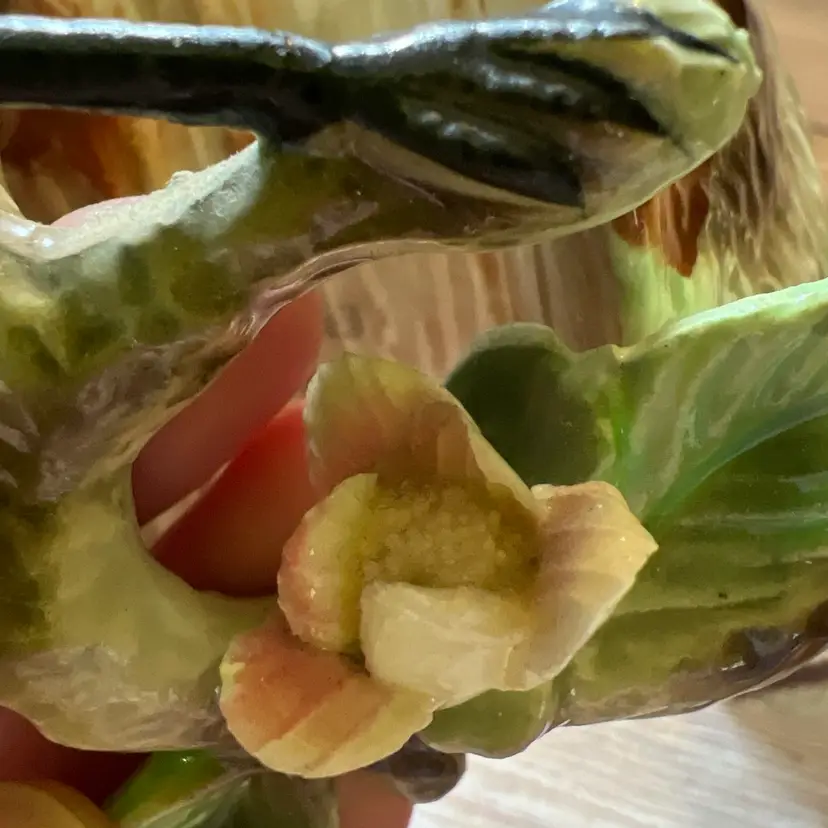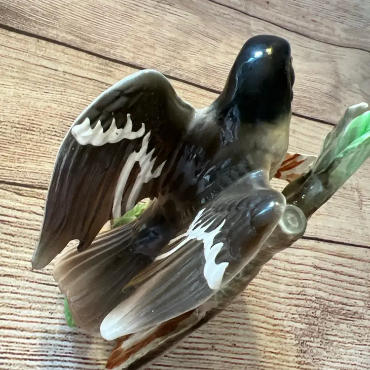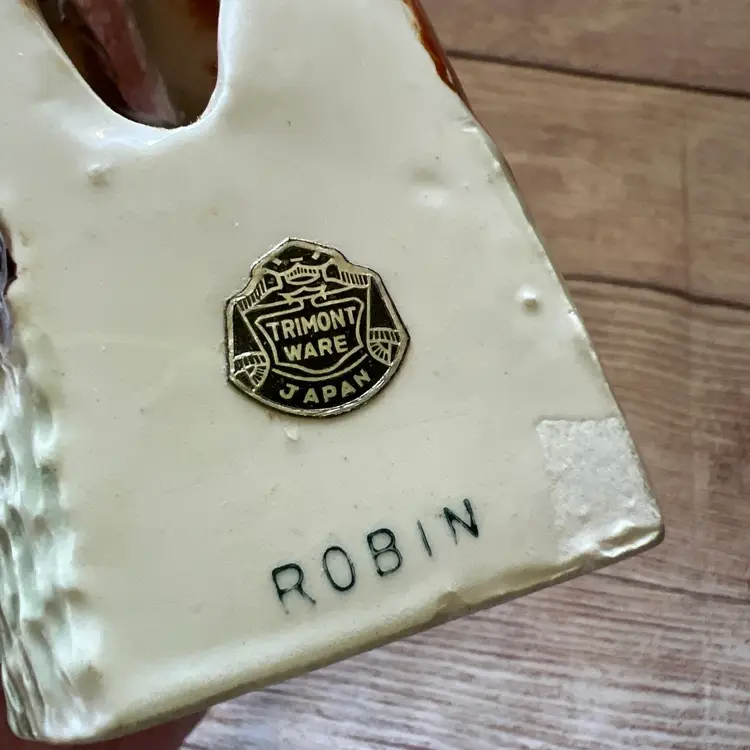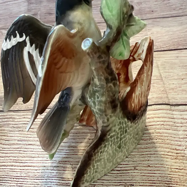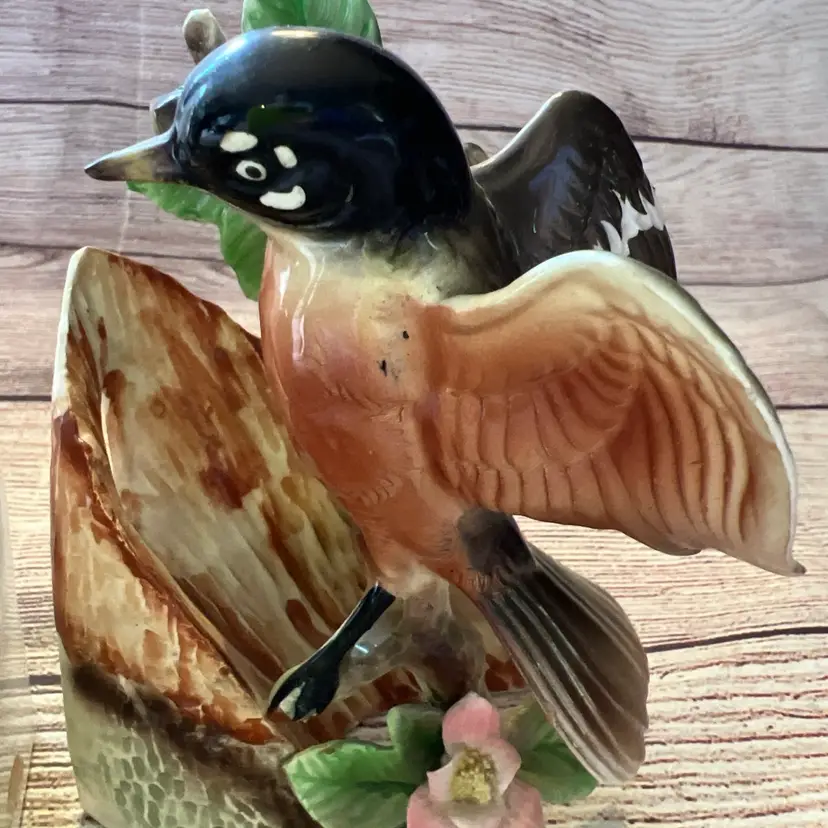 One bird has a couple stray spots of dried paint. The other has an unglazed corner, a nick in a wing that’s been glazed over, and a small chip on one flower petal.
