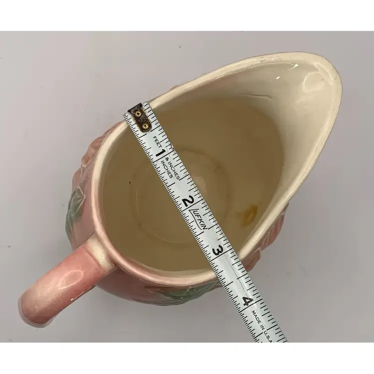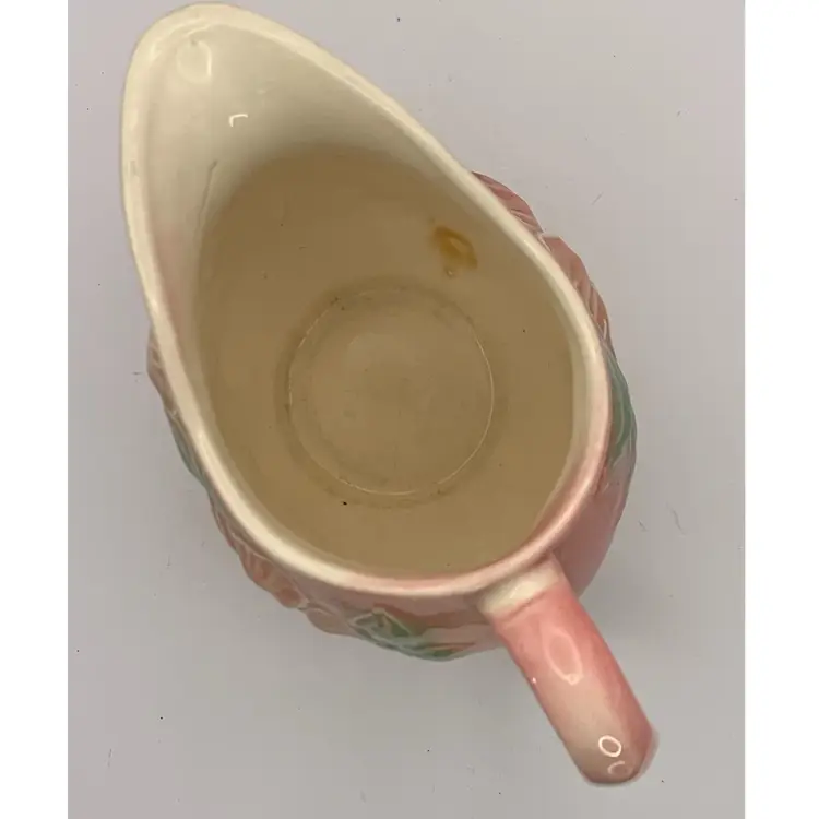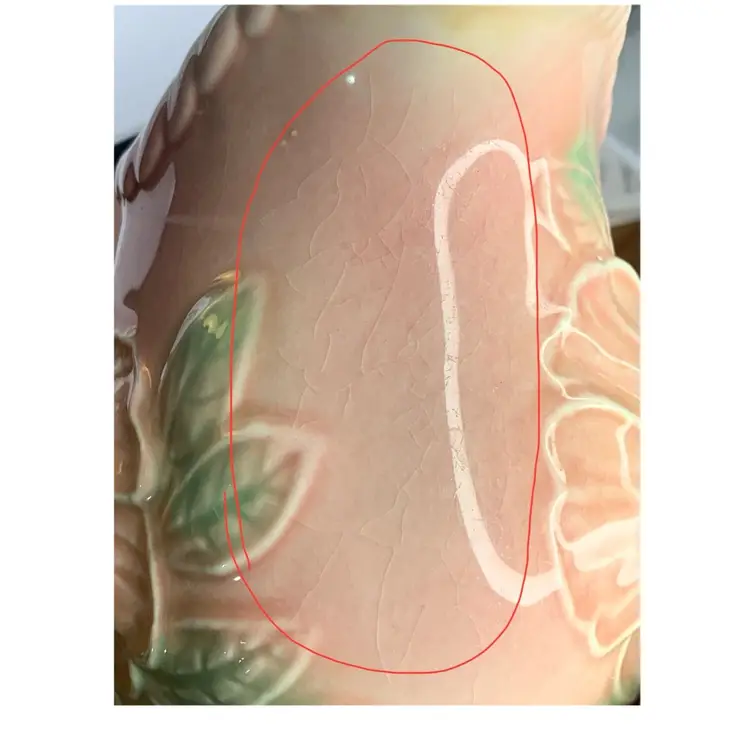 This pretty pitcher is in good condition. With no chips or repairs. The glaze does have some crazing due to age. There is a stain on the inside.