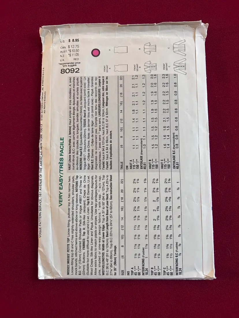 Vtg Vogue Pattern 8092 Petite Top Please see photos. Let me know if you have any questions. Single item offers and bundle item offer for seriously considered. Thank you for stopping by.