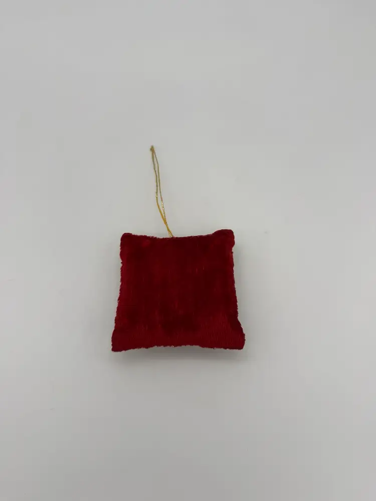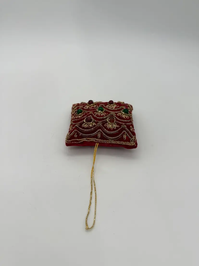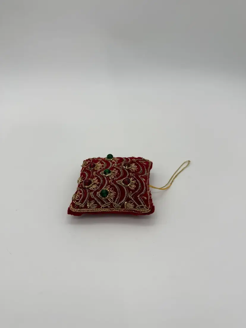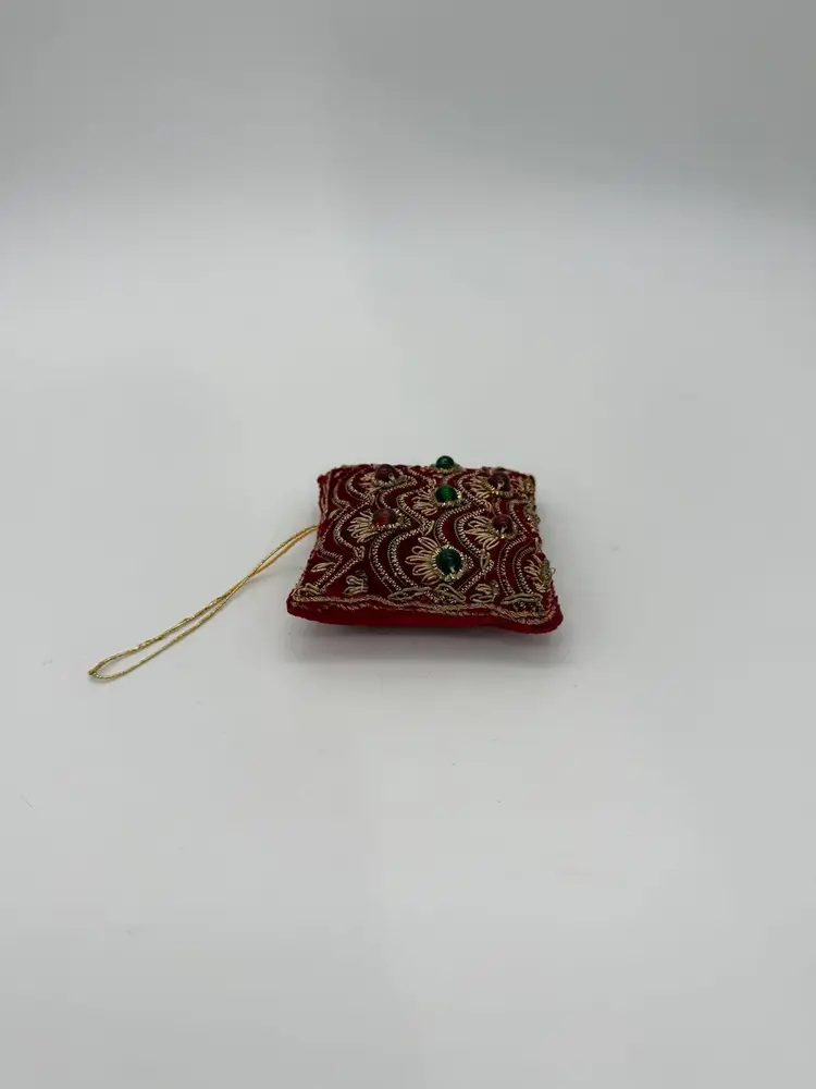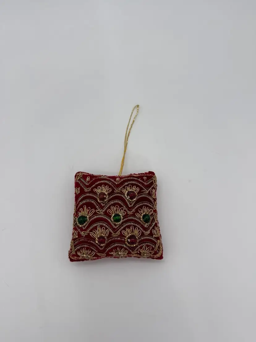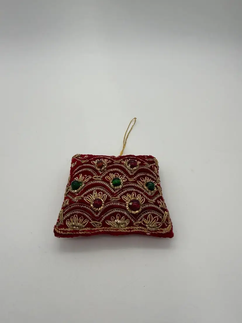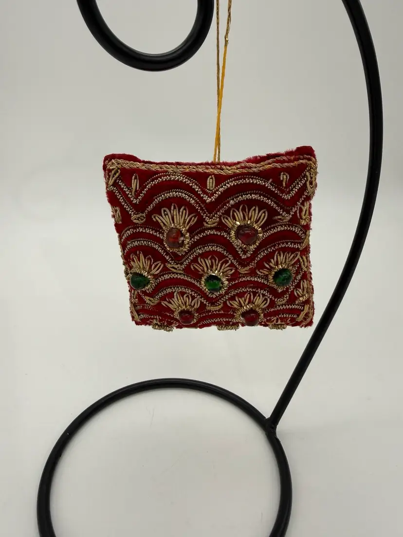 This vintage Victorian mid-century hand embroidered Zardozi square ornament in royal red is an exquisite piece that adds a touch of traditional elegance to any holiday or special occasion decor. Handmade in India with intricate embroidery and threaded beads, this small ornament features a unique Zardozi production style and a beautiful brocade pattern in royal red, green, metallic, gold, silver, and bronze colors. The ornament is crafted from vintage velvet fabric with metallic tassel, making it a Rare & one-of-a-kind collectible item perfect for adding a touch of Victorian and mid-century style to your home.