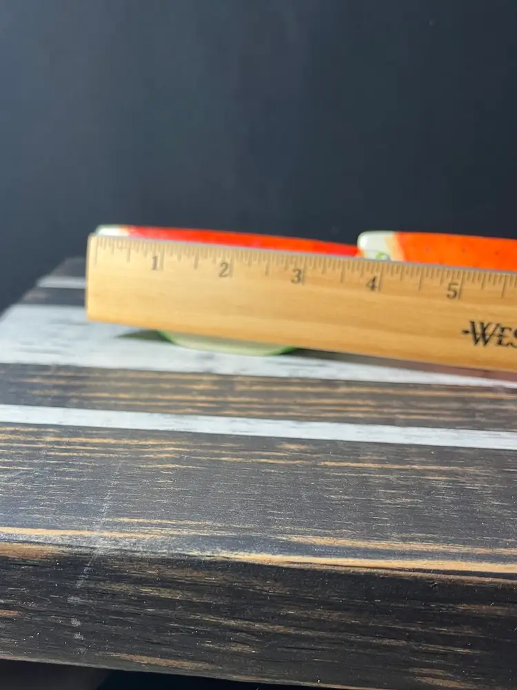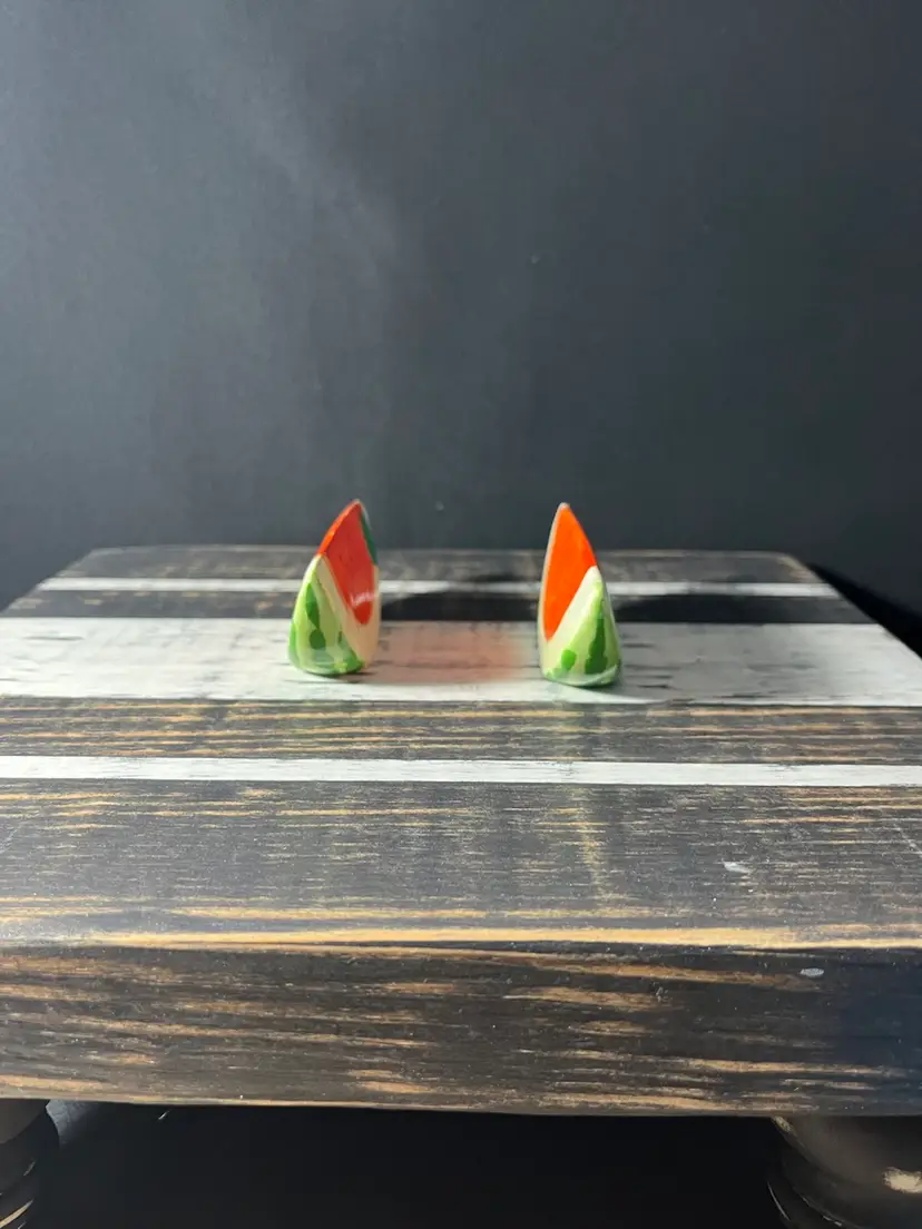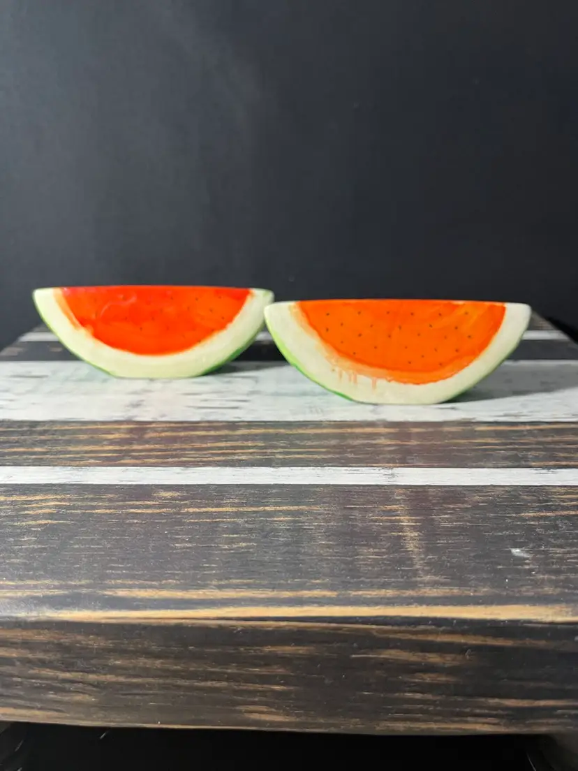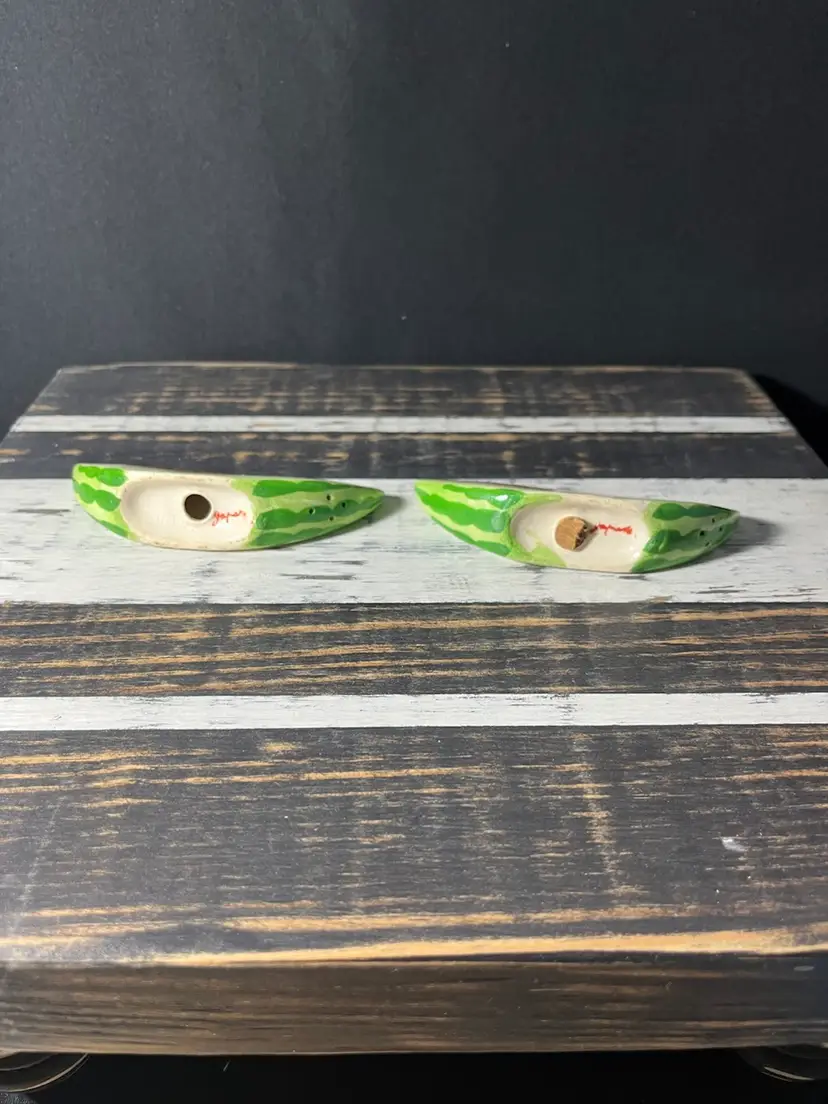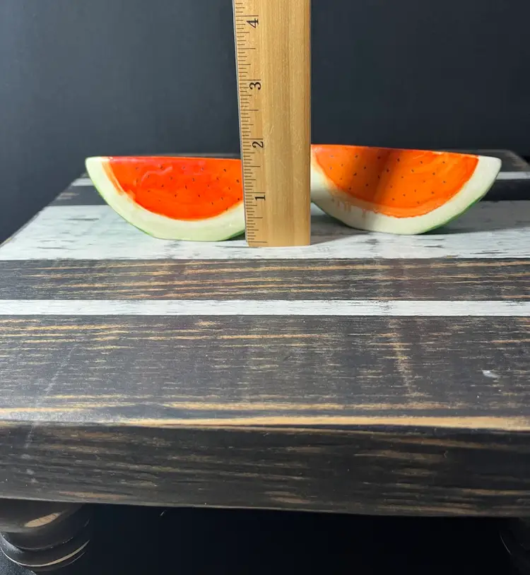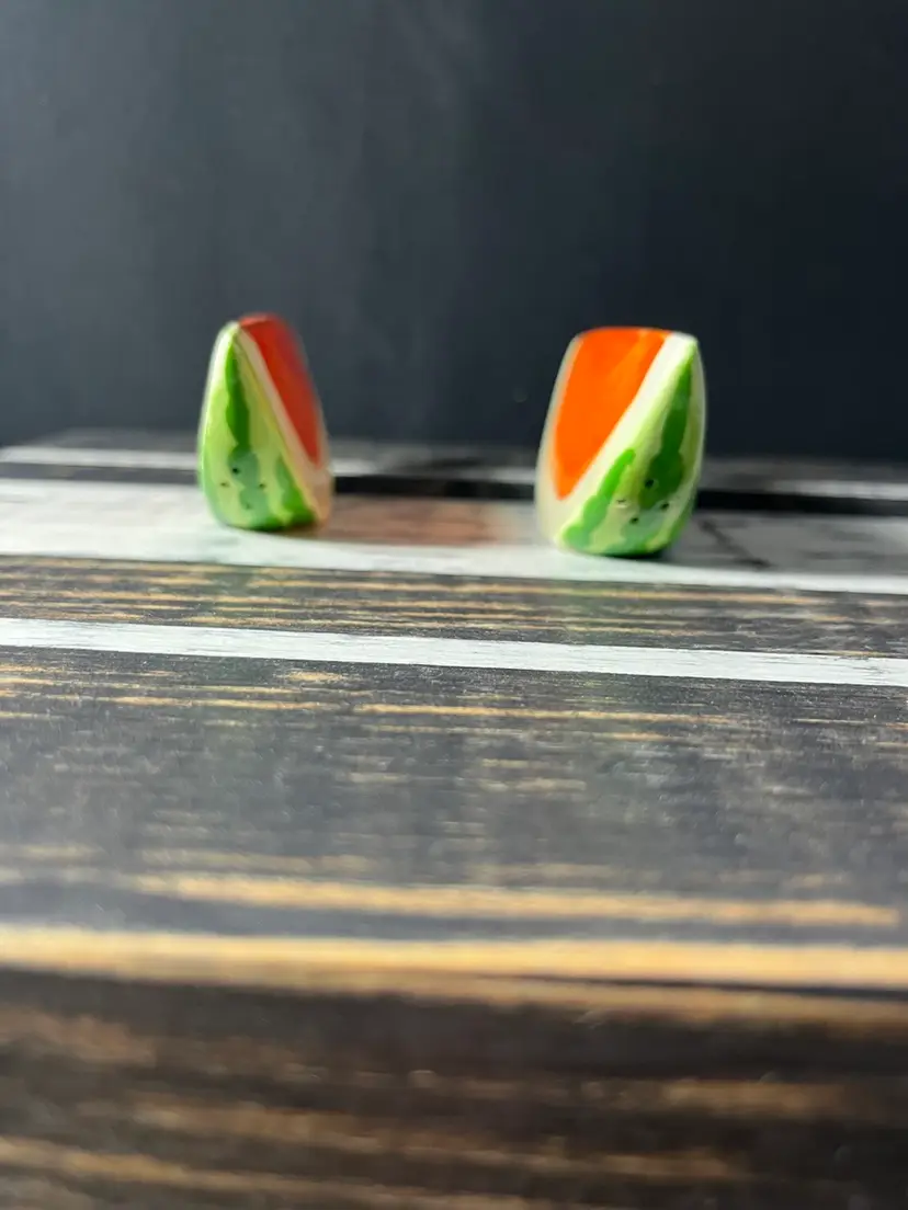 “1037 Cute VTG Watermelon S & P Shakers Made In Japan. Measures 1.75” x 4.25”. Missing one cork. No chips or cracks.