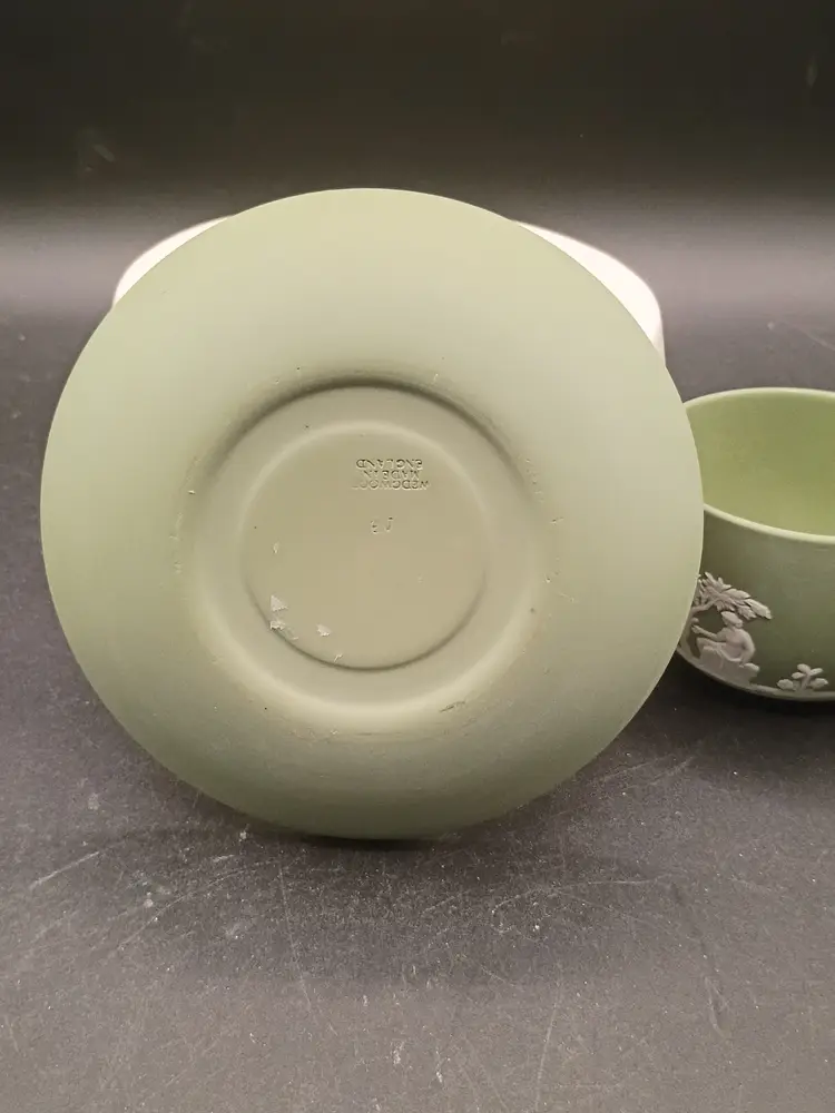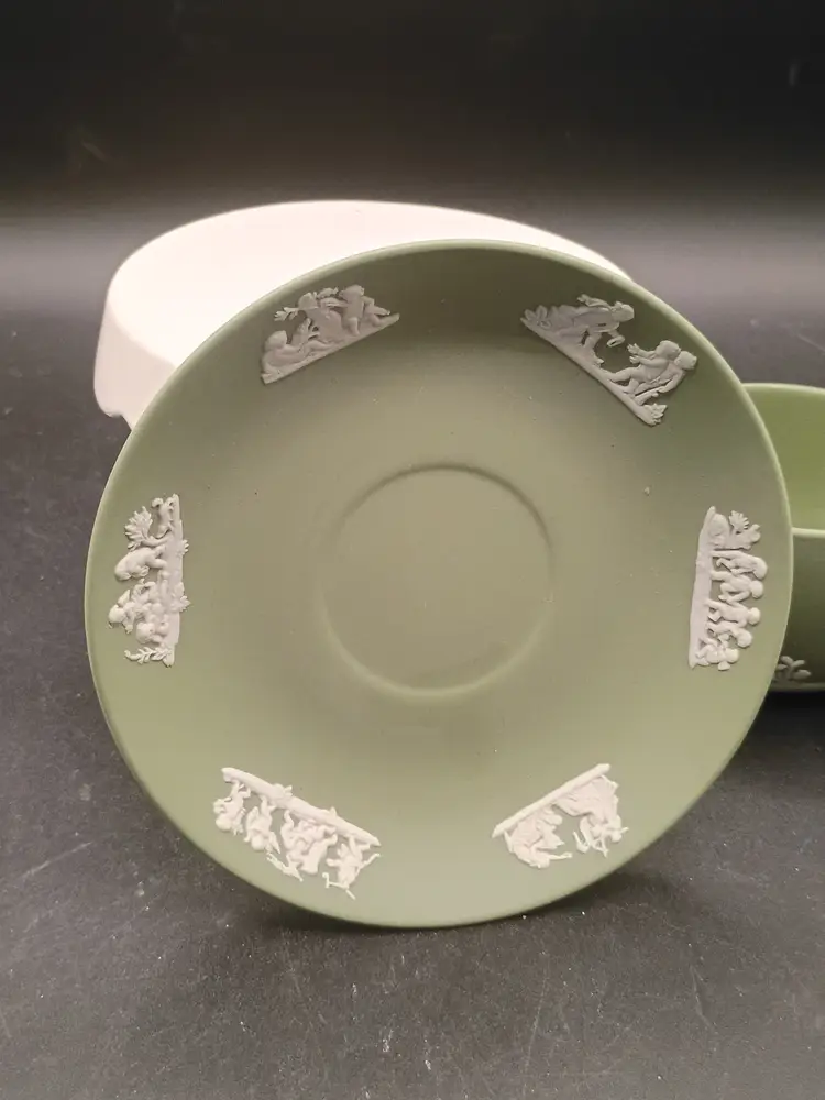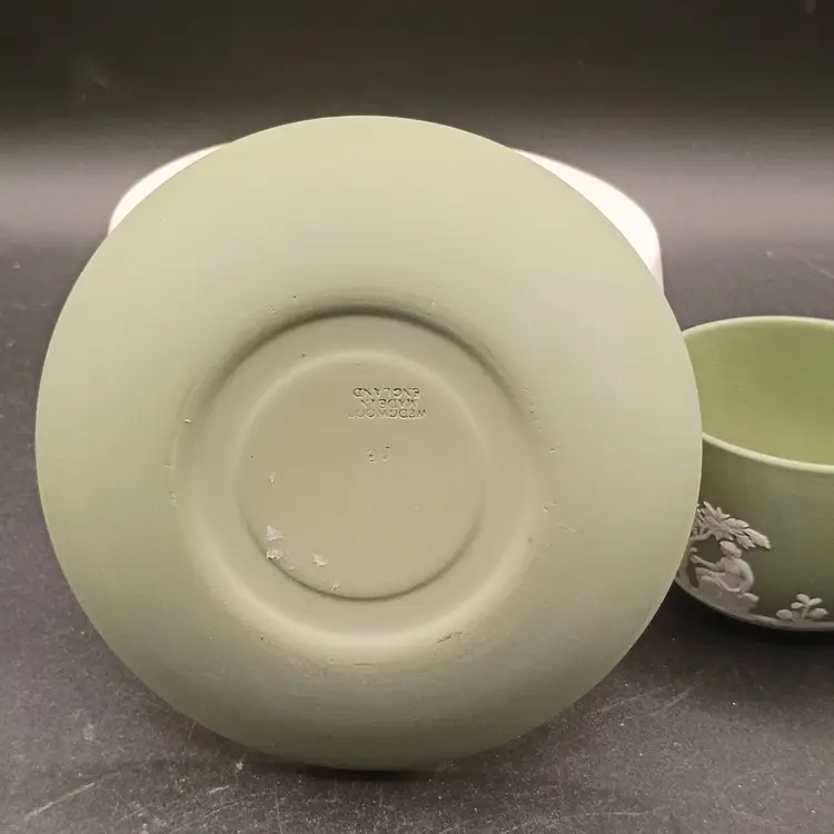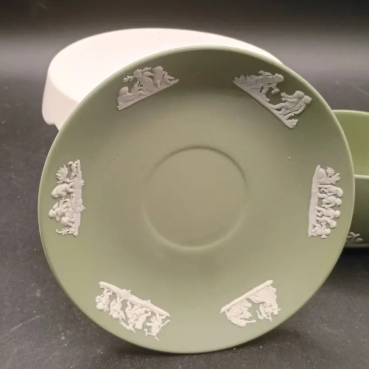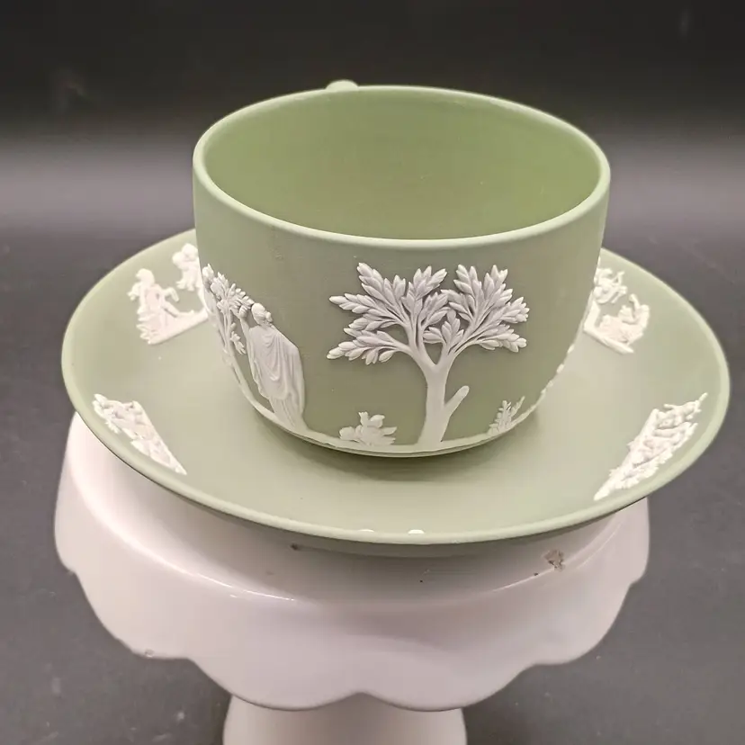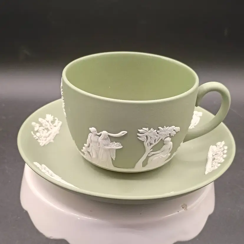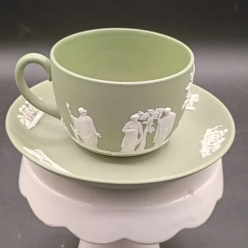 Wedgwood Jasperware teacup and saucer set features the iconic celadon green matte finish adorned with classic white relief Neoclassical figures and floral motifs and Produced in England during the 1960s., t