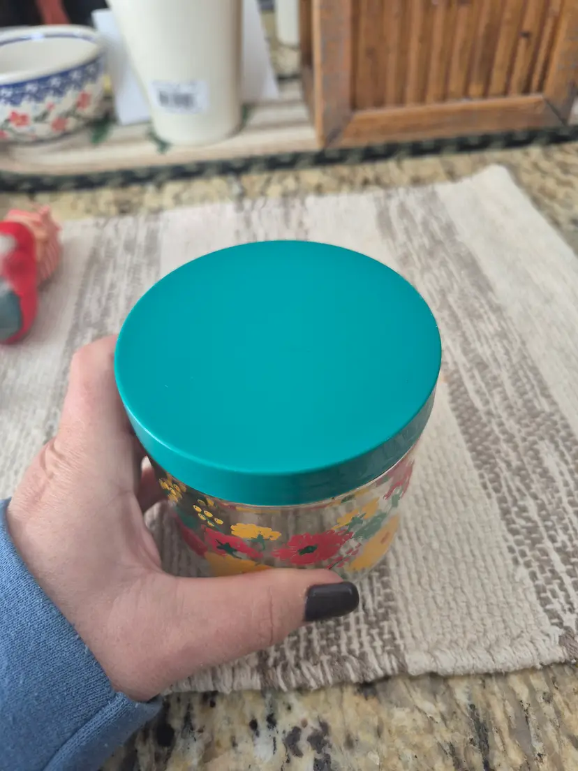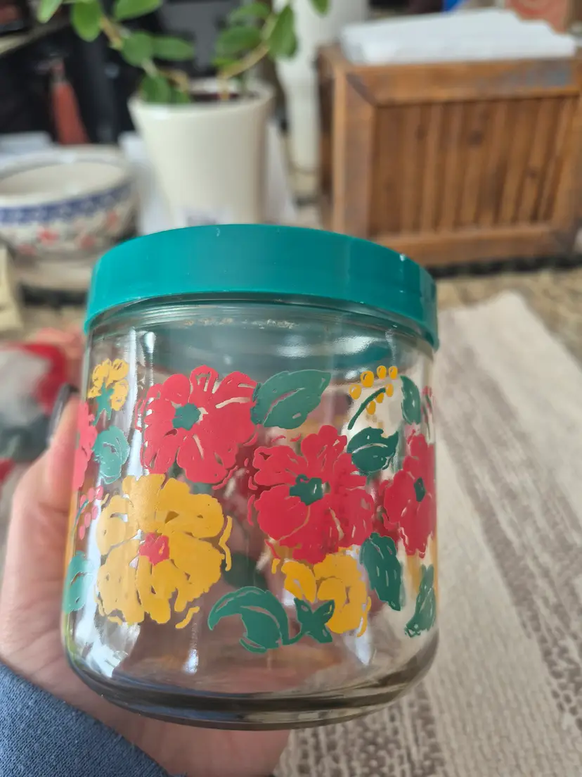 Vintage glass canister/jar by Westinghouse with floral pattern and teal plastic lid. 1960's era.