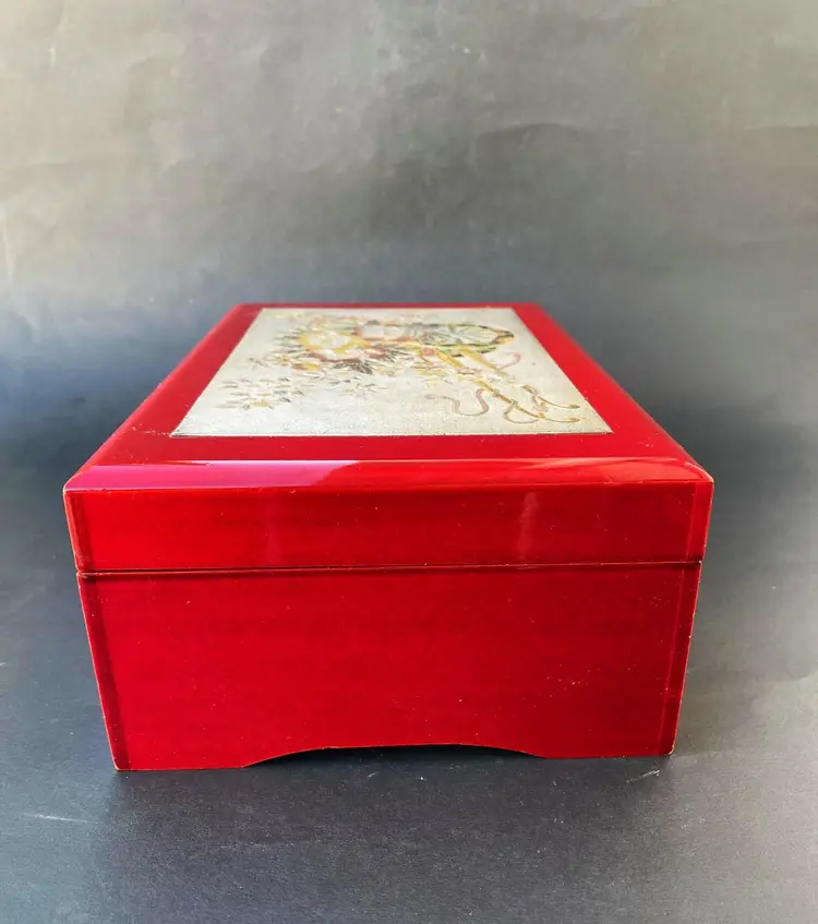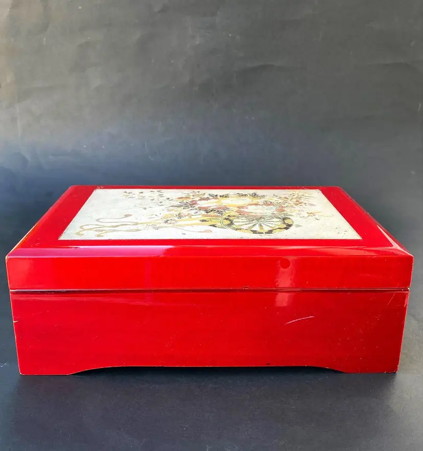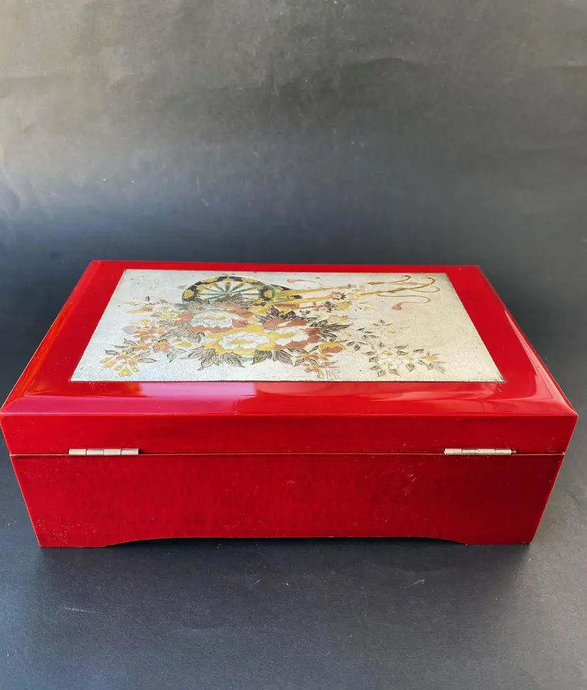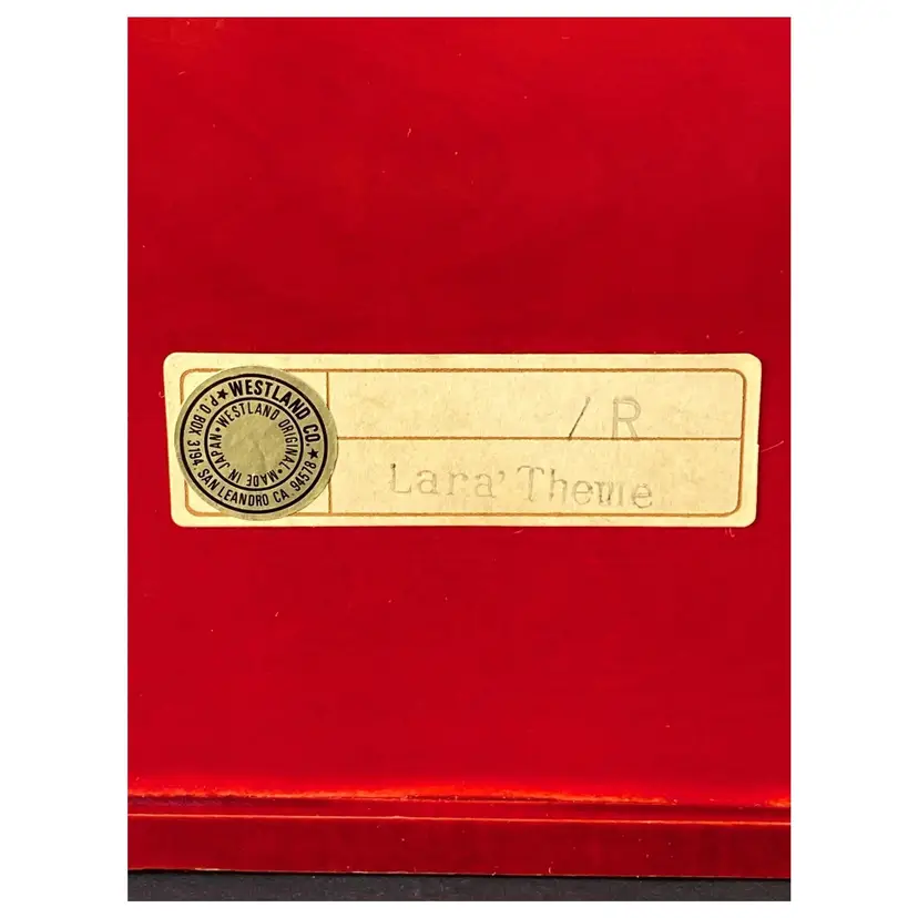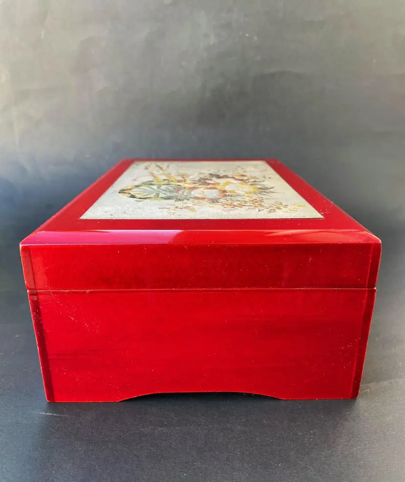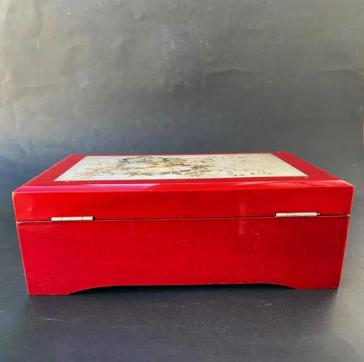 Introduce a harmonious blend of nostalgia and craftsmanship to your space with this vintage Westland Co. musical jewelry box, a delightful creation made in Japan. Crafted with precision and attention to detail, this vintage gem is etched with a beautiful design of flowers in a pull-cart on the top lid and when opened, brings the enchanting melody of "Lara's Theme" from the film Doctor Zhivago. The interior is lined with soft red velvet with compartments for trinkets as well as a mirror under the lid. Elevate your decor with this lovely piece. Measurements: 10" x 7" x 4". This musical jewelry box is in good pre-owned condition with some minor wear (see photo).