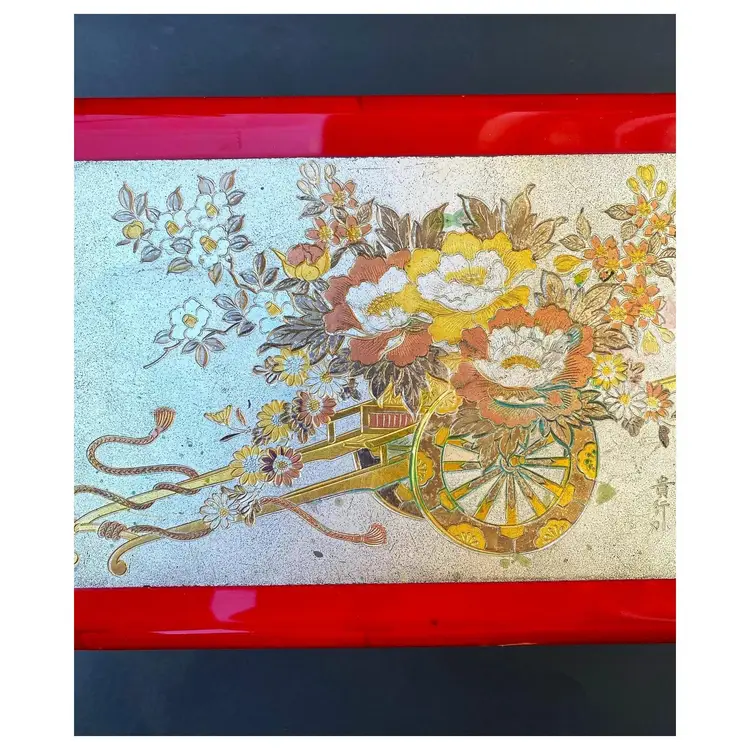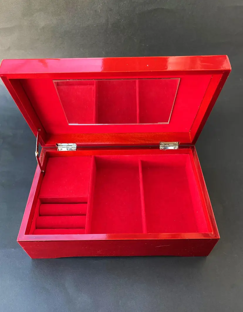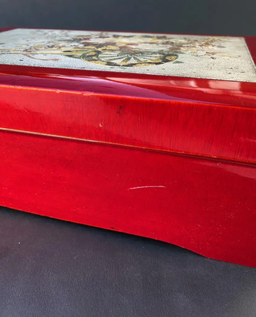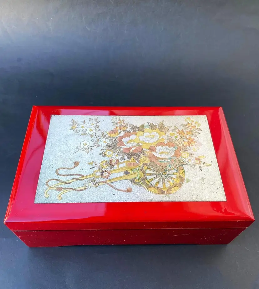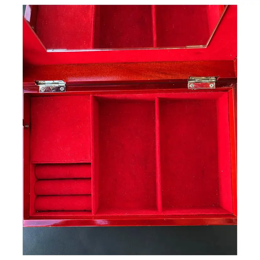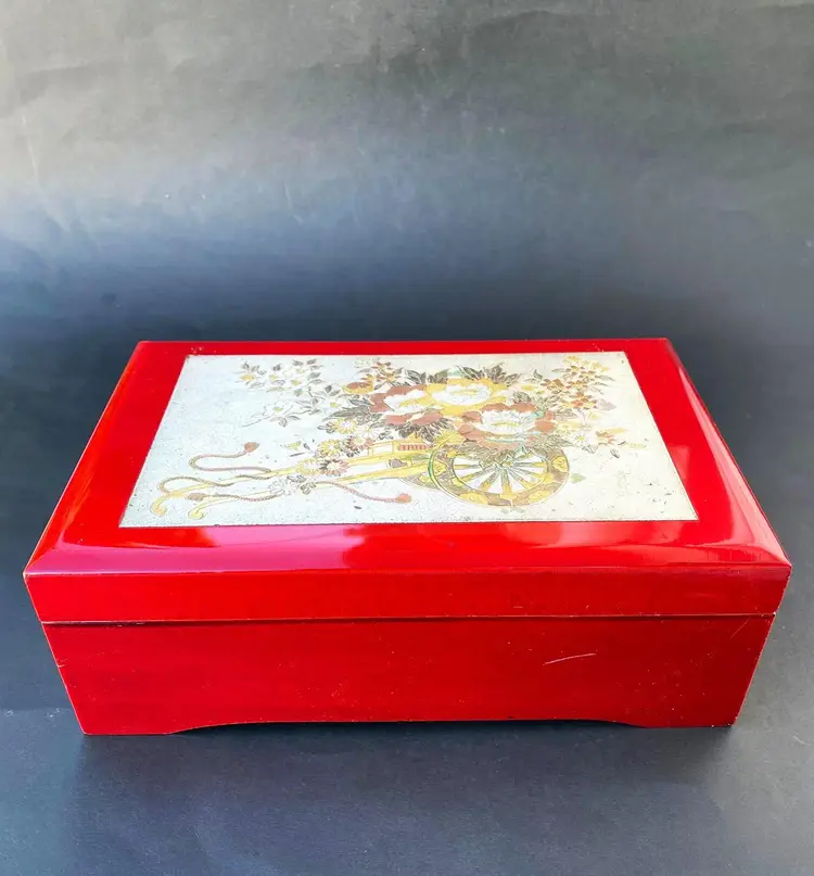 Introduce a harmonious blend of nostalgia and craftsmanship to your space with this vintage Westland Co. musical jewelry box, a delightful creation made in Japan. Crafted with precision and attention to detail, this vintage gem is etched with a beautiful design of flowers in a pull-cart on the top lid and when opened, brings the enchanting melody of "Lara's Theme" from the film Doctor Zhivago. The interior is lined with soft red velvet with compartments for trinkets as well as a mirror under the lid. Elevate your decor with this lovely piece. Measurements: 10" x 7" x 4". This musical jewelry box is in good pre-owned condition with some minor wear (see photo).
