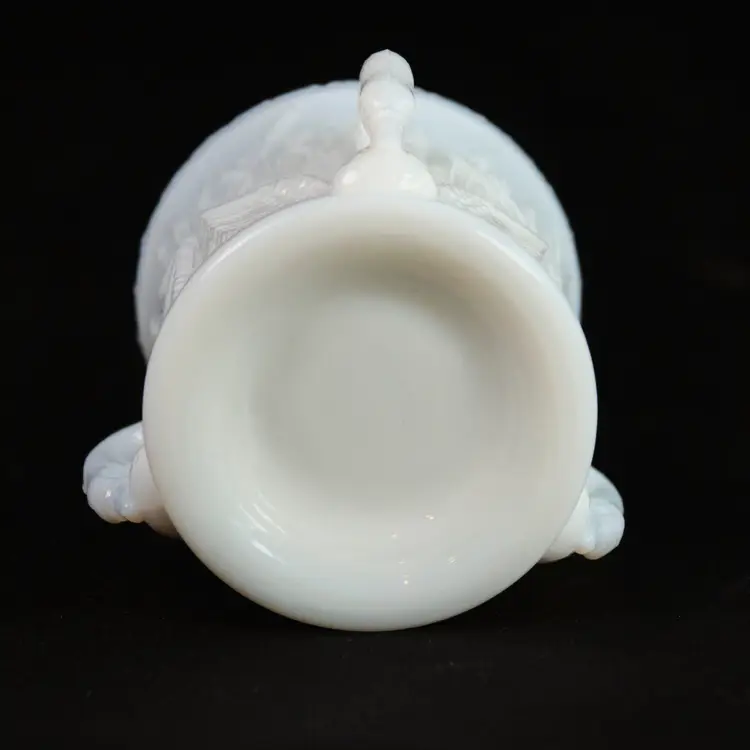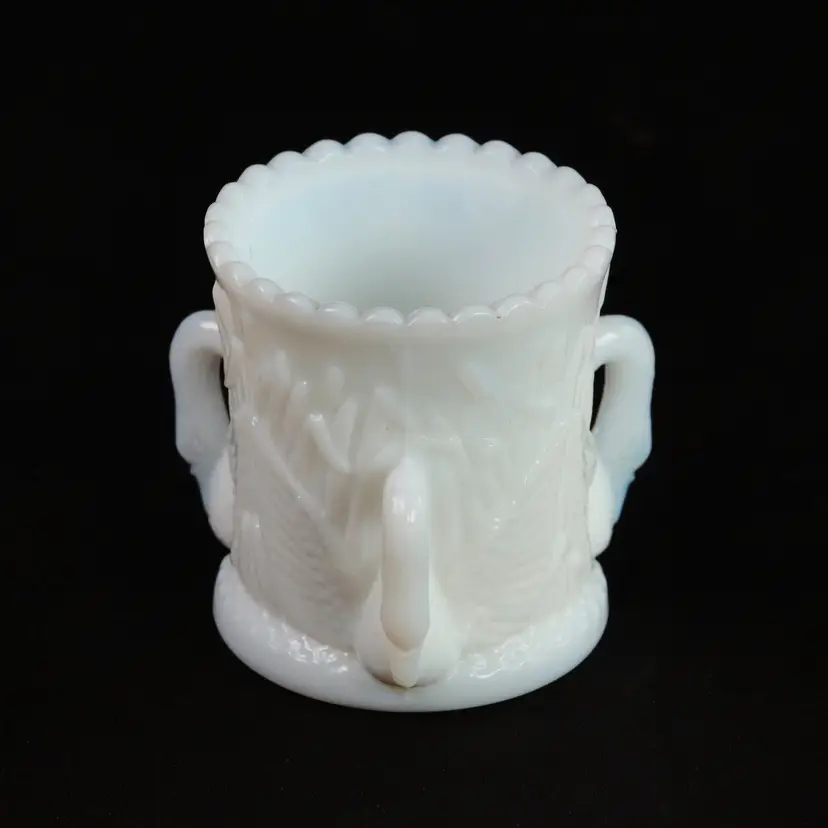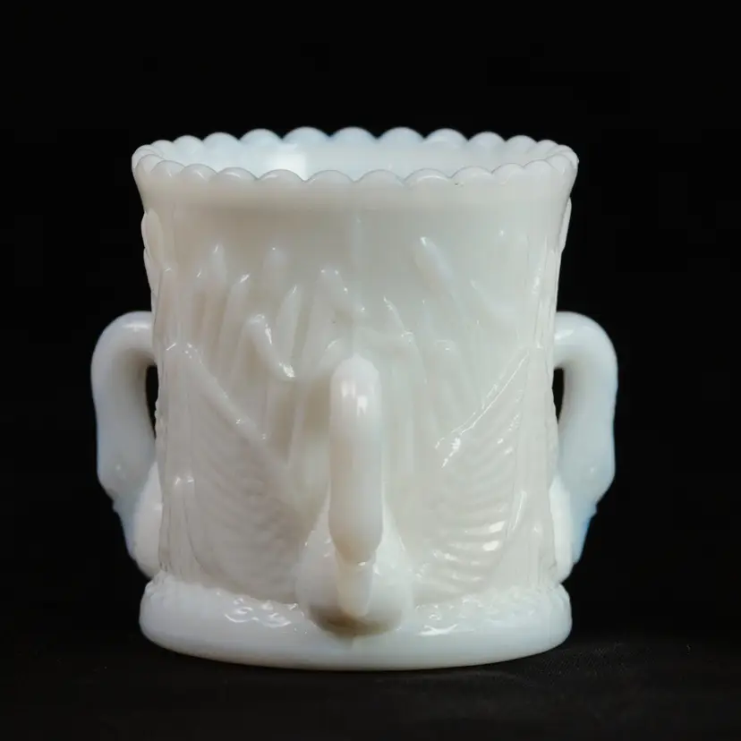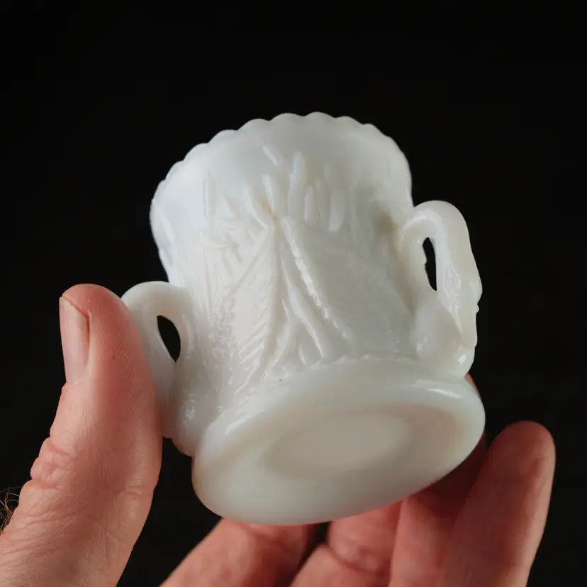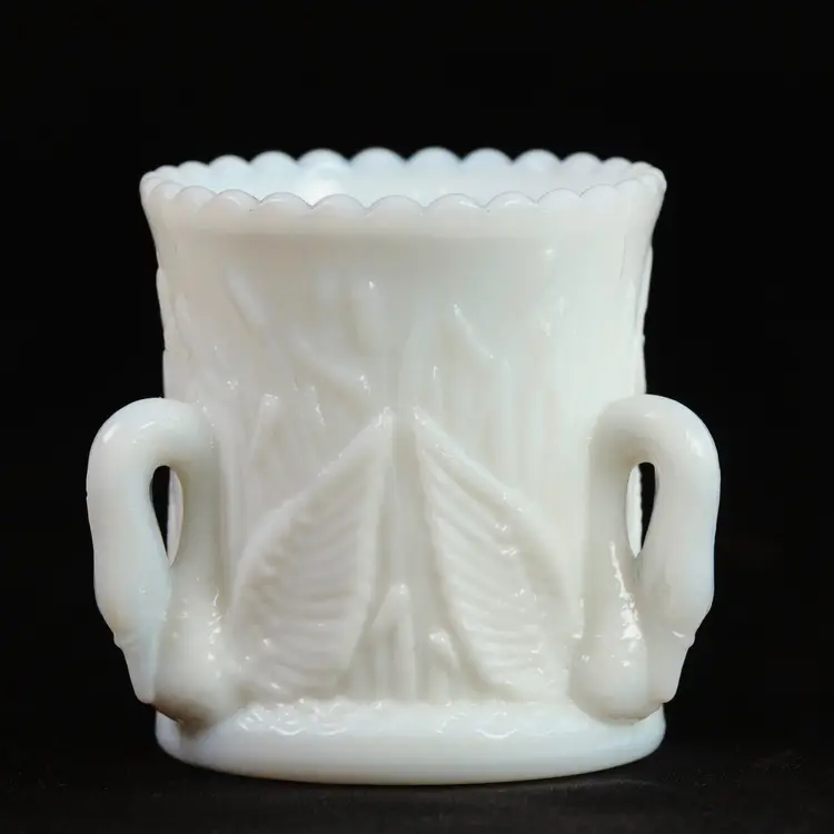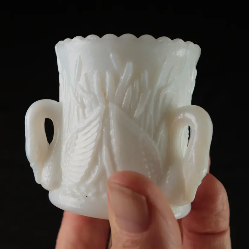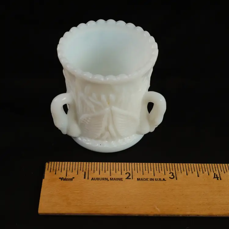 A milk glass toothpick holder featuring three stylized swans and tiny cattails. Made by Westmoreland Glass Co.