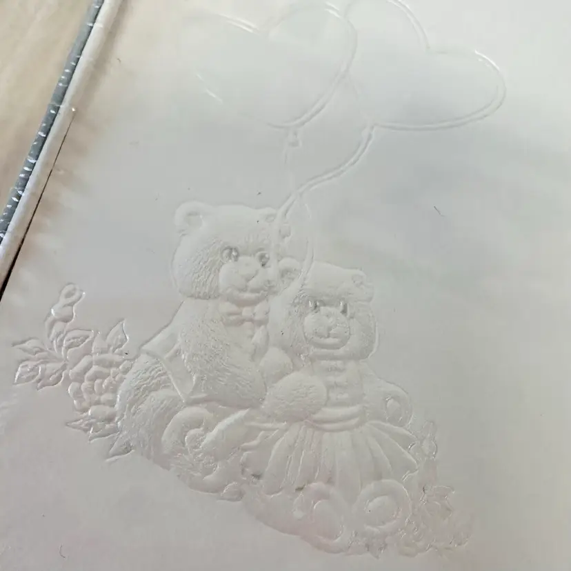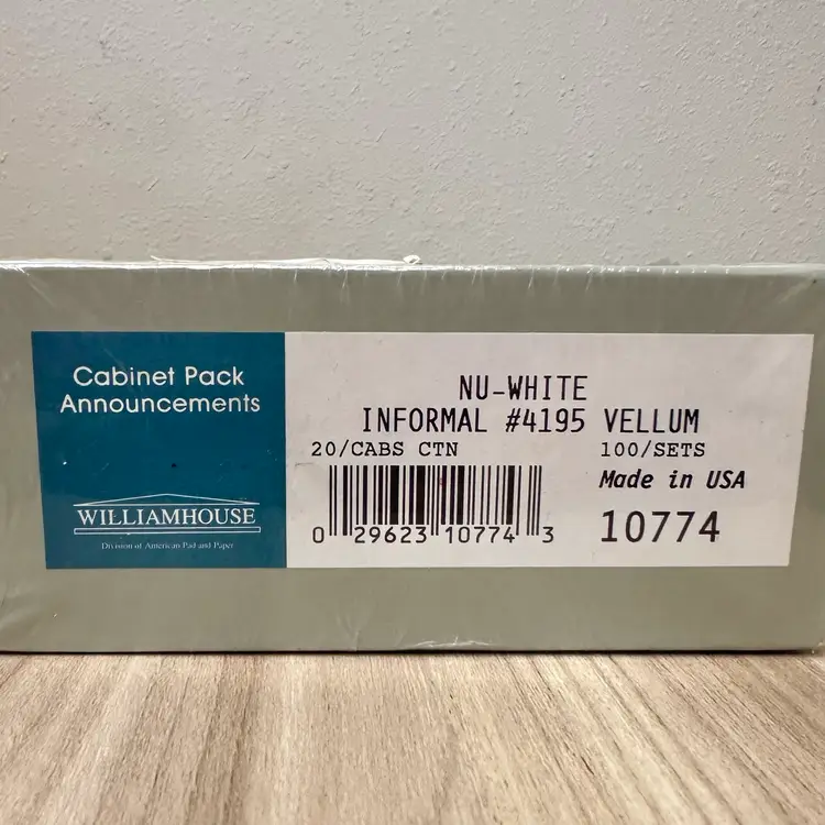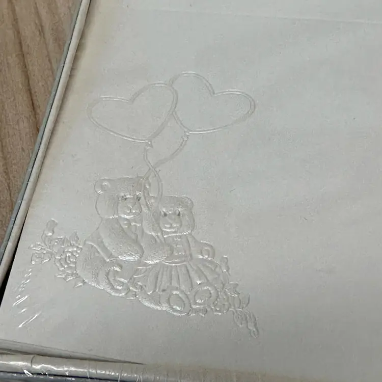 This listing Is for one cabinet pack of vintage card stock announcements featuring embossed bears with heart balloons. The pack contains 100 foldable cards and envelopes. This is old new stock, in package but this one has an opening slot at the top, but paper is not damaged.