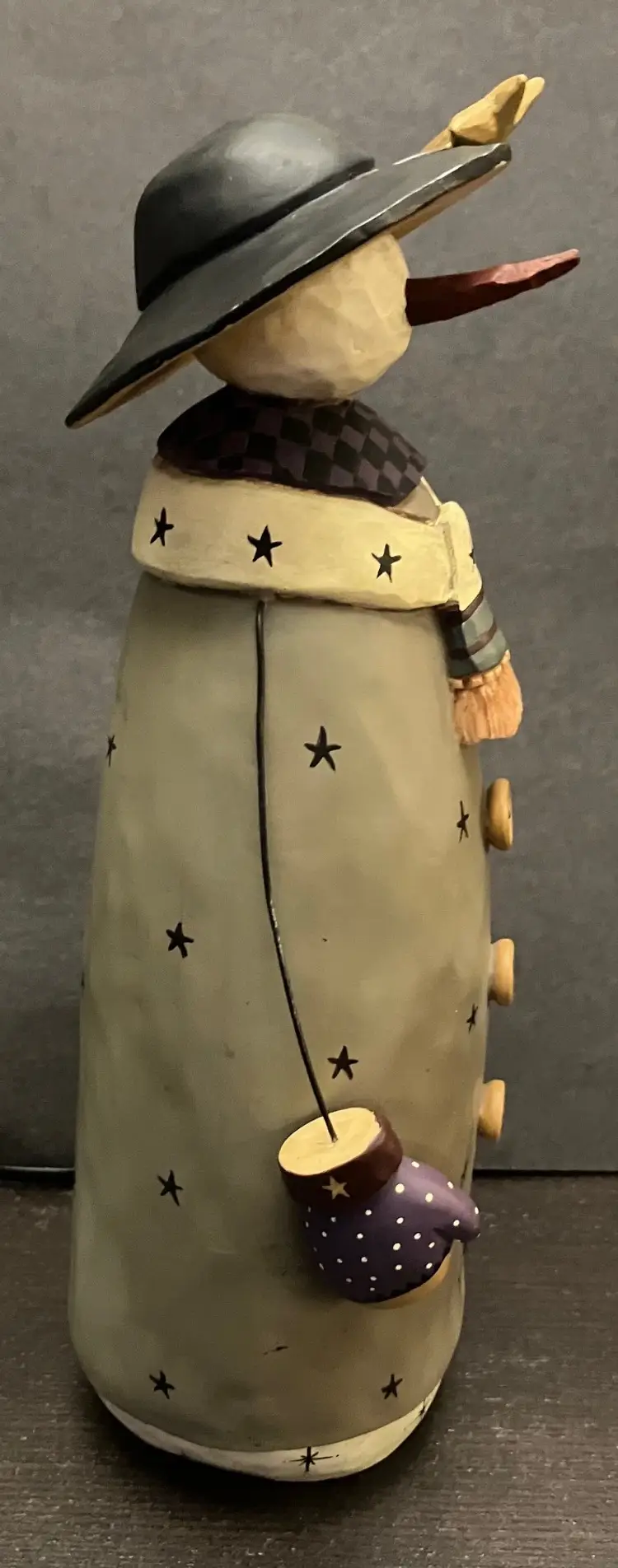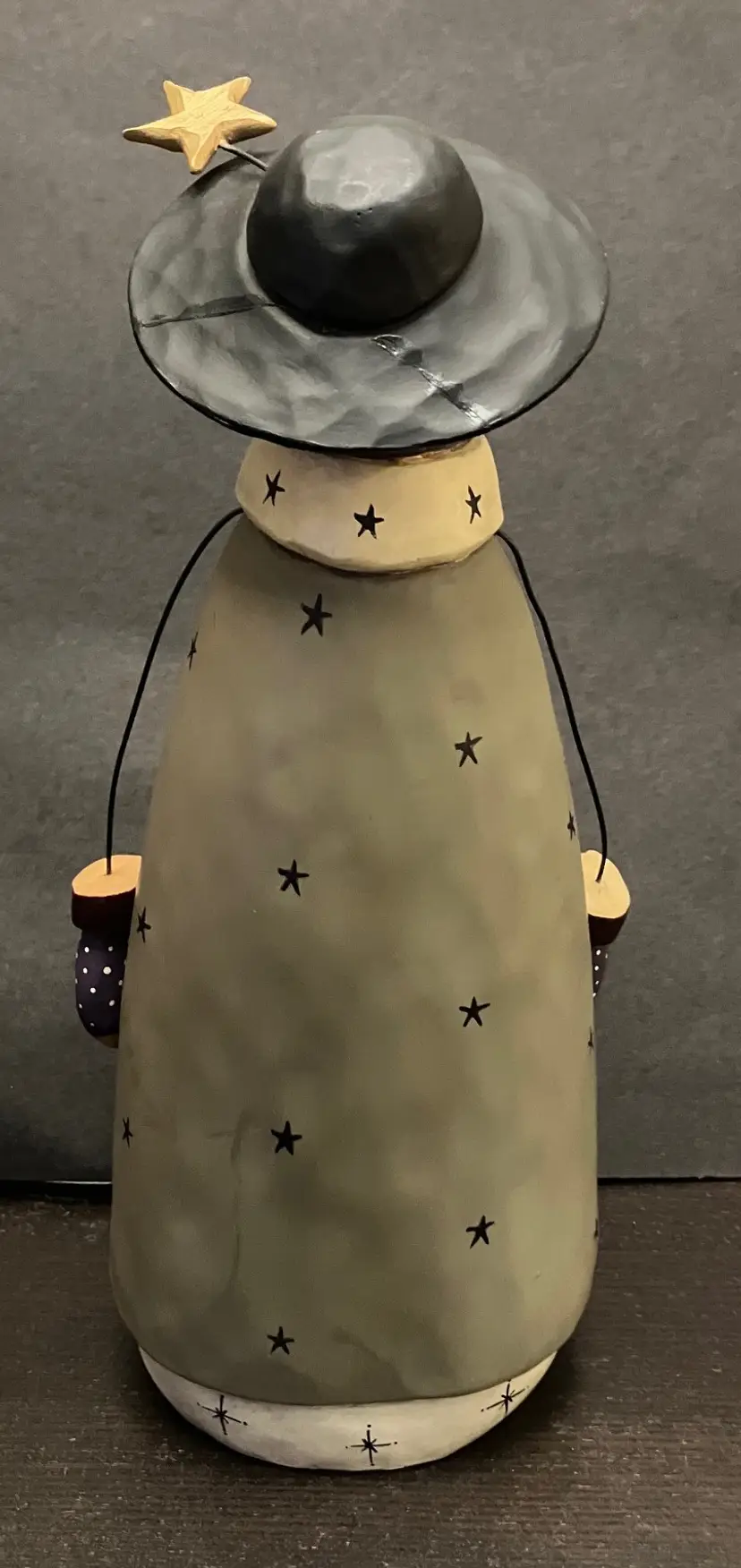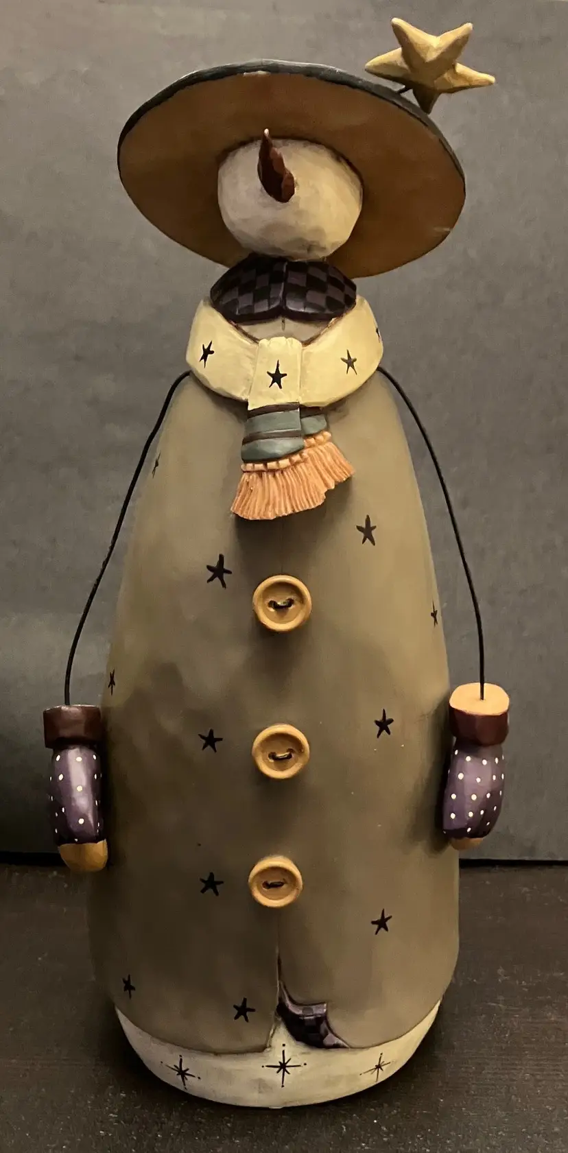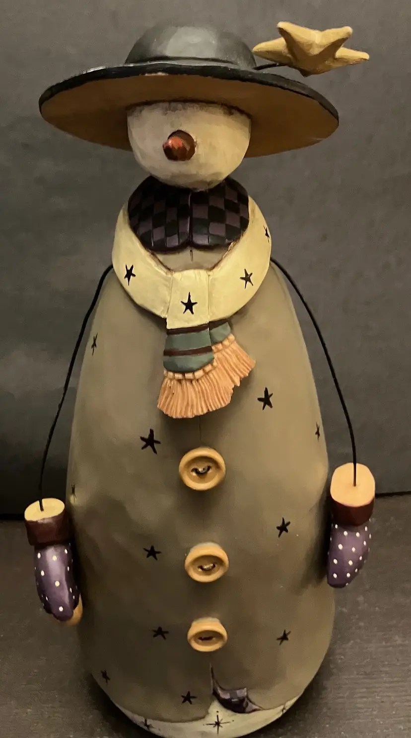 Matte-finish figurine featuring wire arms, a scarf with stars, and a hat topped with a star made in 2000. Measures approximately 10" tall, about 3" by 4". There is evidence of repair of the hat (see images) with glue and there is a little yellow missing under the hat. Weighs almost 2 lbs before packaging.