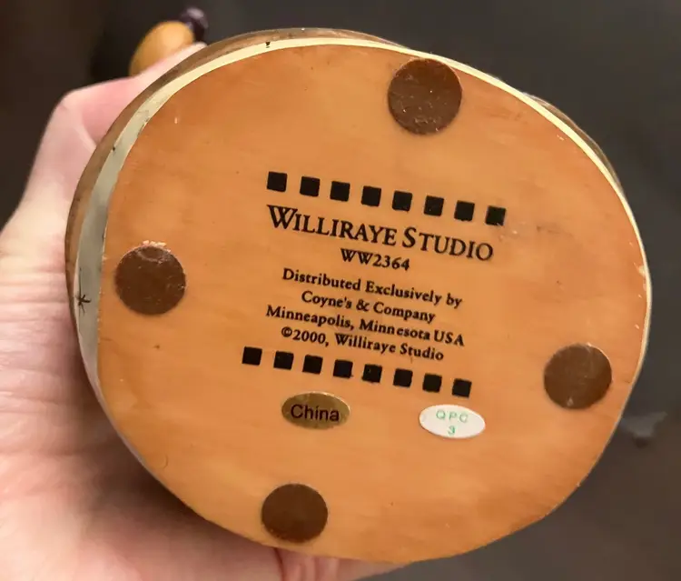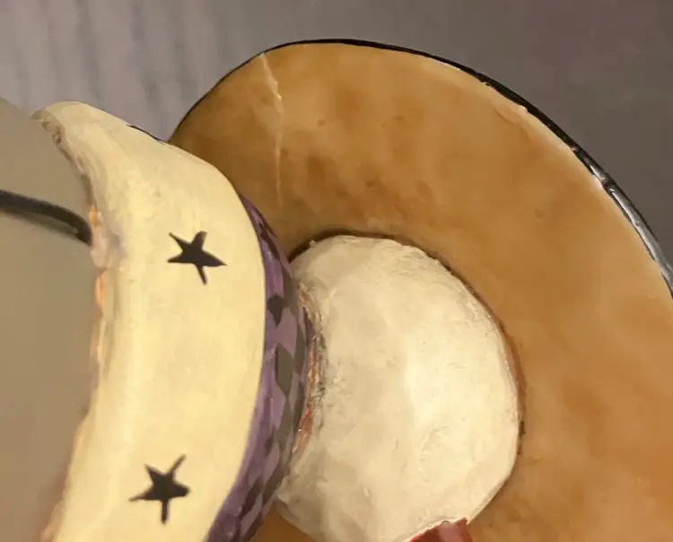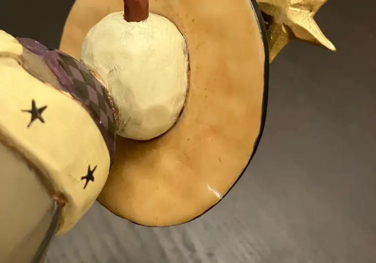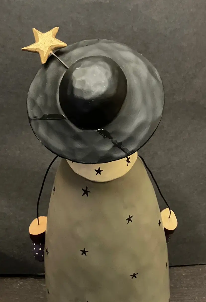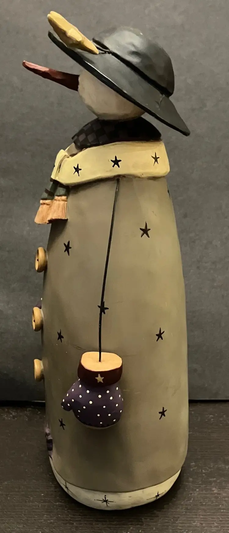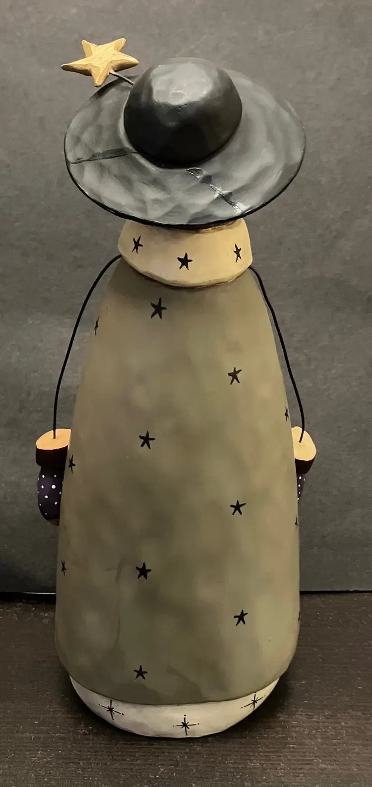 Matte-finish figurine featuring wire arms, a scarf with stars, and a hat topped with a star made in 2000. Measures approximately 10" tall, about 3" by 4". There is evidence of repair of the hat (see images) with glue and there is a little yellow missing under the hat. Weighs almost 2 lbs before packaging.