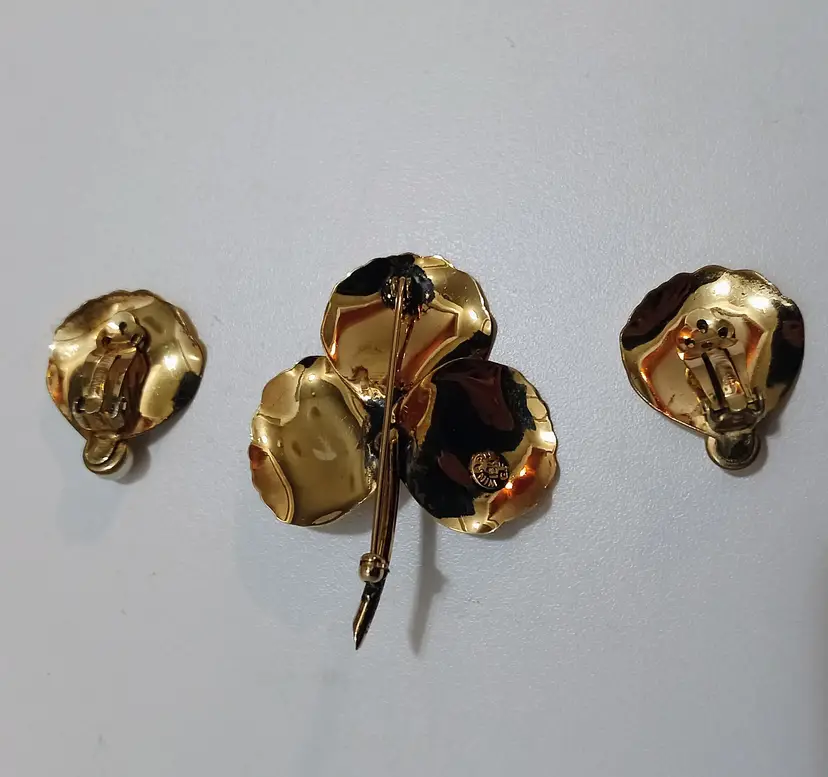 Natural Cultured Pearls Adorn This Trio Made by Winard. This Highly Collectible Coordinated Set is in Very Nice Condition; From the 1940's! Look at that Shine! And the Textured Details of Each Piece! Elegant and Stylish! Earrings are Clip On. Brooch is 1.75" x 1.50"; Earrings .50" W x .50" L; Original Winard Tag Included! All Pieces Marked Winard. Minor Oxidation on back of brooch consistent w/age.