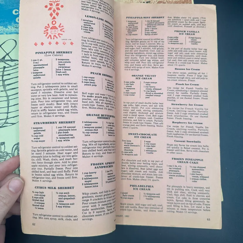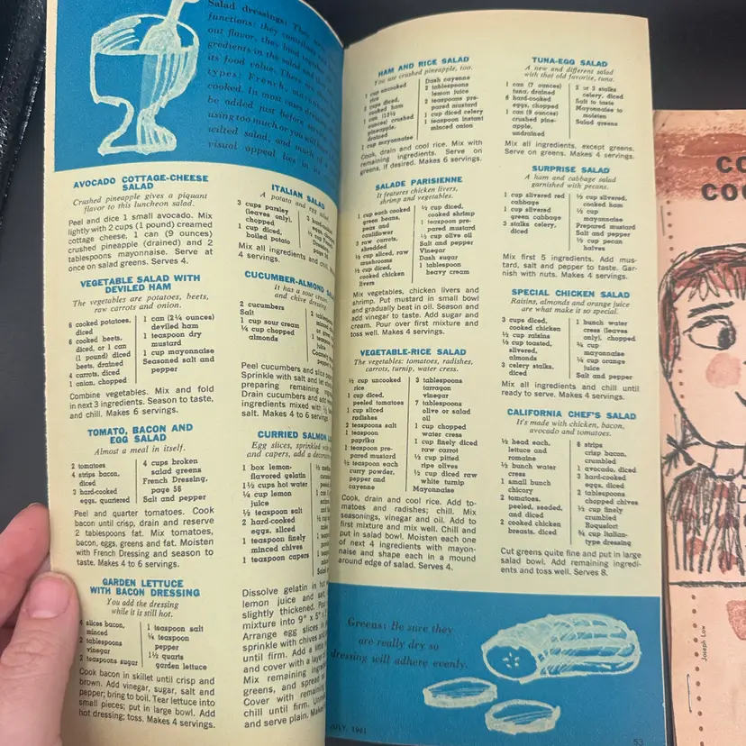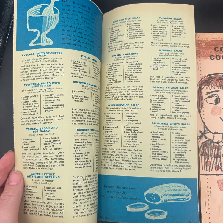 The booklets shown are #54 "Salads and Salad Dressings," #28 "Chocolate Cakes and Frostings," and #7 "Frozen Desserts." These booklets were originally issued as inserts in Woman's Day magazine during the mid-20th century. Good vintage condition.