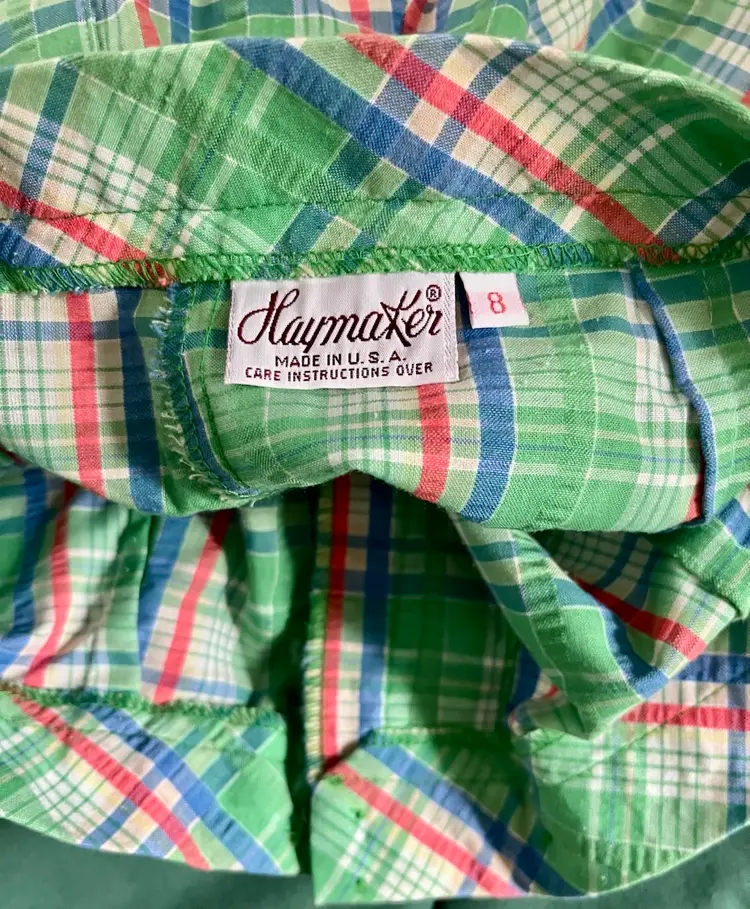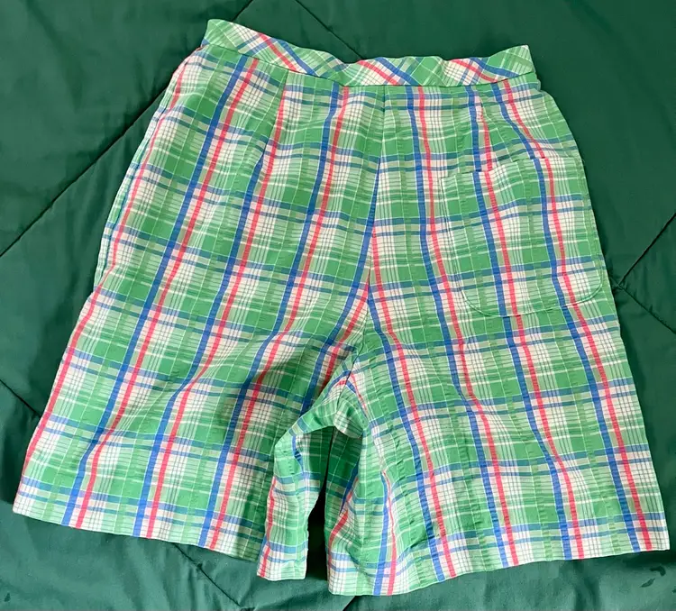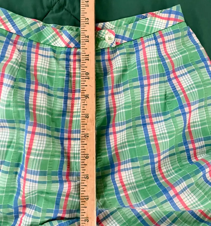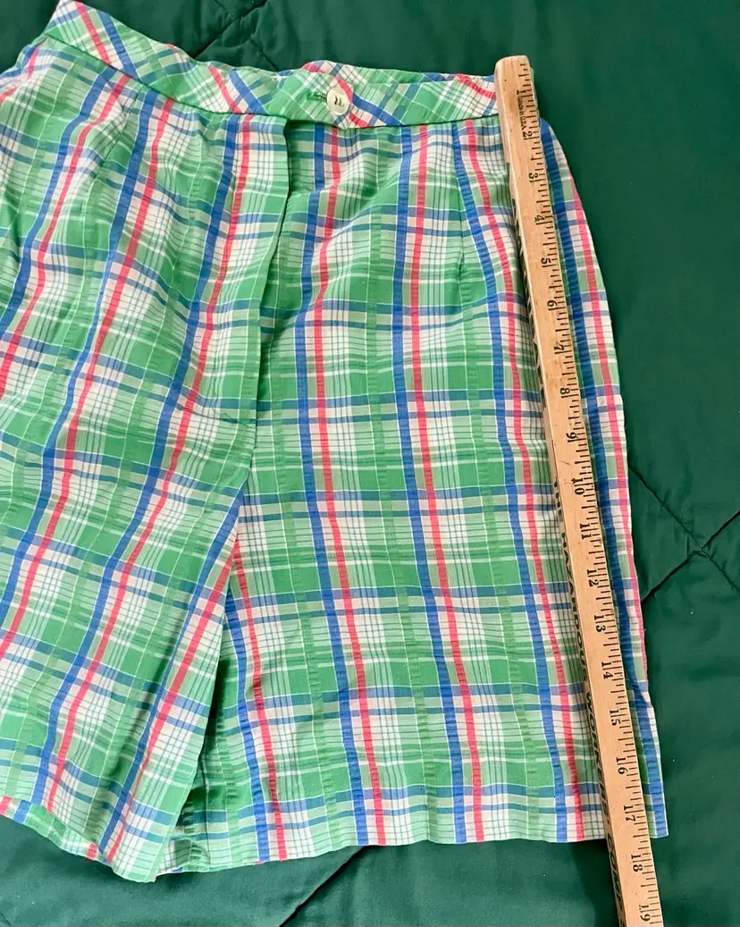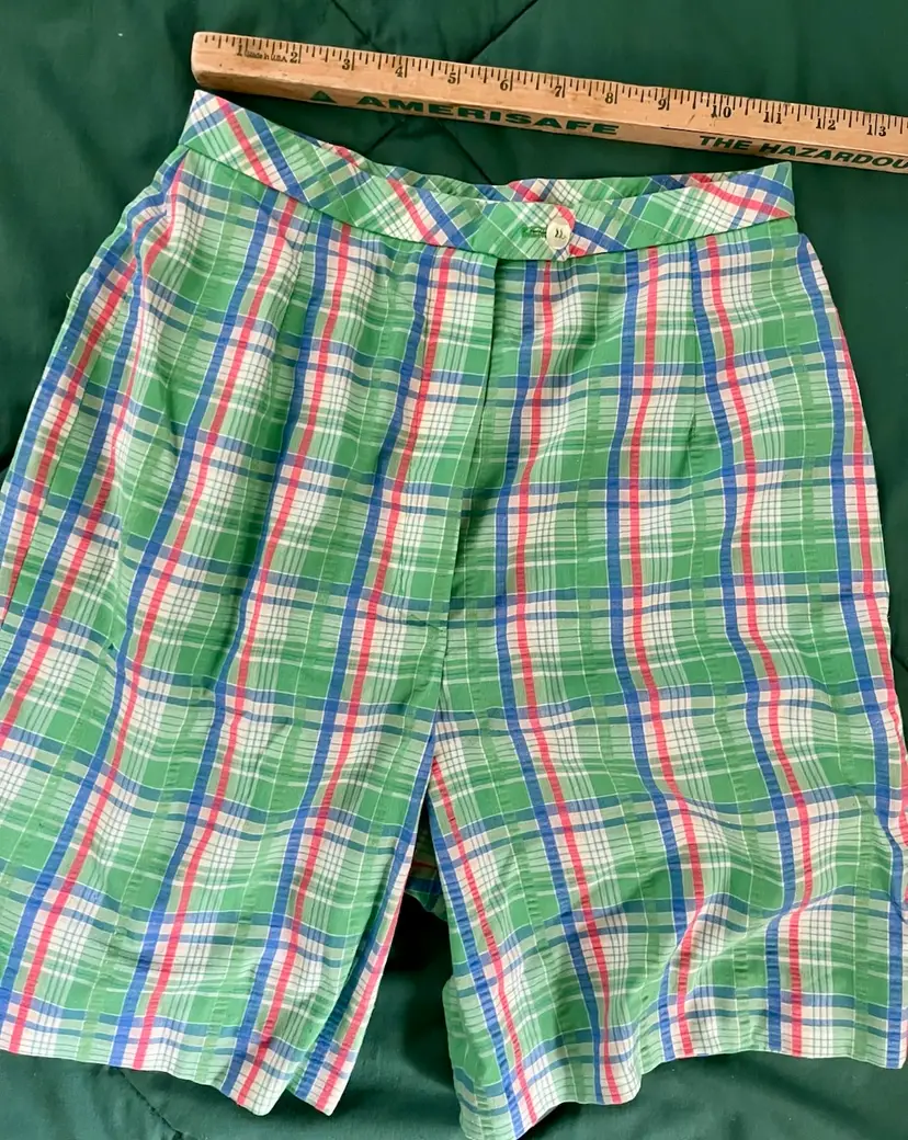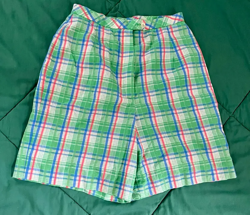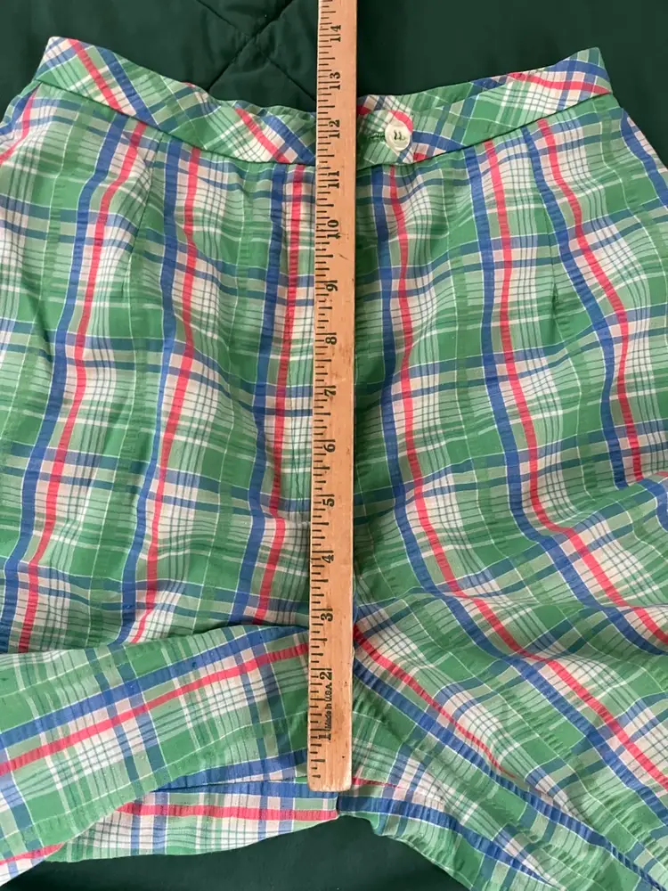 These vintage women's Haymaker shorts in size 8 (see waist photo measurements) feature a back pocket in a classic Searsucker plaid design in green, red, and blue. UNION Made from a cotton or cotton blend material, these shorts have a flat front and a 6-inch inseam, perfect for a casual occasion with a preppy or tennis-inspired look. The original piece from the late 1970s to early 1980s exudes a true vintage flair and is a stylish addition to any wardrobe.