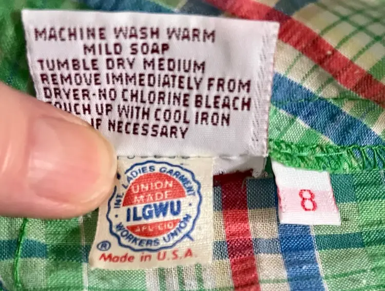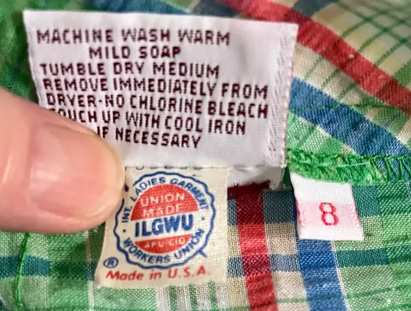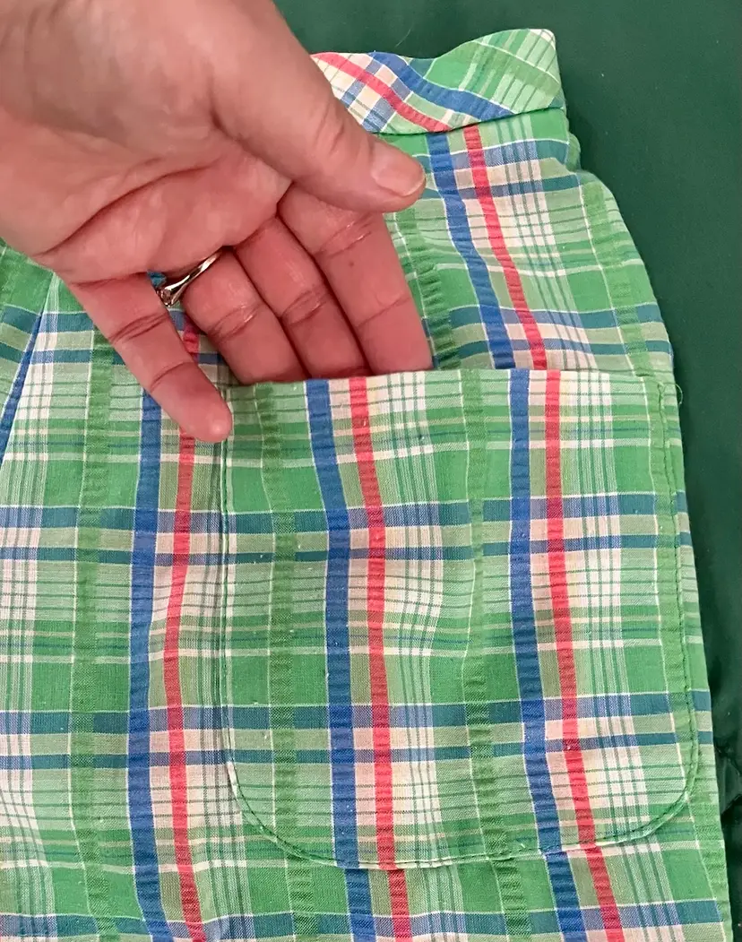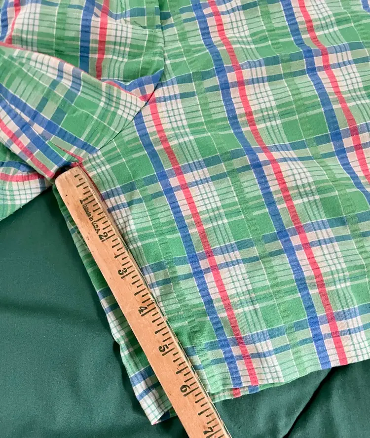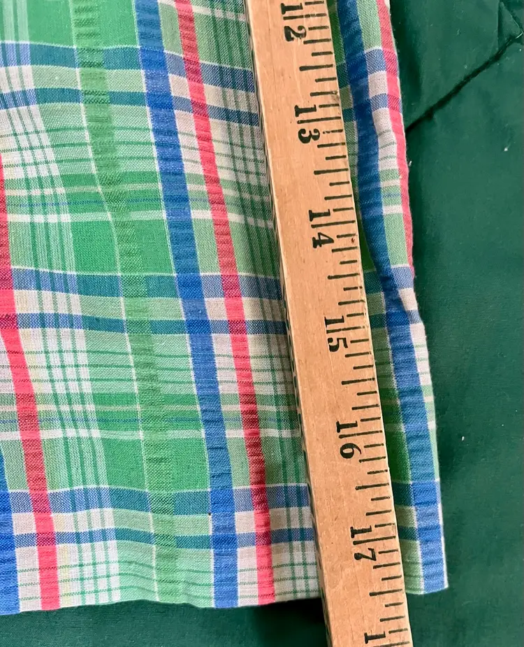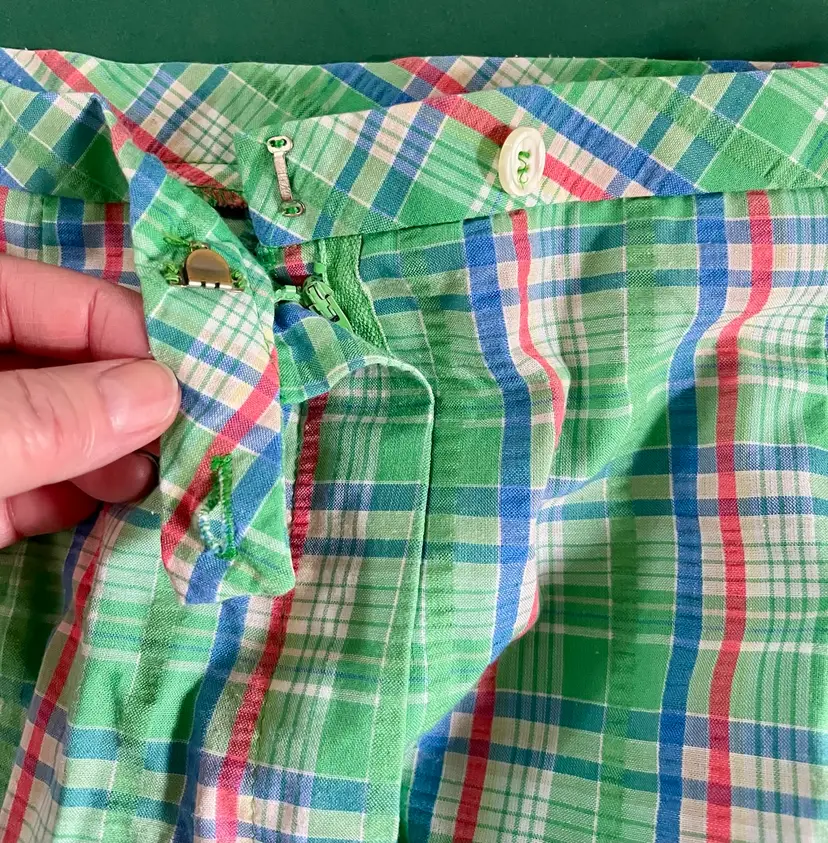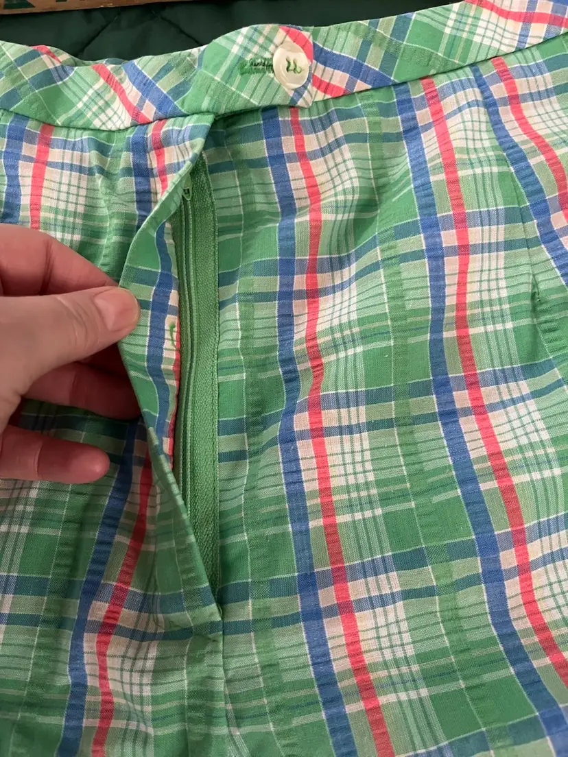 These vintage women's Haymaker shorts in size 8 (see waist photo measurements) feature a back pocket in a classic Searsucker plaid design in green, red, and blue. UNION Made from a cotton or cotton blend material, these shorts have a flat front and a 6-inch inseam, perfect for a casual occasion with a preppy or tennis-inspired look. The original piece from the late 1970s to early 1980s exudes a true vintage flair and is a stylish addition to any wardrobe.