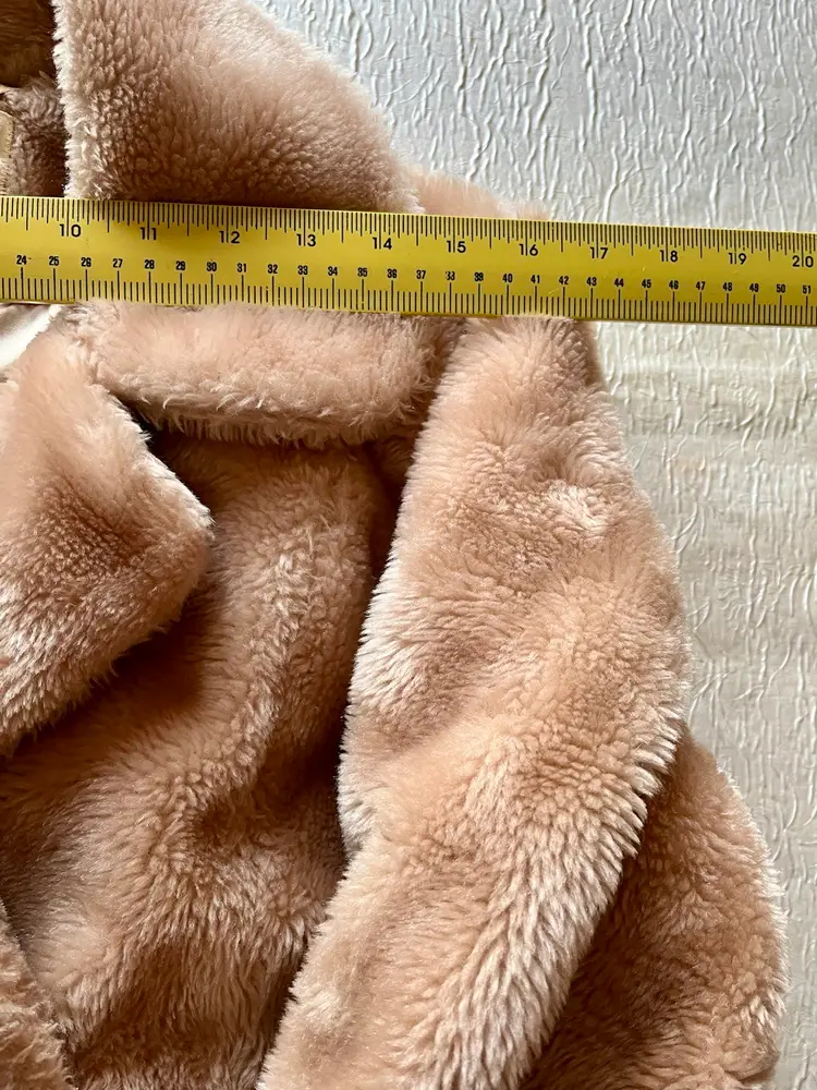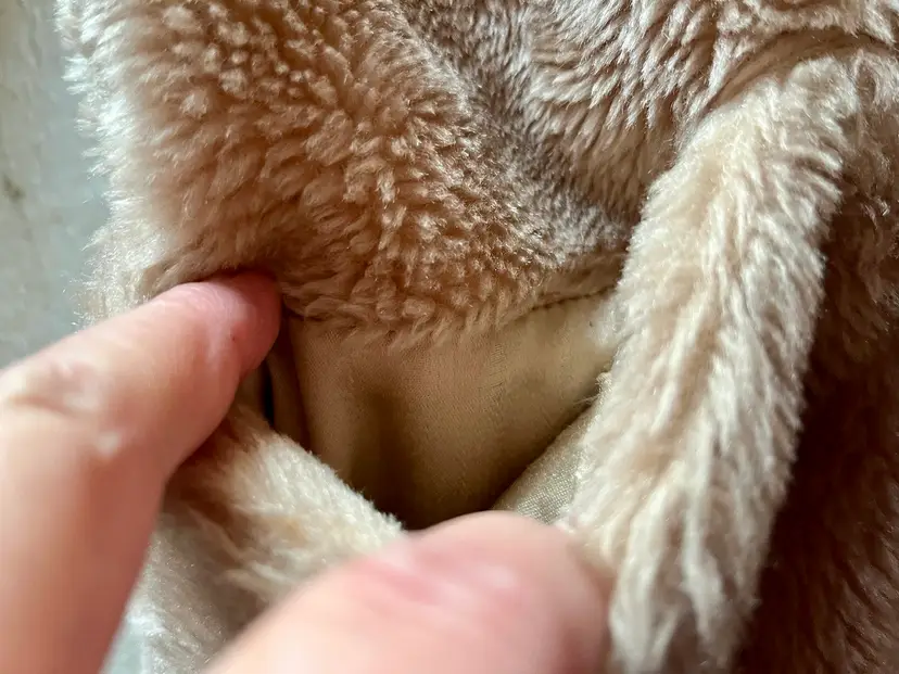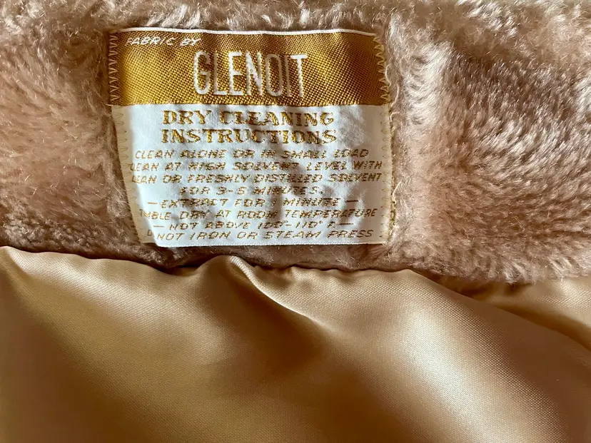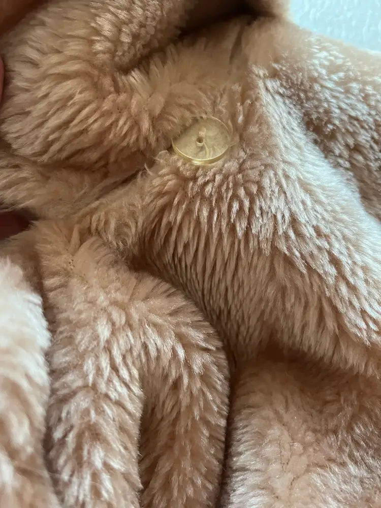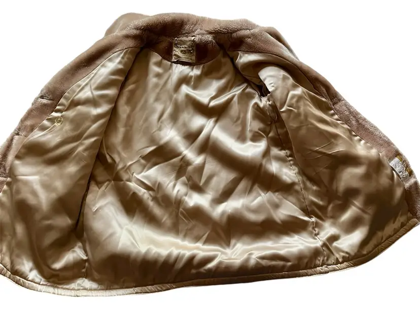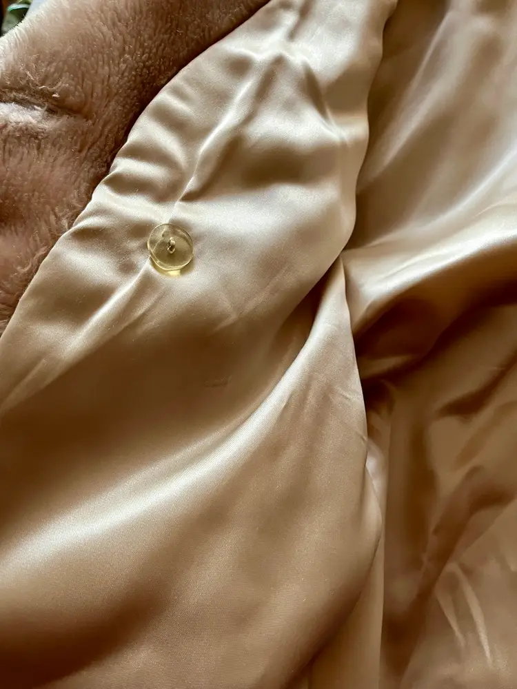 The beige-champagne color of the coat is versatile and can be paired with a variety of outfits. The full lining material is possibly polyester or acetate (satin-like) and adds a touch of luxury to the coat. This coat is a size small/medium and has a regular fit. It is recommended to dry clean only to maintain its quality. There are two front lined pockets as well.