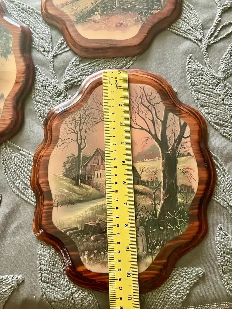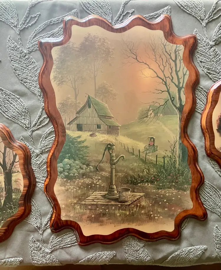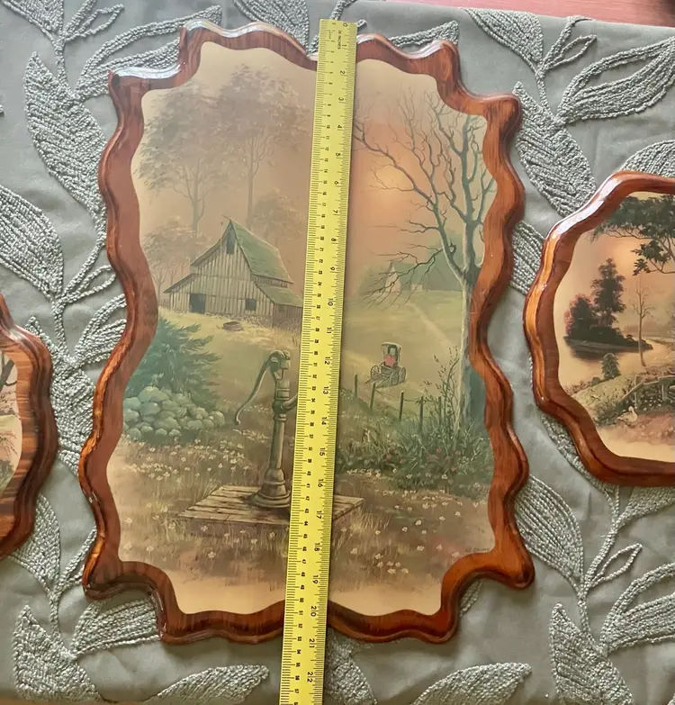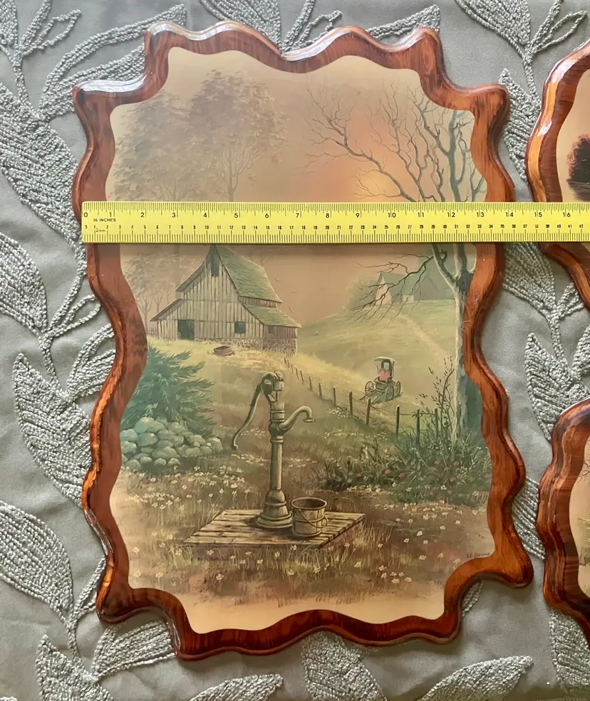 Add a touch of rustic charm to your home decor with this vintage wood wall art set. Featuring a beautiful wildflower field, a rural farmhouse, and a hand pump, stone fence/wall, river, mailbox these shellacked wall plaques art by A. Bruno are perfect for any room. Made of sturdy wood with hangers, these pieces have a multicolor muted design and measure as shown in the photos.