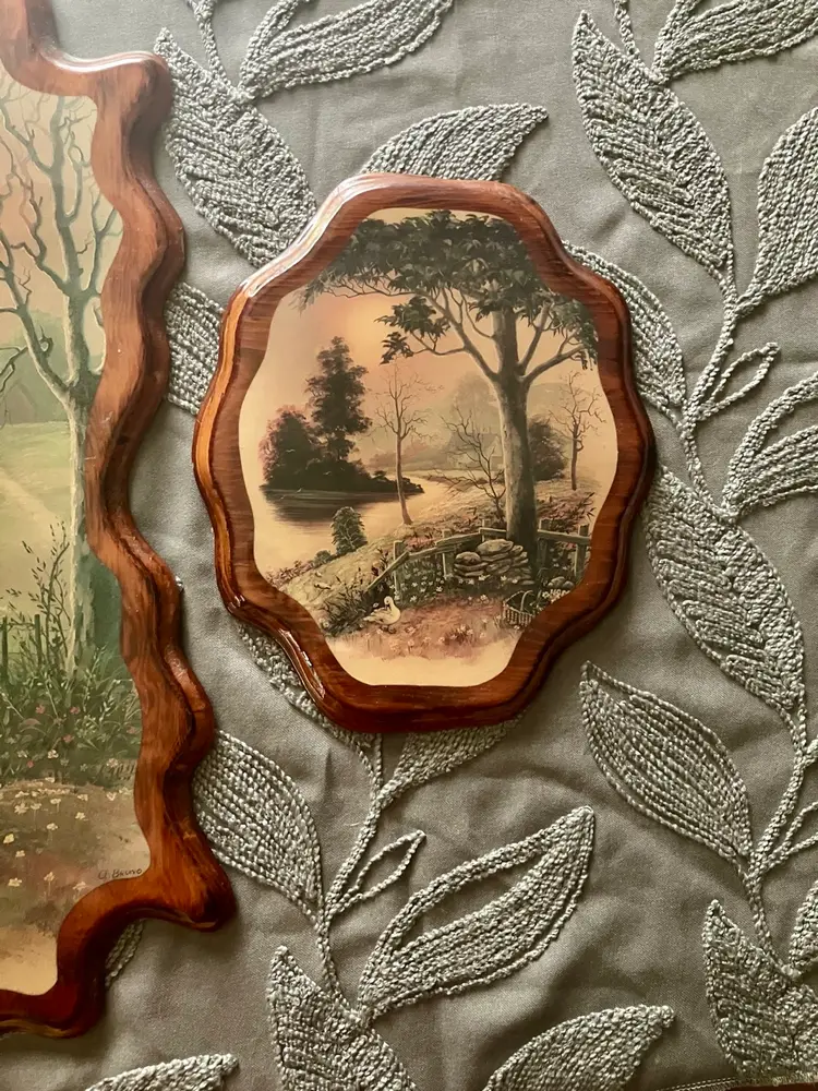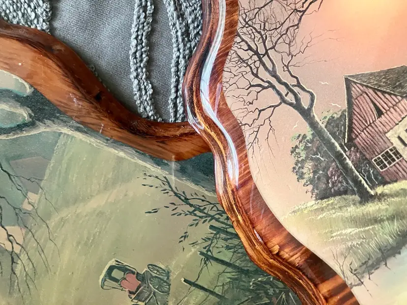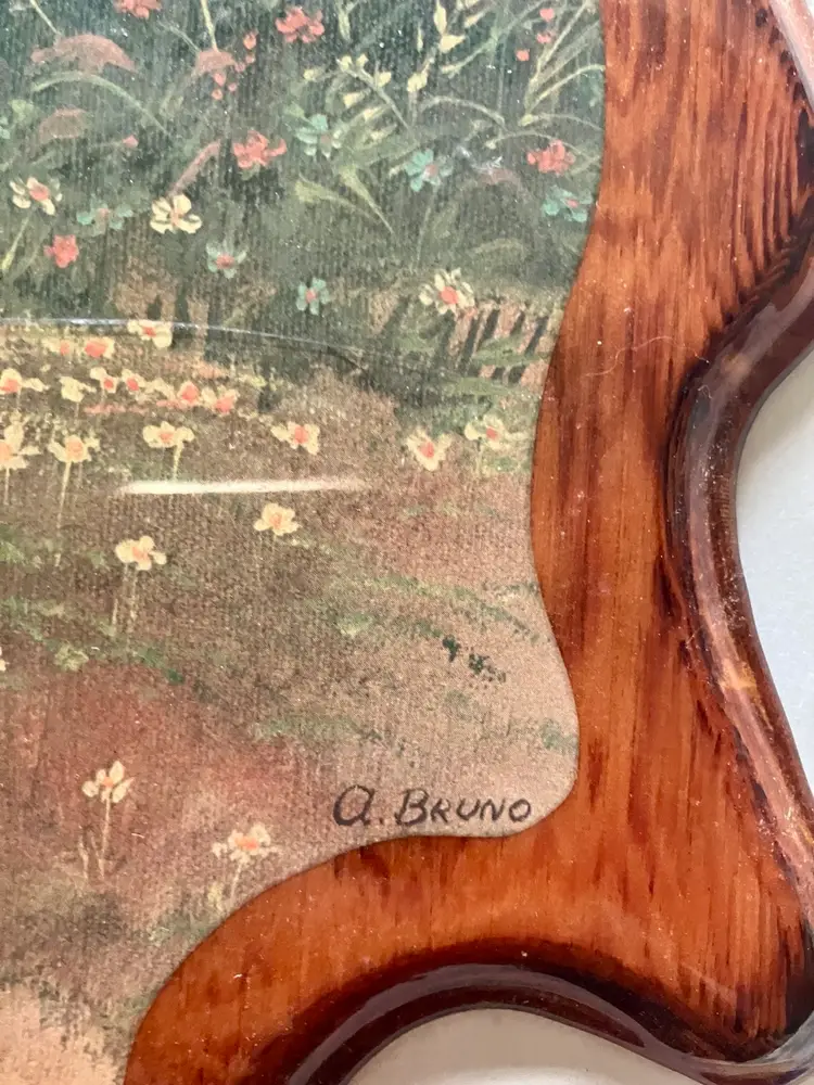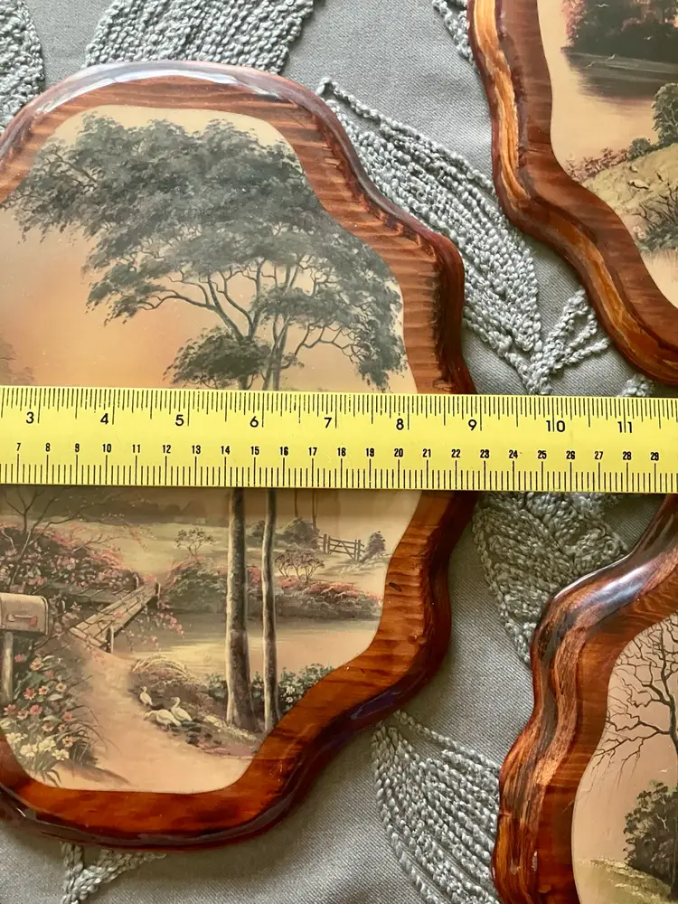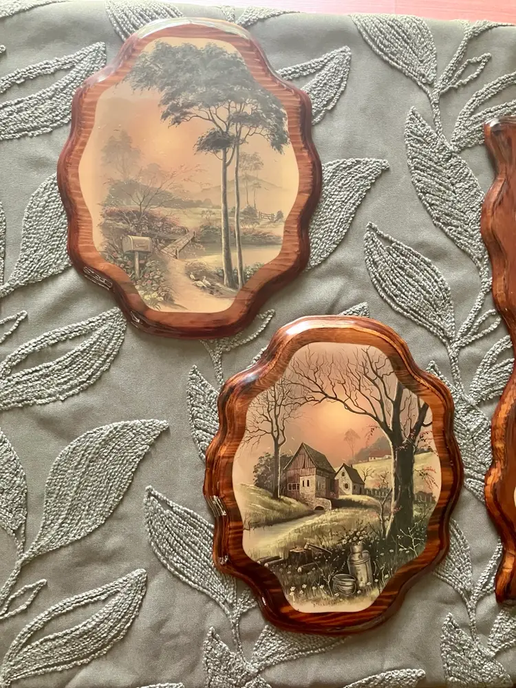 Add a touch of rustic charm to your home decor with this vintage wood wall art set. Featuring a beautiful wildflower field, a rural farmhouse, and a hand pump, stone fence/wall, river, mailbox these shellacked wall plaques art by A. Bruno are perfect for any room. Made of sturdy wood with hangers, these pieces have a multicolor muted design and measure as shown in the photos.