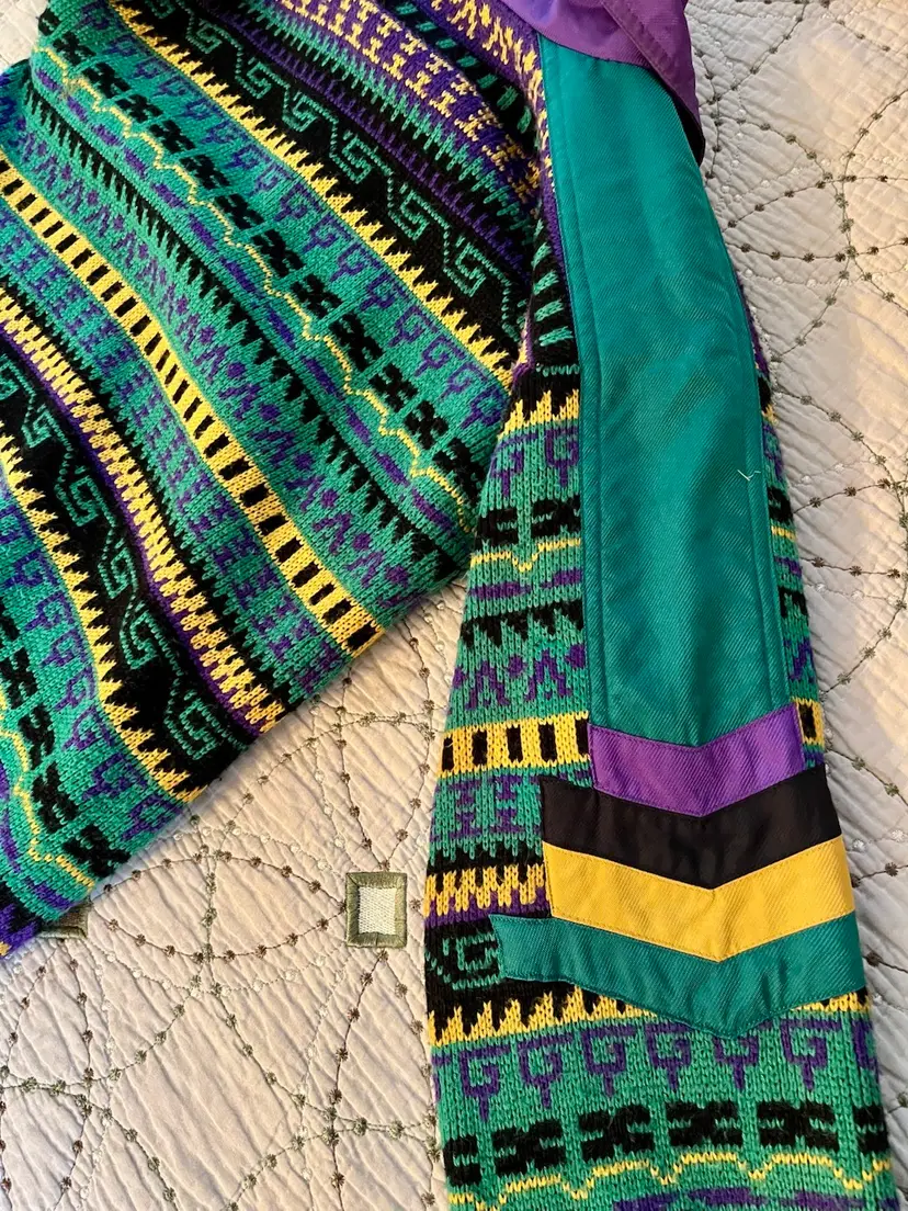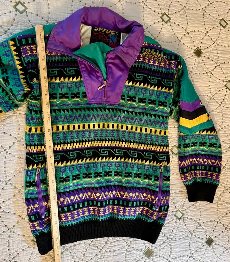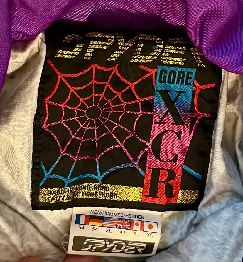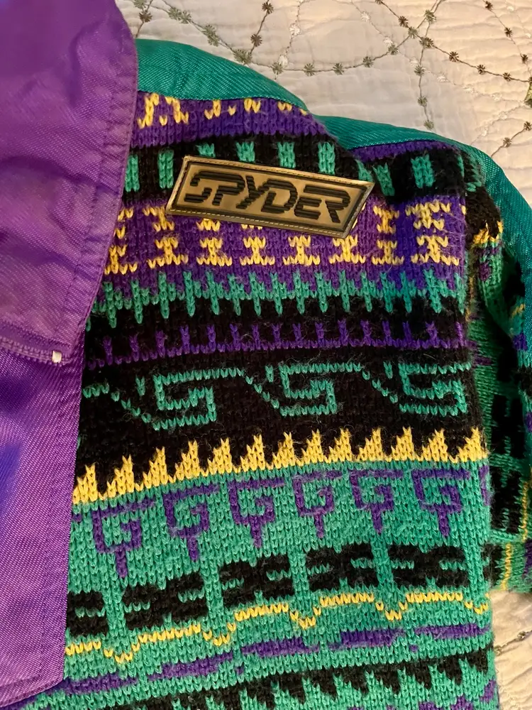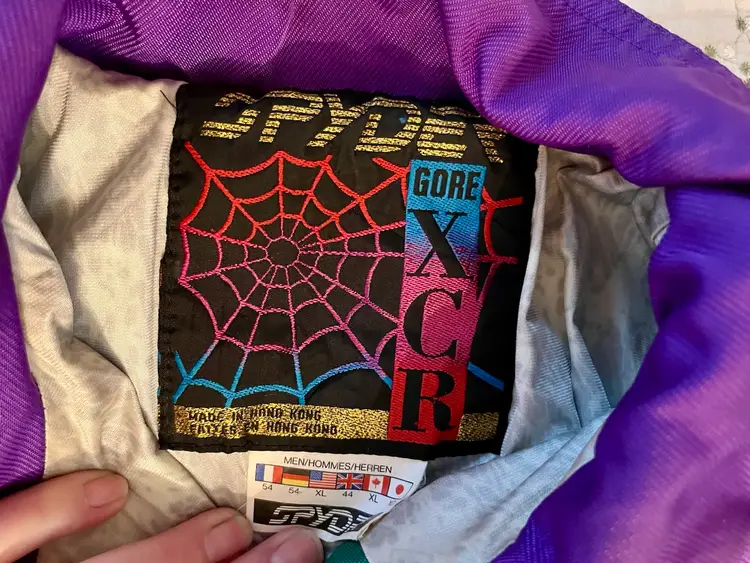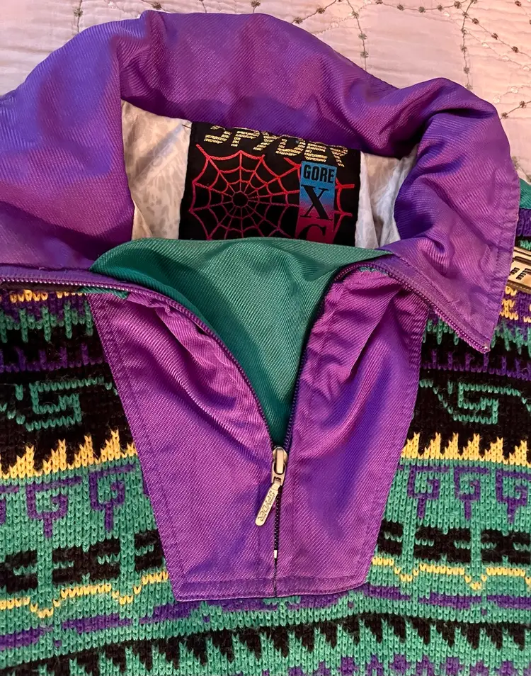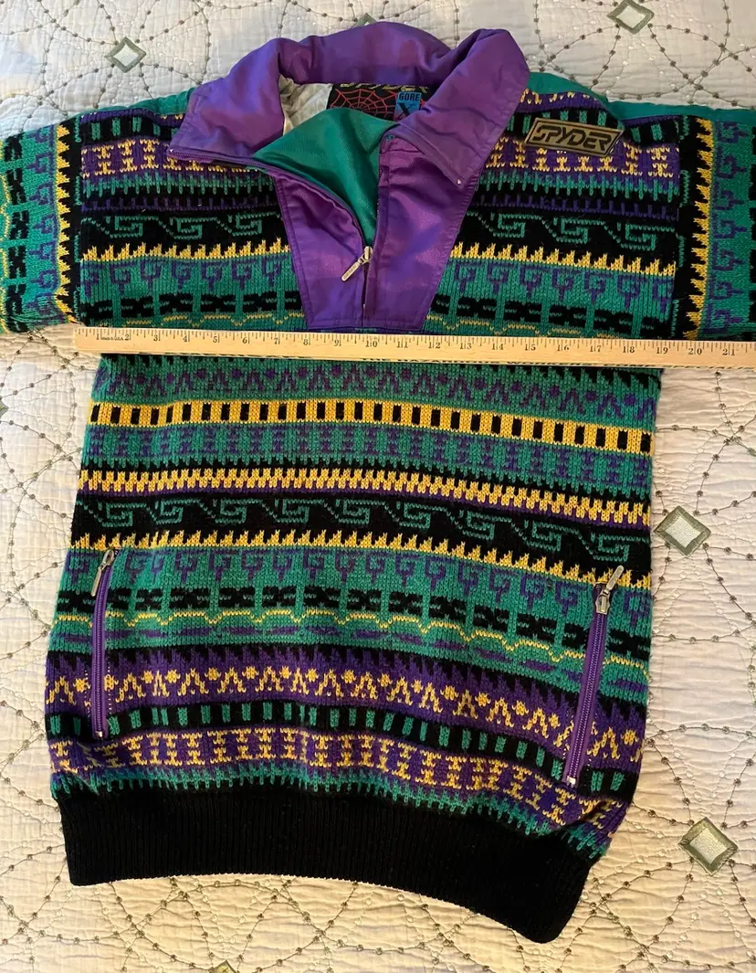 This vintage XL Spyder Gore-Tex XCR ski snow sweater is a 1/4 zip pullover designed for winter sports enthusiasts. Made with an exterior tight-knit of 30% wool and 70% acrylic, it features a full lining of 100% nylon for added warmth and wind protection. The multicolor design of green, purple, black and yellow adds the retro look of the 1990s to this functional and practical piece. With features like two front side slash zip pockets and a wind shield lining, this sweater is perfect for outdoor activities like skiing, cross-country, and snow shoeing. Made in Hong Kong by the brand Spyder, this sweater is a must-have for any winter adventure.