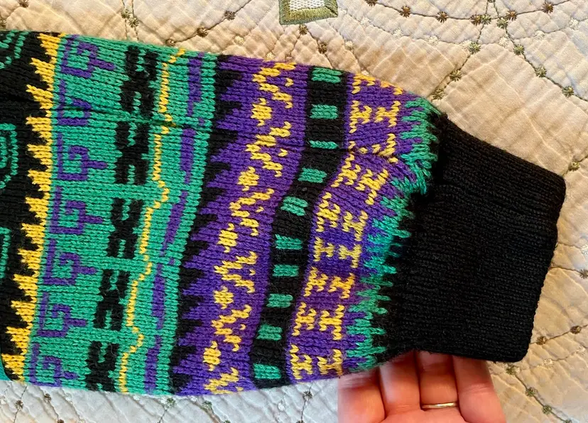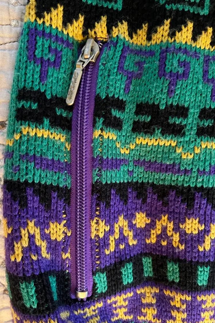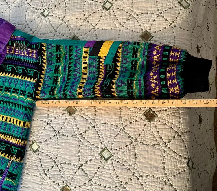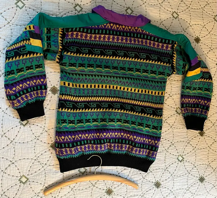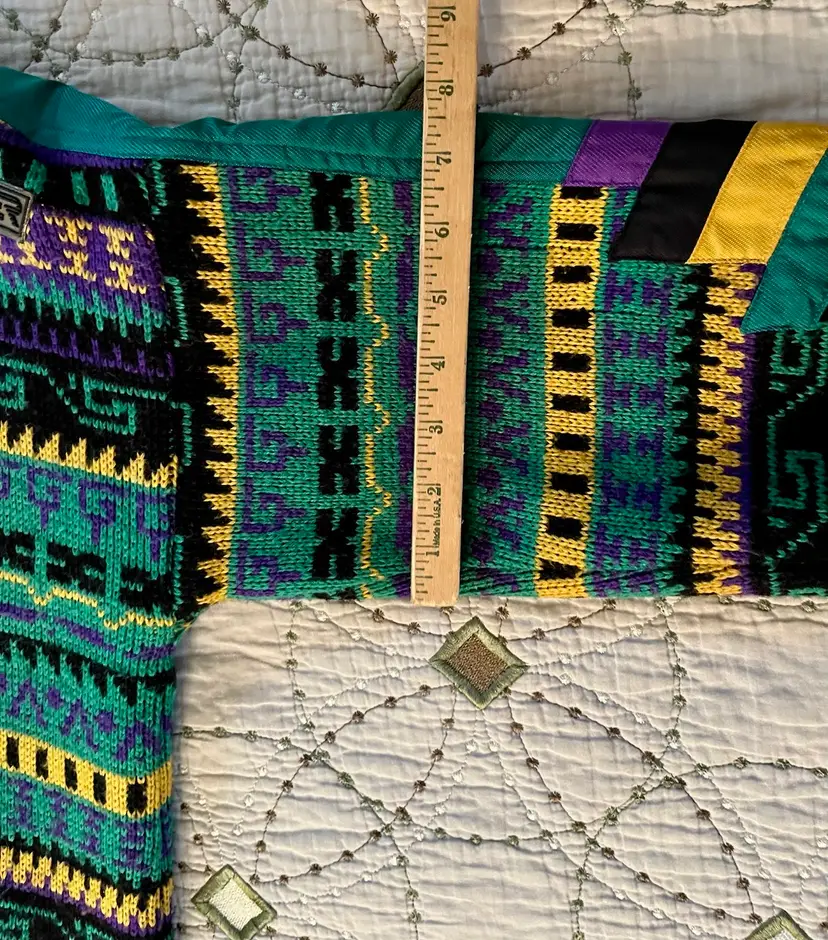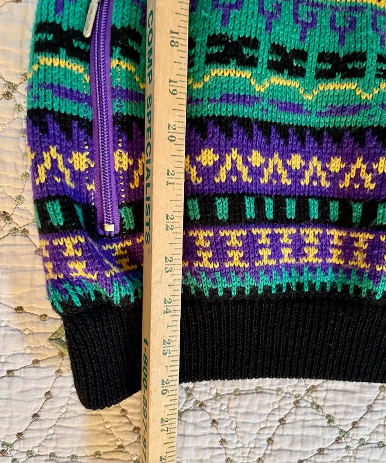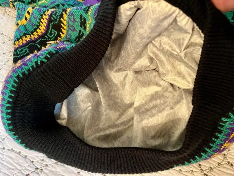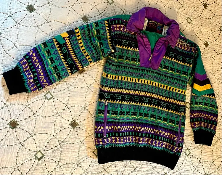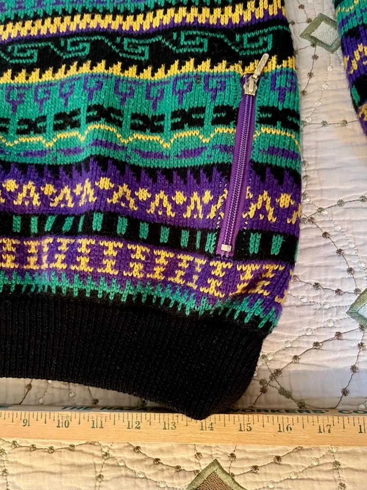 This vintage XL Spyder Gore-Tex XCR ski snow sweater is a 1/4 zip pullover designed for winter sports enthusiasts. Made with an exterior tight-knit of 30% wool and 70% acrylic, it features a full lining of 100% nylon for added warmth and wind protection. The multicolor design of green, purple, black and yellow adds the retro look of the 1990s to this functional and practical piece. With features like two front side slash zip pockets and a wind shield lining, this sweater is perfect for outdoor activities like skiing, cross-country, and snow shoeing. Made in Hong Kong by the brand Spyder, this sweater is a must-have for any winter adventure.