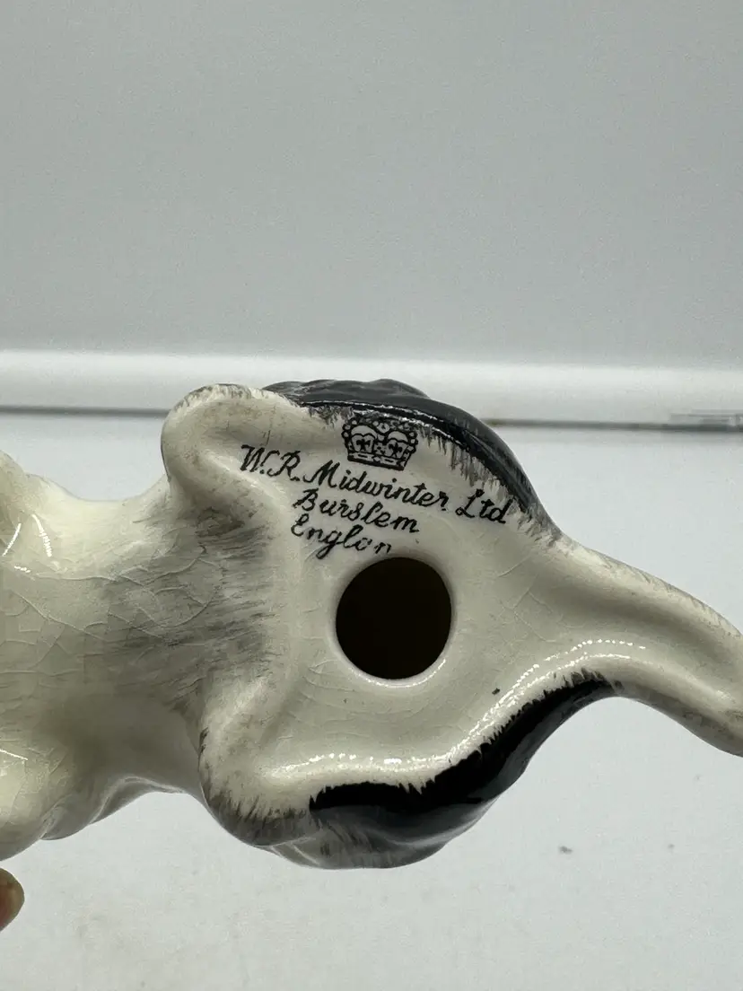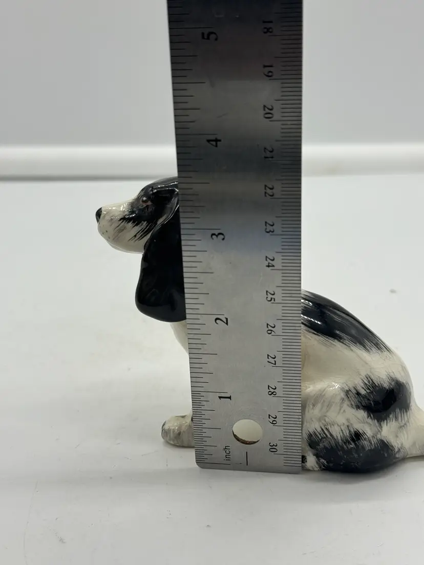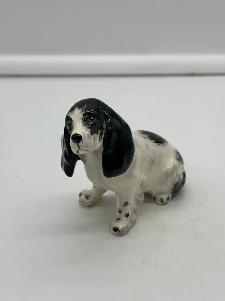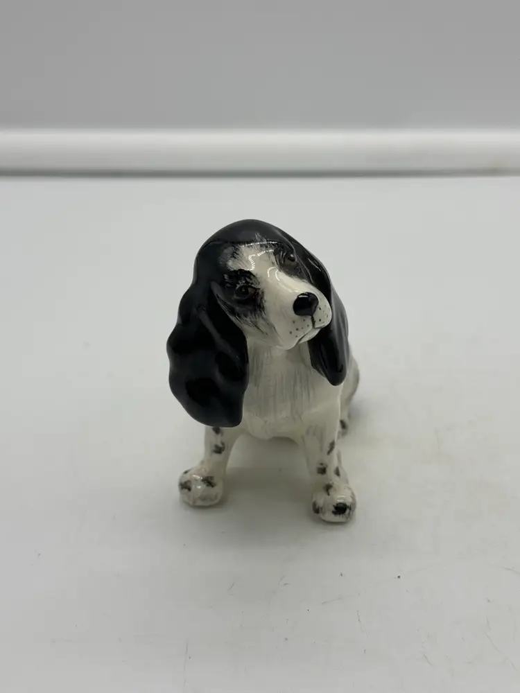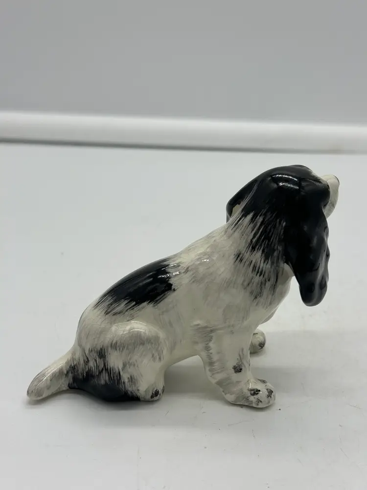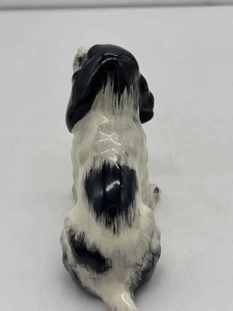 Made in Burslem England. Cocker or Brittany spaniel. Black and white. Sweet head tilt pose. No chips or cracks but some crazing due to age.