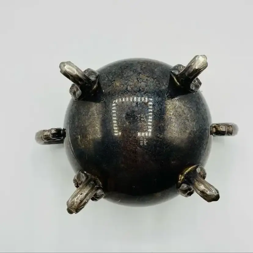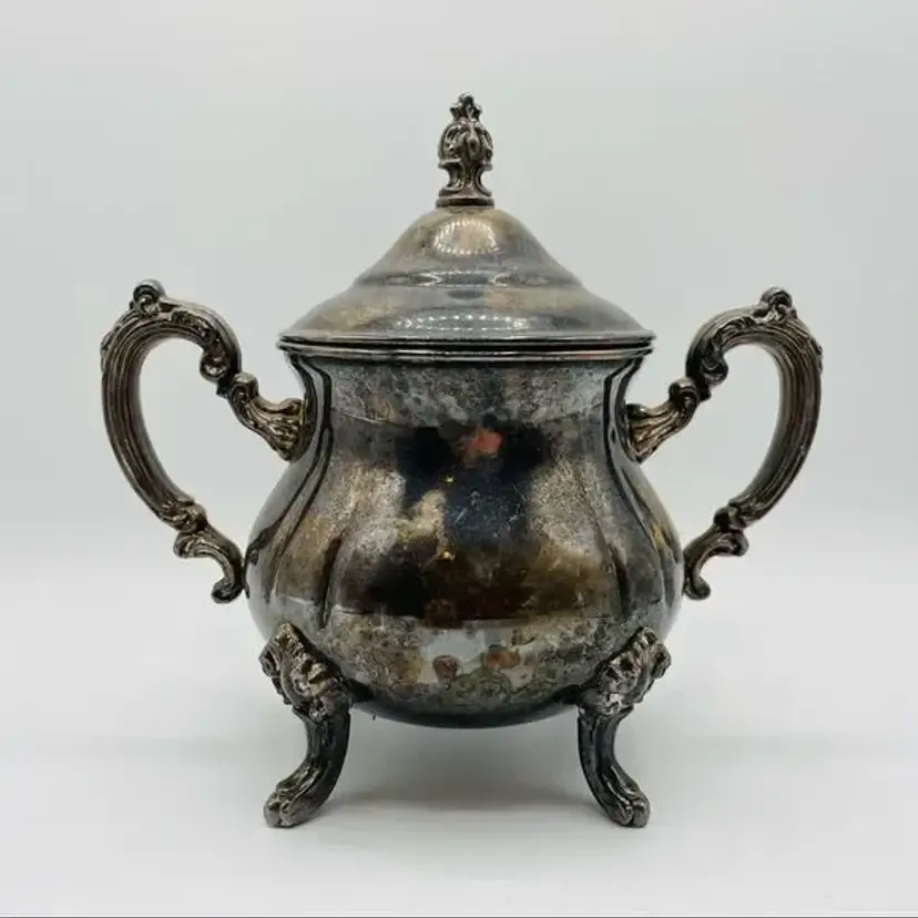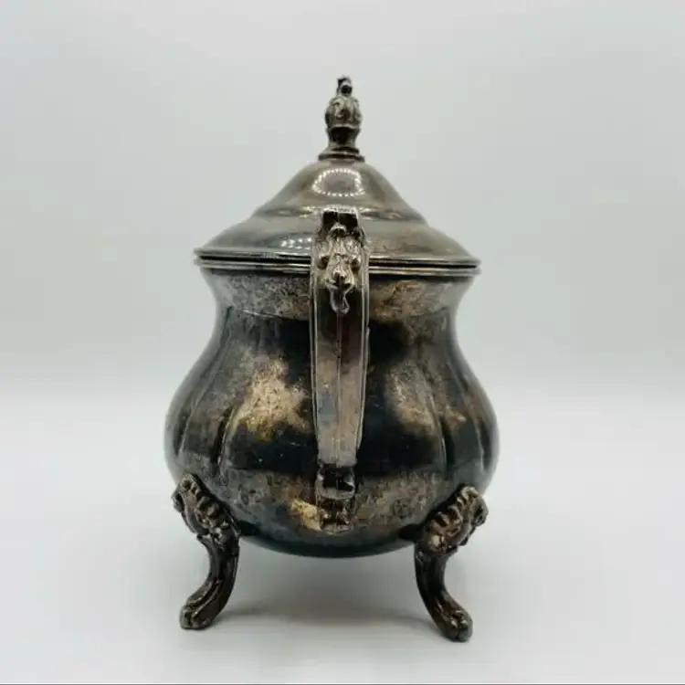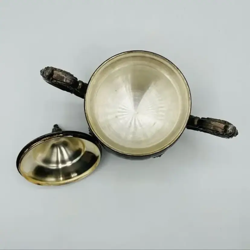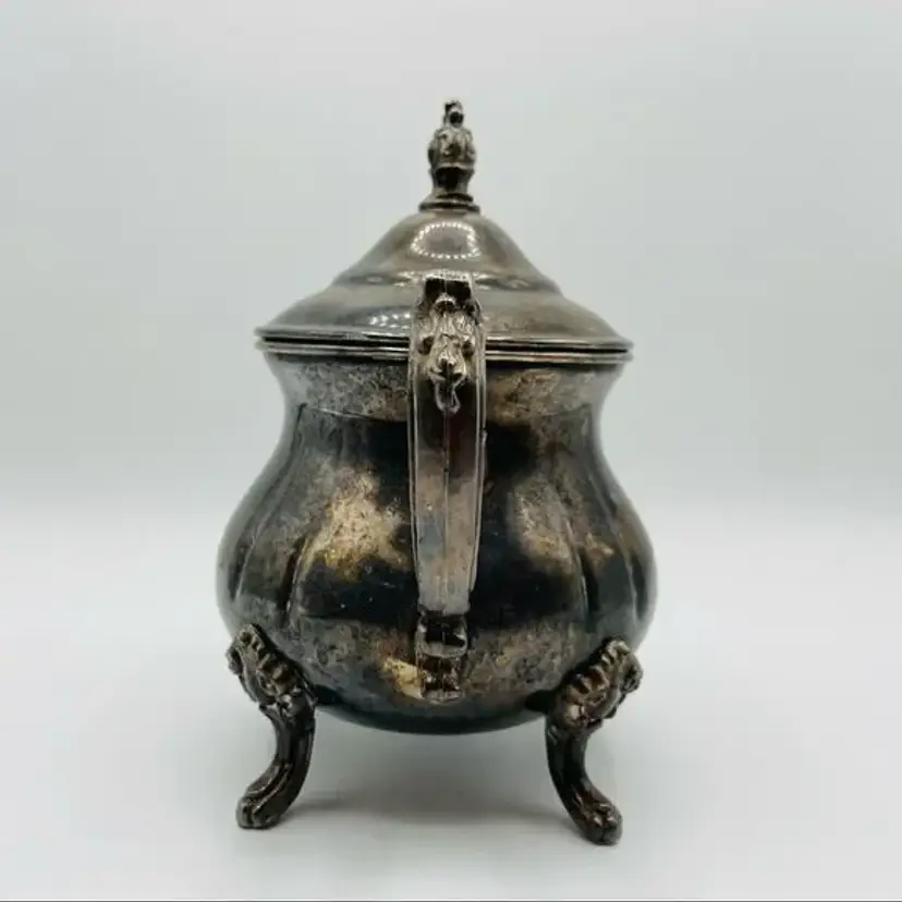 This amazing vintage sugar bowl is in excellent condition. It is tarnished, but it can easily be polished… I just choose to leave it in case the one who buys it wants it that way. The sugar bowl has little feet and the lid has a little decorative handle. It’s approximately 7” tall including the feet and lid.