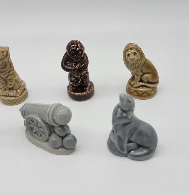 These are the Circus Animal Series Wade Whimsies figurines: Sitting Elephant, Standing Elephant, Male Monkey, Female Monkey, Seal, Poodle, Lion, Bear, Tiger, Horse, Human Cannonball, Strongman, Ringmaster, Clown with Bucket and Clown with Pie. These were produced from 1994-1999.