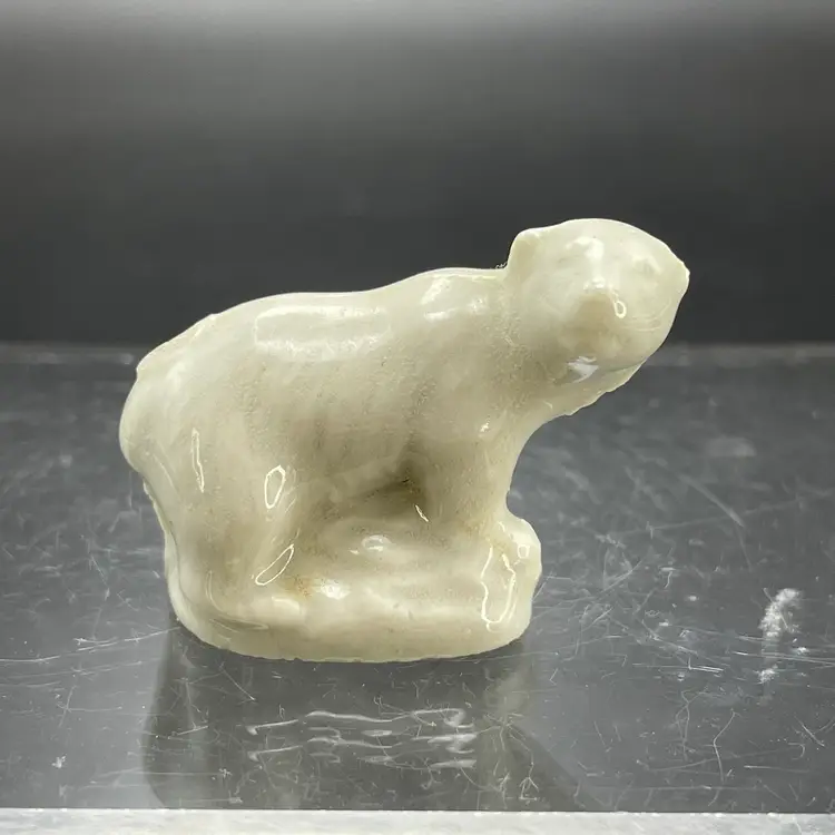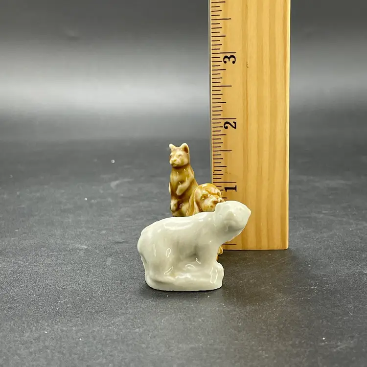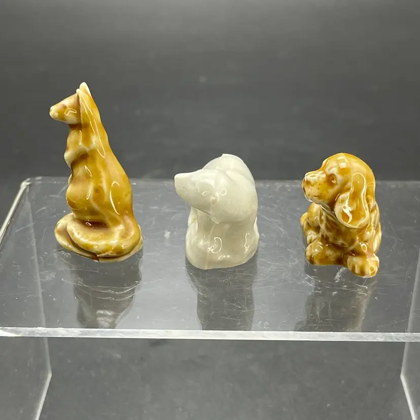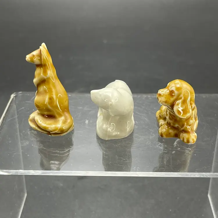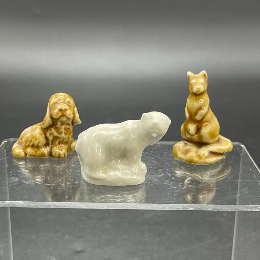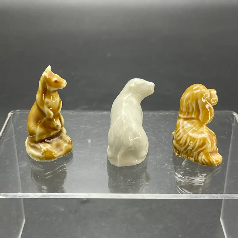 This is a vintage lot of 3 Wade Whimsies porcelain figurines. The lot includes a dog, a polar bear, and a kangaroo. Made in England. Each measure approximately 1.5" tall. The bear has what appears to be a dab of glue or extra porcelain on its back as shown in pictures. No other major flaws.