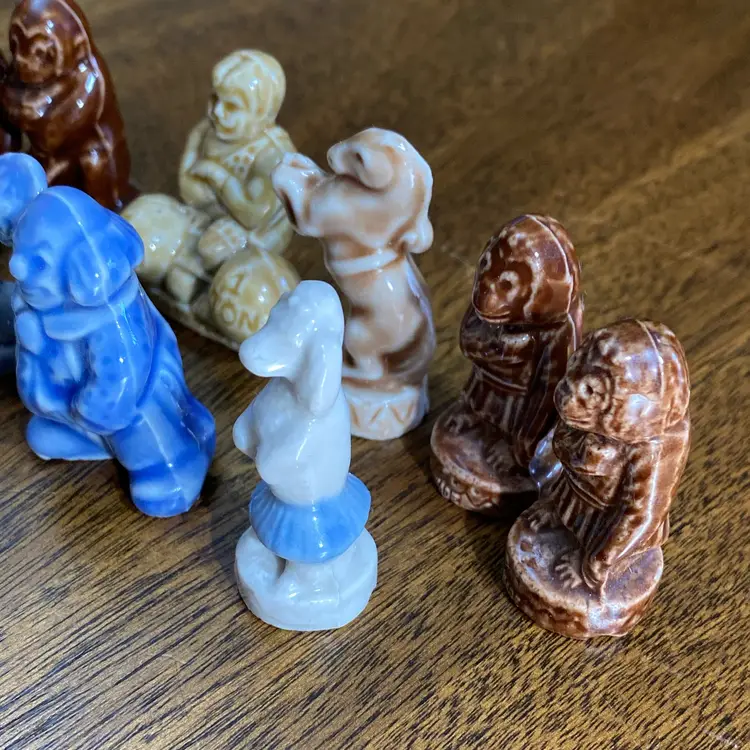 1 poodle, 1 clown, 1 cannon, 4 monkeys, 1 Horse, 1 Strong Man.