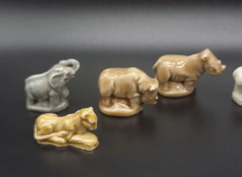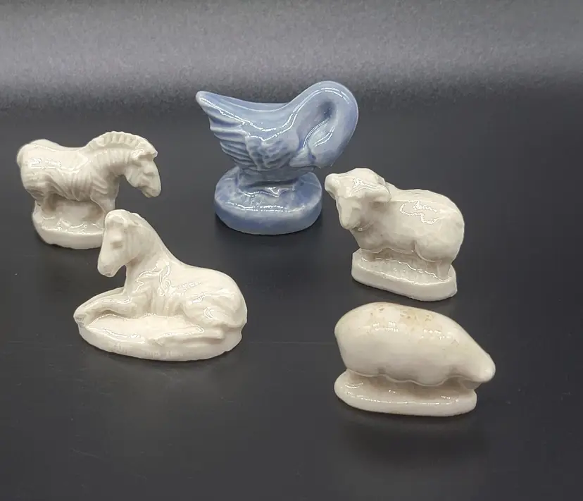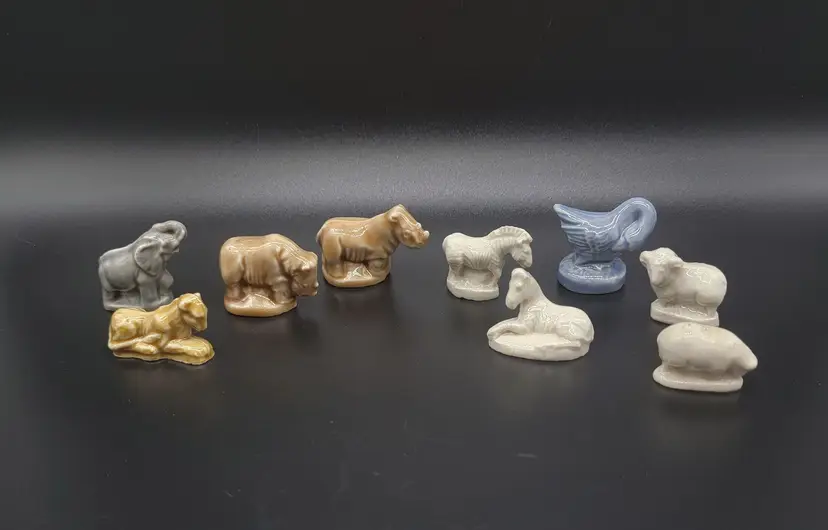 These are Wade Whimsies Noah's Ark series figurines: elephant, ewe, ram, zebra, goose, lioness. These were produced from 2002-2007.