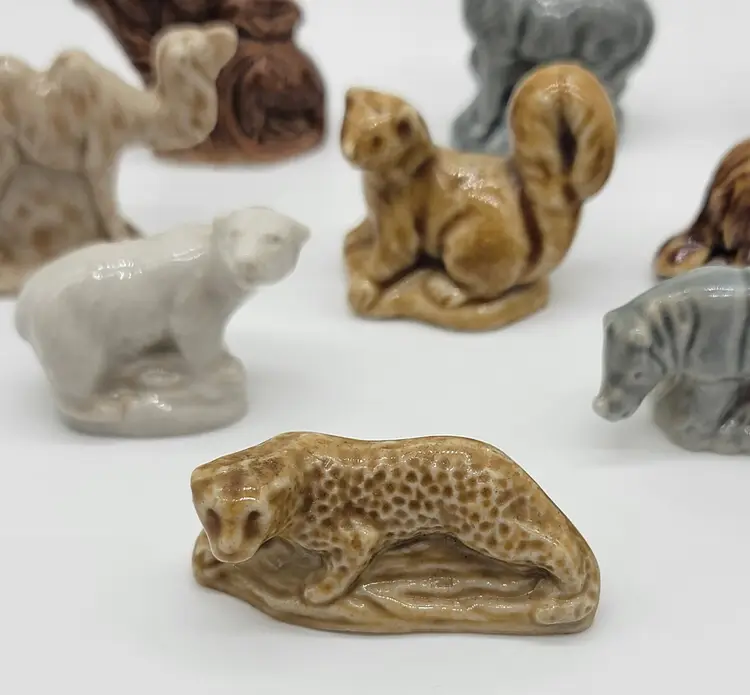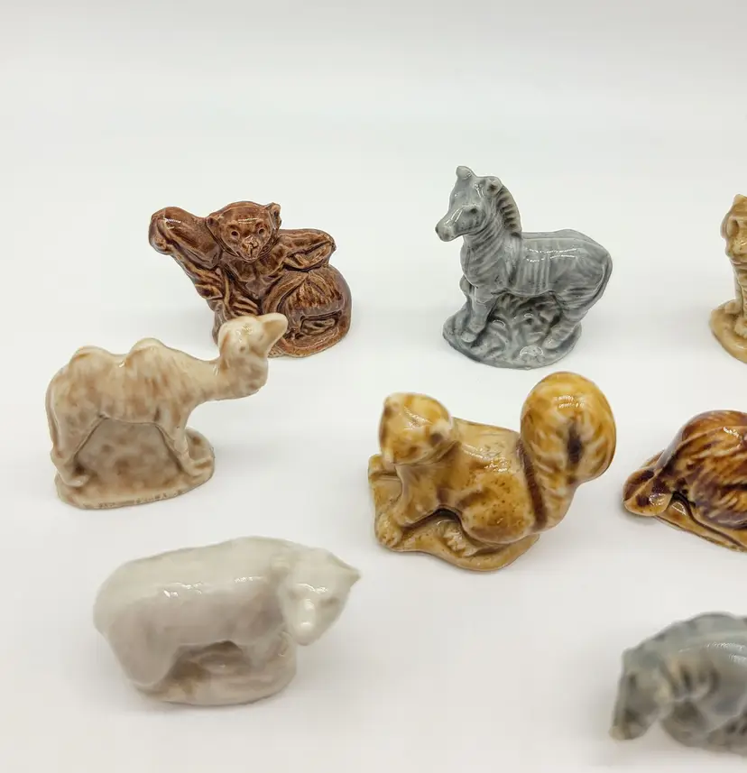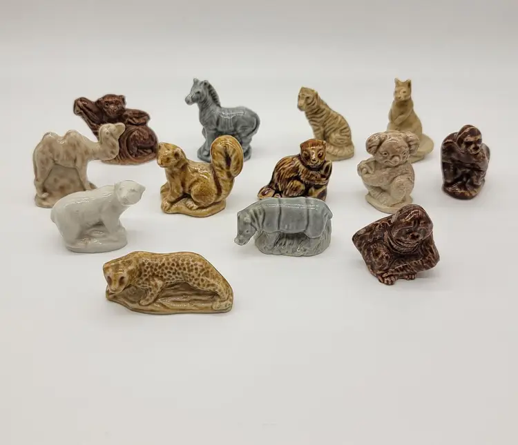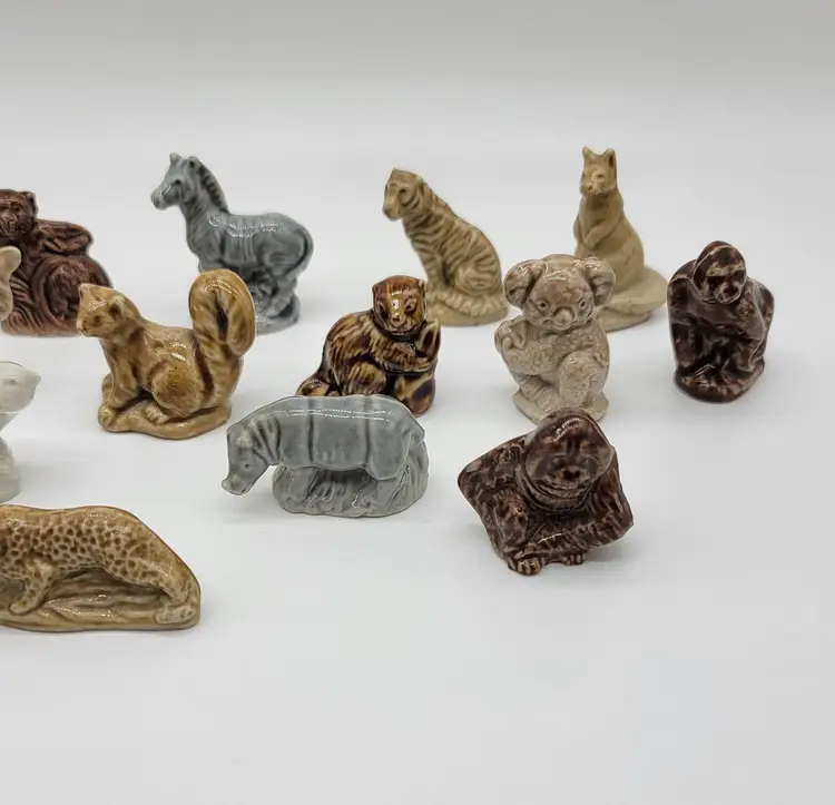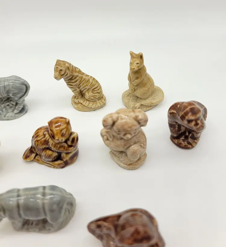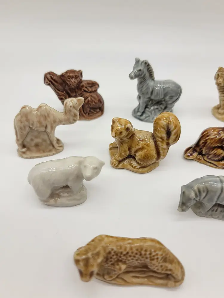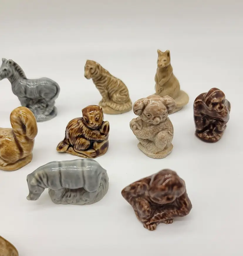 These are series two Wade Whimsies figurines: Beaver, Orangutan, Gorilla, Langur, Racoon, Polar Bear, Camel, Rhino, Koala, Leopard, Zebra, Giraffe, Pine Marten, Kangaroo and Tiger. These were produced from 1985-1996.