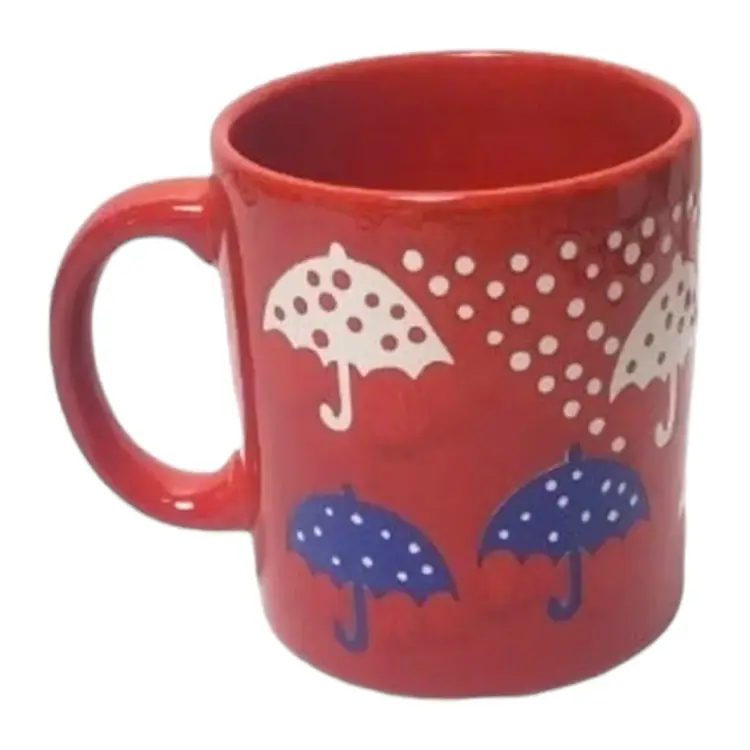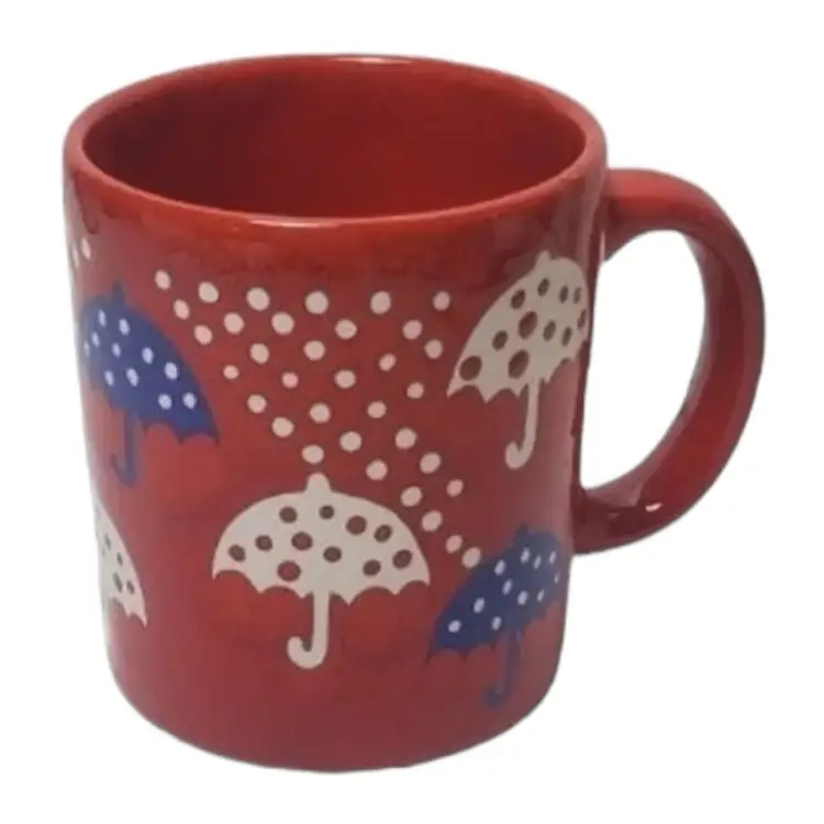 Vintage Waechtersbach red mug with white and blue umbrellas and polka dots. Made in West Germany. Super cute, excellent condition, unisex so makes a great gift. The umbrellas and dots are embossed or impressed into the glaze, it's pretty cool. No chips cracks or crazing
