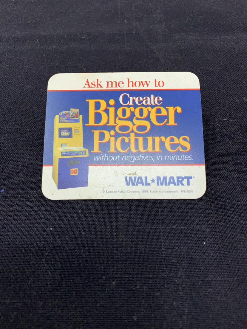 Used Vintage Wal-Mart ‘Ask me how to Create Bigger Pictures’ Promo Button. This Button is from a 90s Wal-Mart promotion.