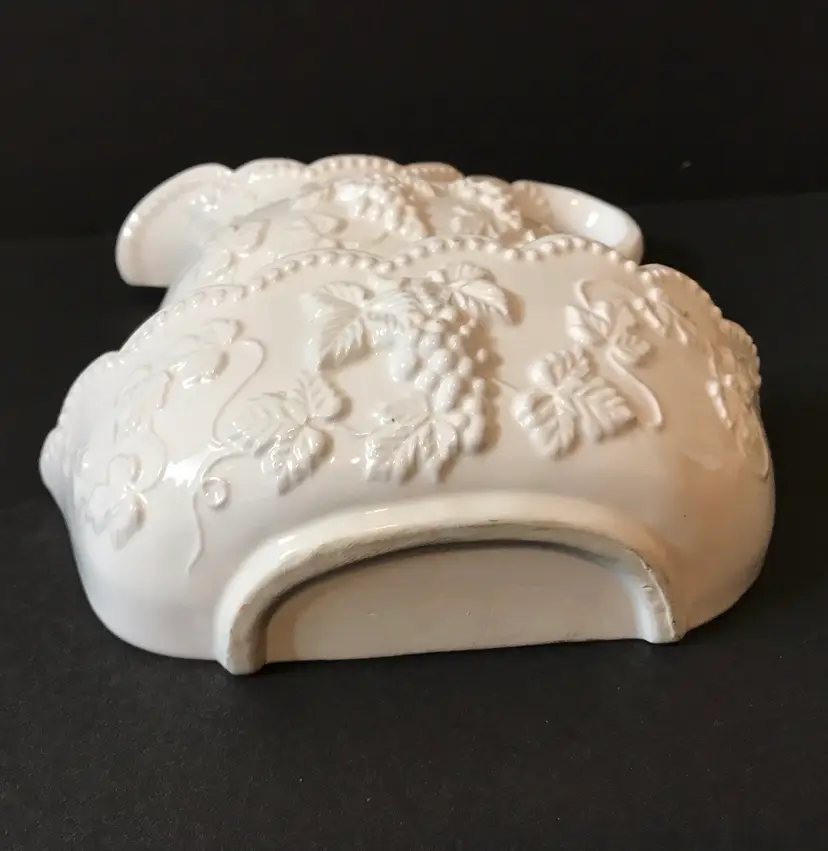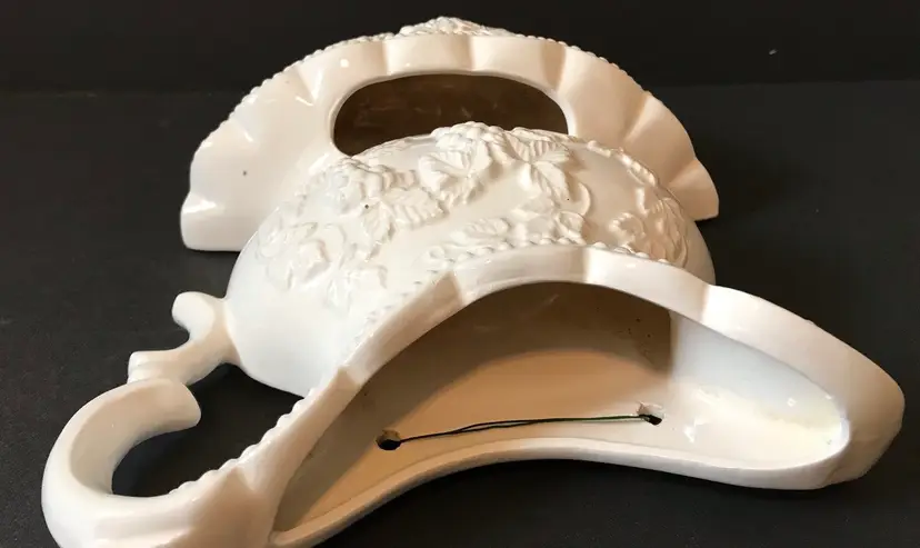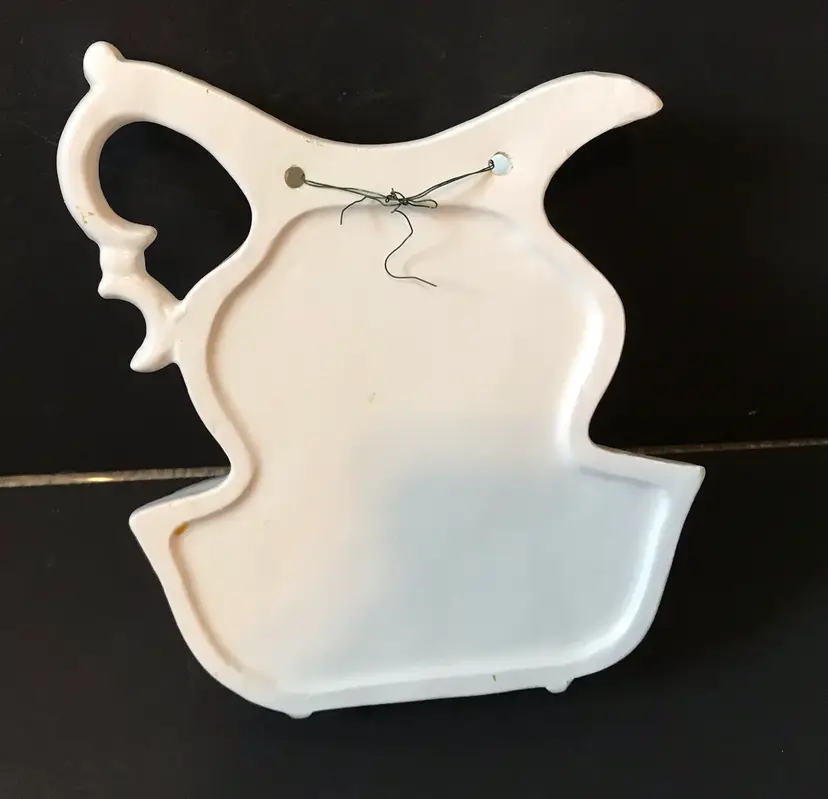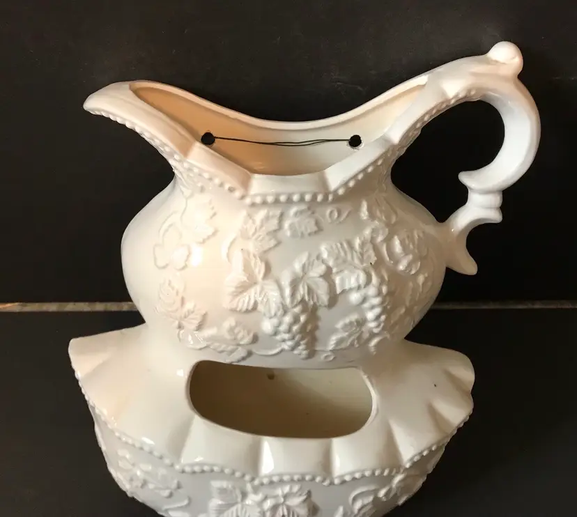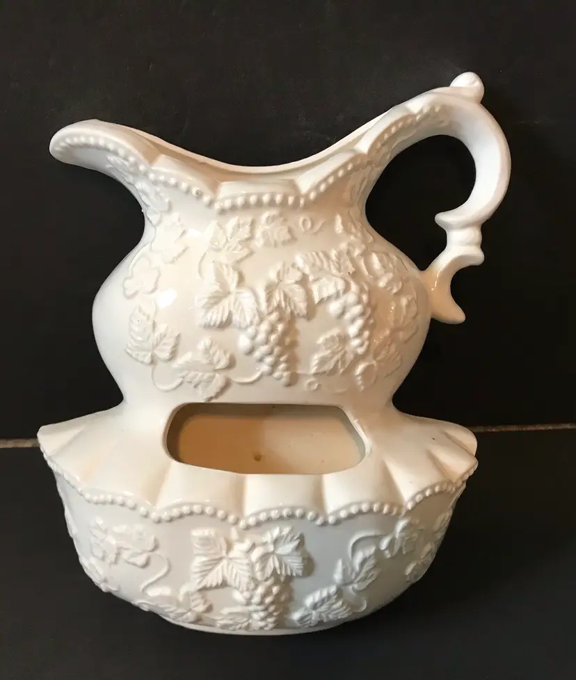 The Vintage Off White Porcelain Grape Vine Pitcher Wall Planter Pair is a charming addition to any home decor. Made from shabby chic style porcelain, these art vases feature a beautiful grapevine design in a classic off-white color. No chips or cracks