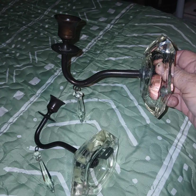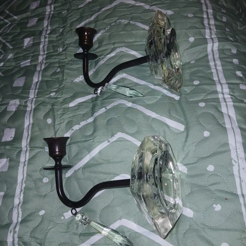 Set of wall scones made of glass and metal with hanging crystal, made by Midwest Co. From India heavy