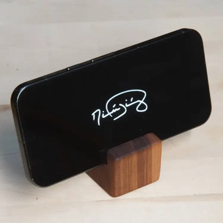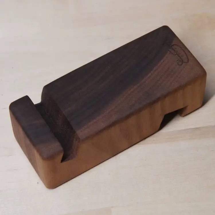 Made from a block of solid walnut, this cell phone stand has a slot on each side — one measuring 3/8" for a phone with no case, and the other at 5/8" to accommodate a phone in a case (make sure your case would fit this slot).