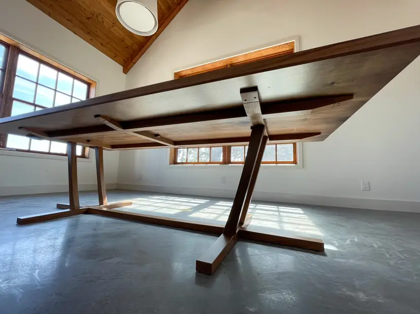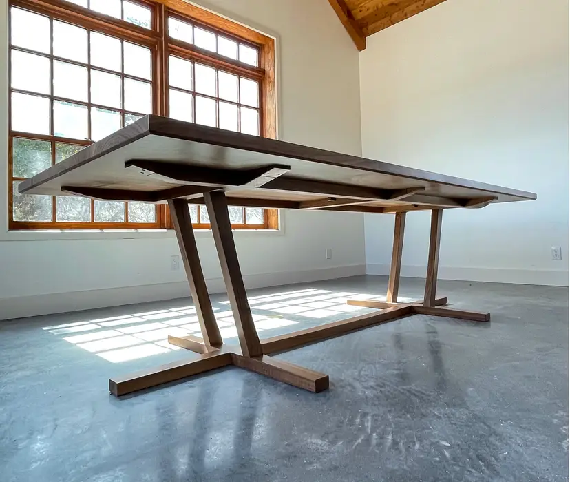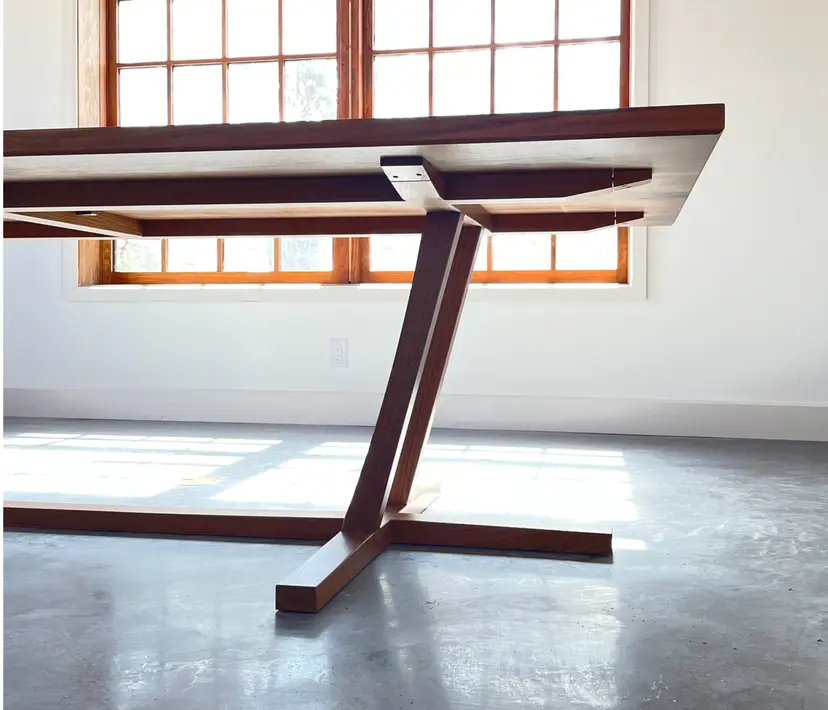 Inspired by one of the greats, George Nakashima! This table balances architectural lines with thoughtfully executed joinery in the base. The base provides generous clearance, allowing chairs to tuck in comfortably from all sides while maintaining an appealing visual presence. Crafted here in walnut measuring 30" tall x 40" wide x 96" long. Available in multiple species including live edge table top, contact for custom orders. Please send message for final shipping details. Please note I have a 5-6 month delivery timeline.