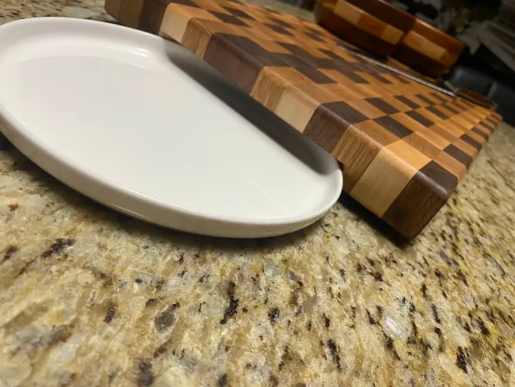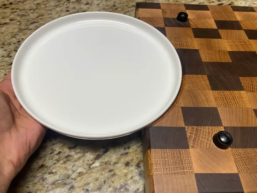 The defining feature of this board are the large sculpted handle cutouts on the underside which are intentionally shaped to accept a standard dinner plate. This allows food to be slid directly from the board onto a plate with ease and is ideal for transferring chopped ingredients, sliced meats, or finished dishes without lifting or tipping the board. No more cleaning up toppings and juices from your countertop.