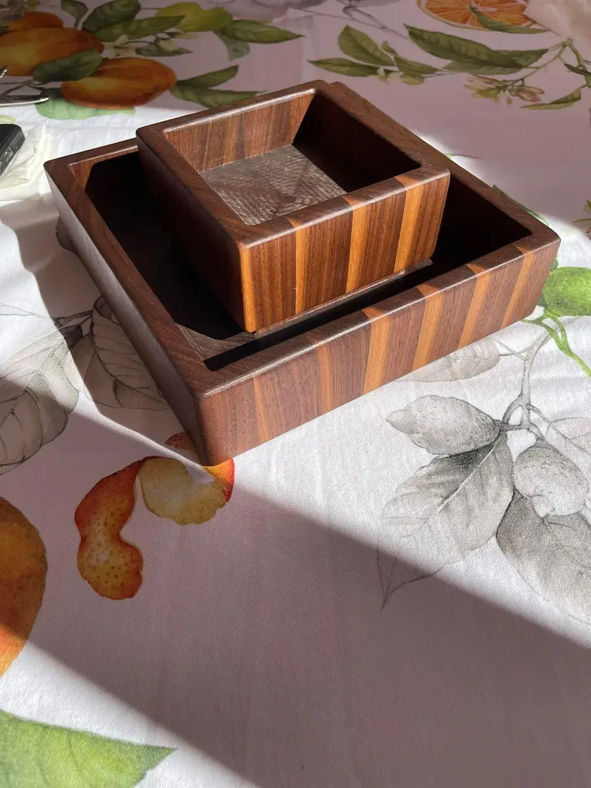 These are perfect for serving pistachios in the top dish with disposal of the shells in the lower dish and separate for easy cleanup. Made from end grain black walnut with a precision interlock between each piece.