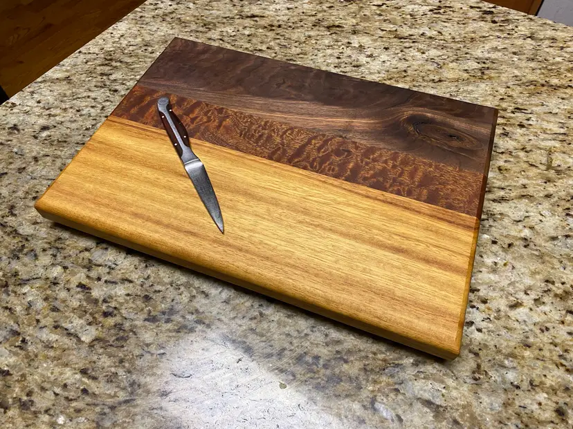 This is a gorgeous cutting board handcrafted out of very rare wood. African Teak and Pomelle Sapele are both extremely sought after, and the color pops under light. They're very hardwearing and durable and would fit in any kitchen.