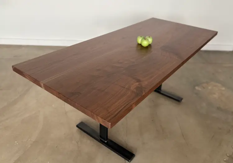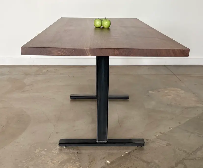 This apartment-friendly dining table features an eased-edge natural walnut top with a blackened steel trestle base with a high steel stretcher. Dimensions: 32” wide x 72” long x 30” high Also available in different dimensions and wood species. Contact us for custom work.