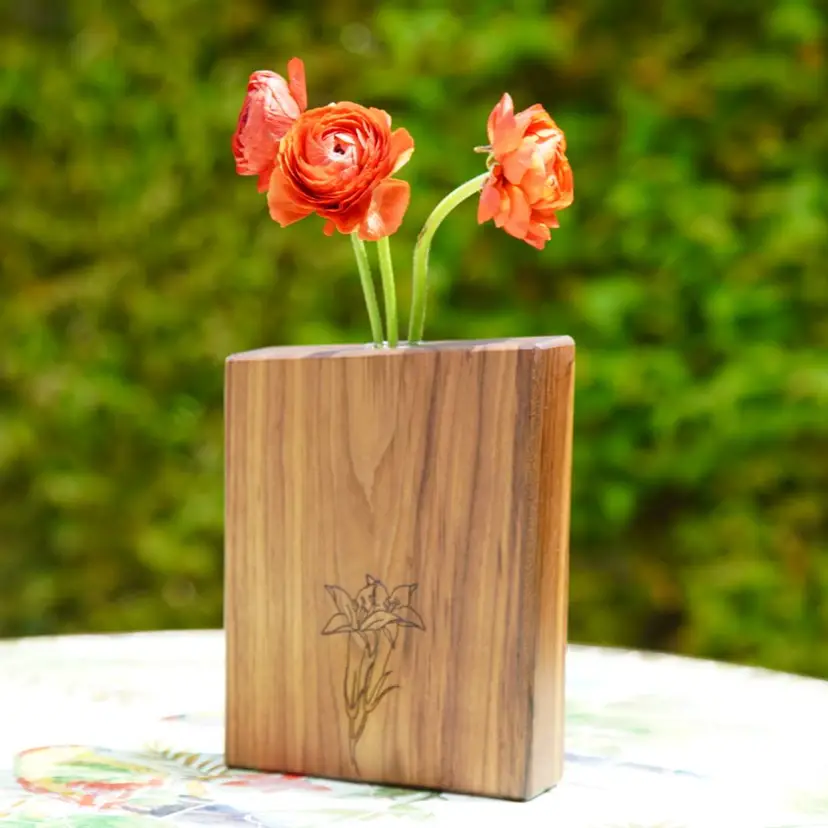 Enhance your decor with this handcrafted walnut wood vase. Perfect for displaying a single flower (or a few), its sleek design and rich wood grain add a stylish touch to any space. The vase features an engraving of lilies drawn by Miami tattoo artist Pooka on two sides.