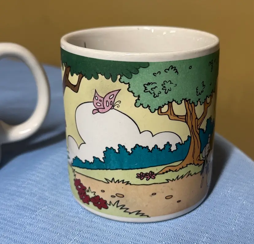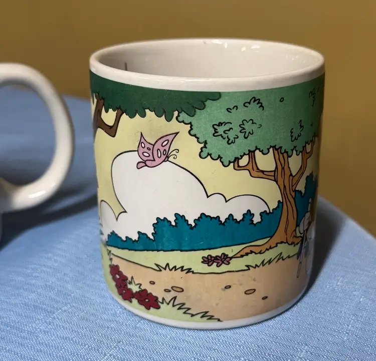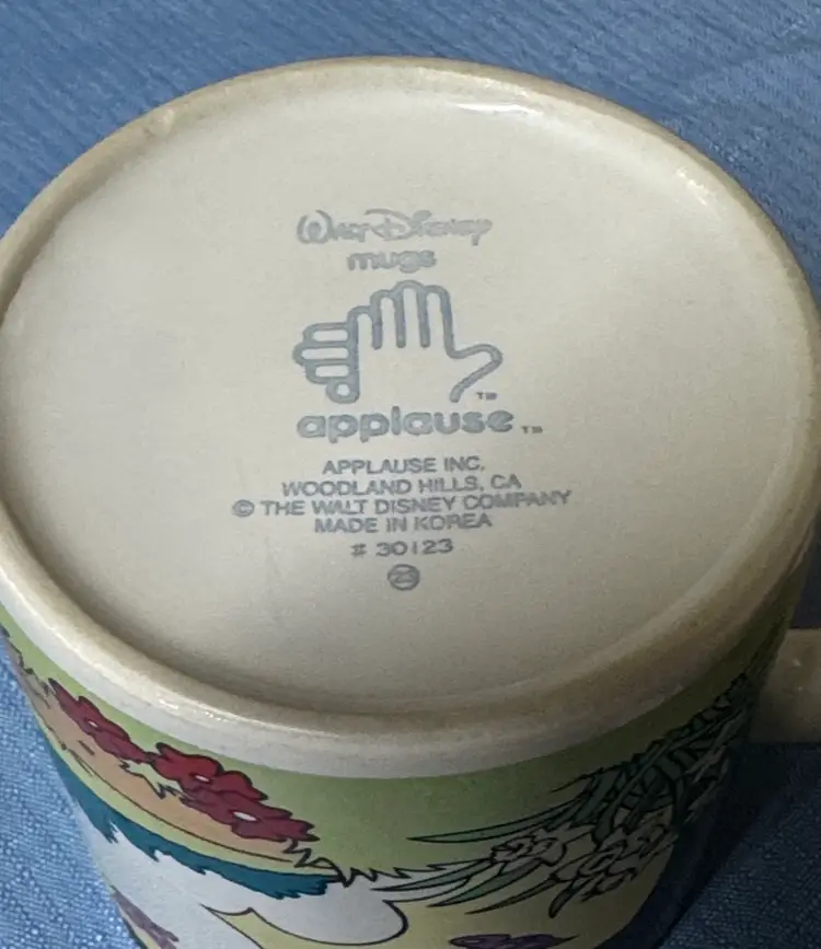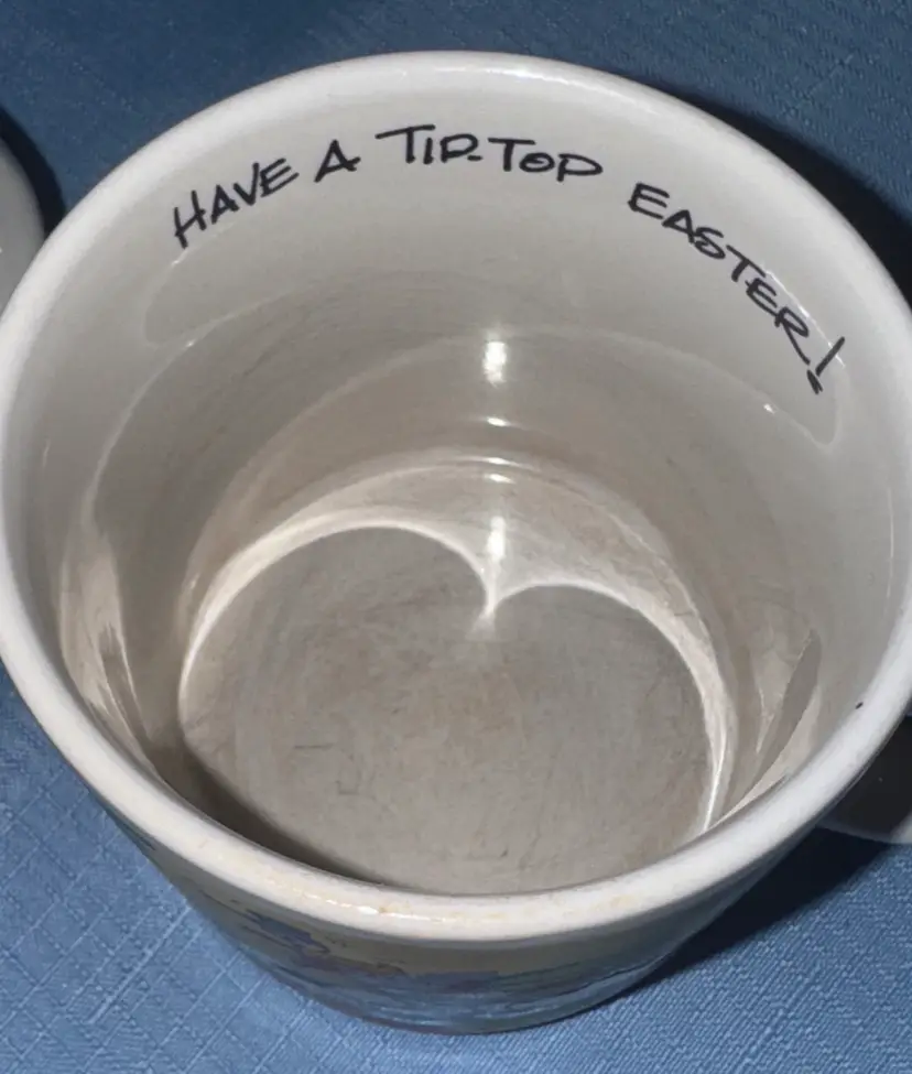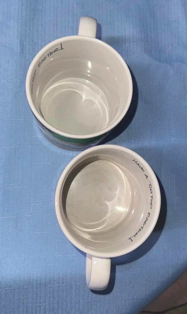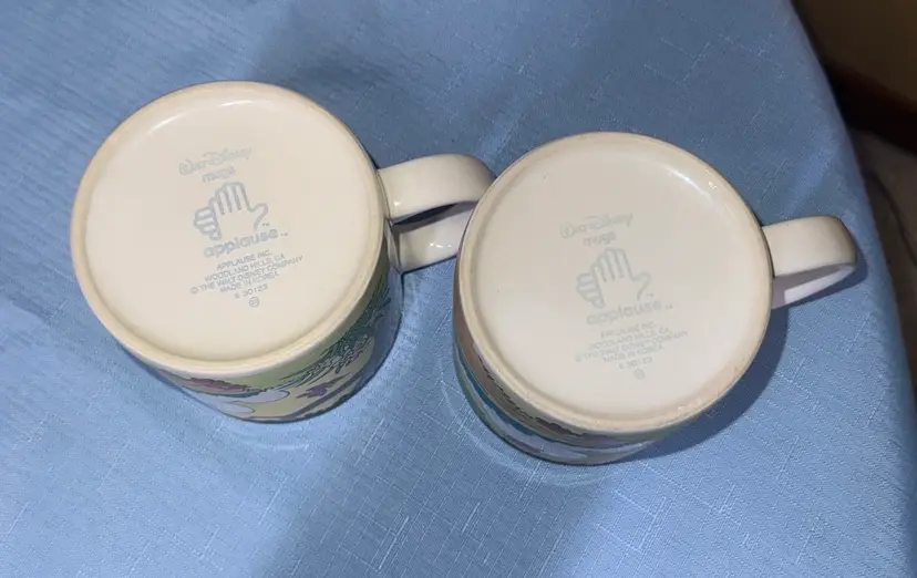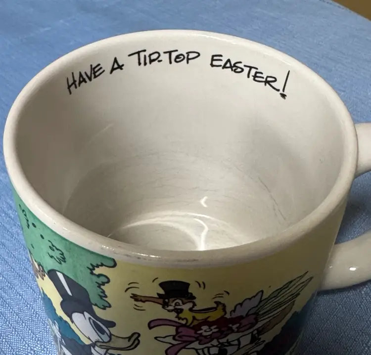 Set of two Disney character mugs with colorful design. Features cartoon characters in a playful scene. Walt Disney Applause Donald Duck “Have A Tip Top Easter!” #30123 Coffee Mugs set of 2 3.5” tall 3.5” diameter No breaks or chips there are utensil scratches inside (213225261)