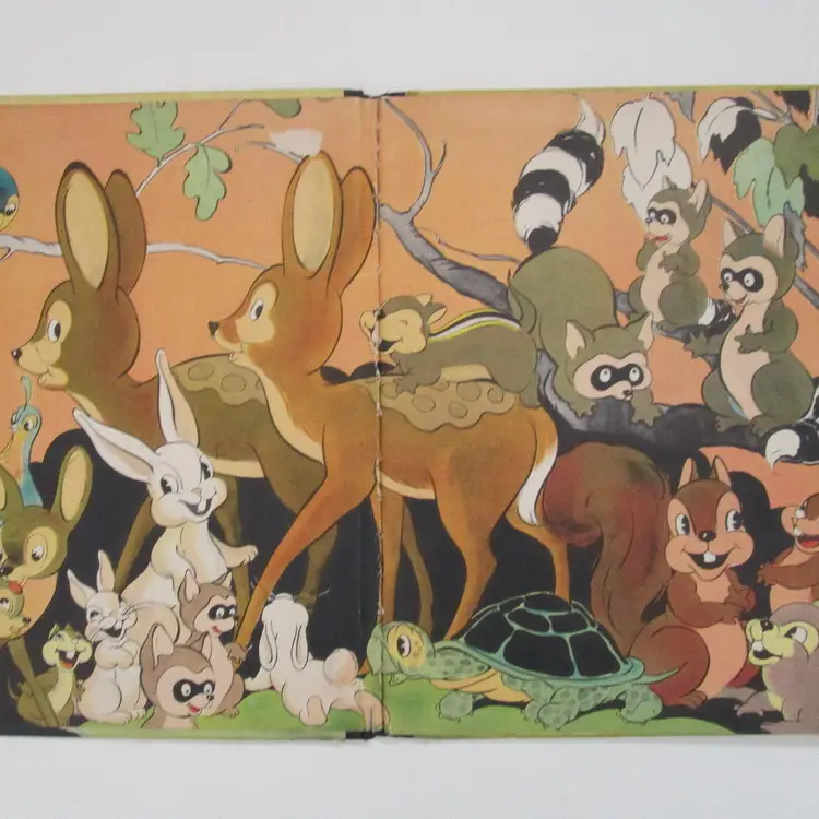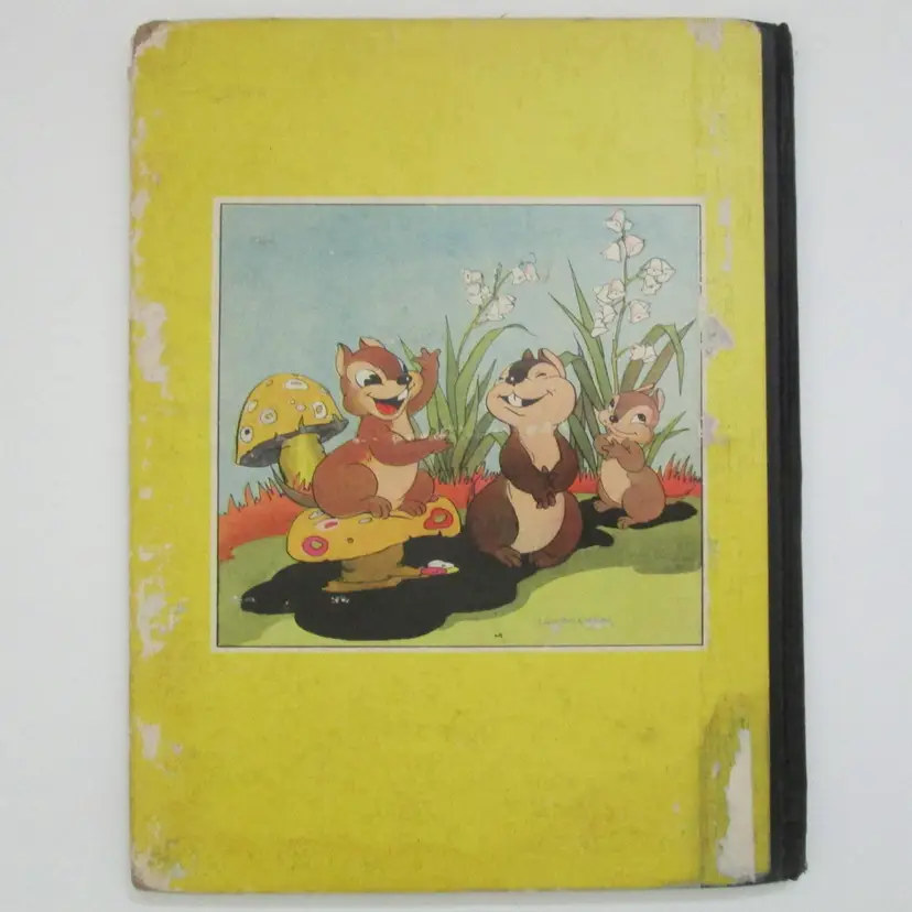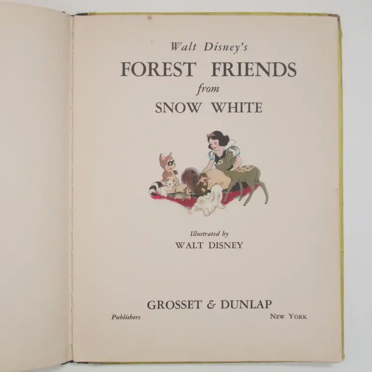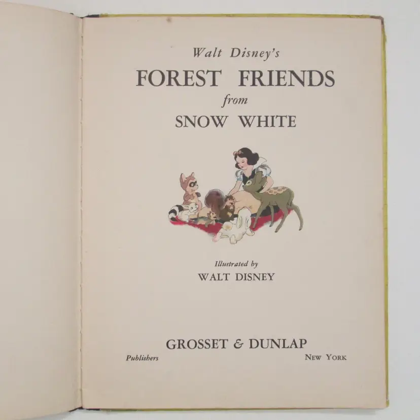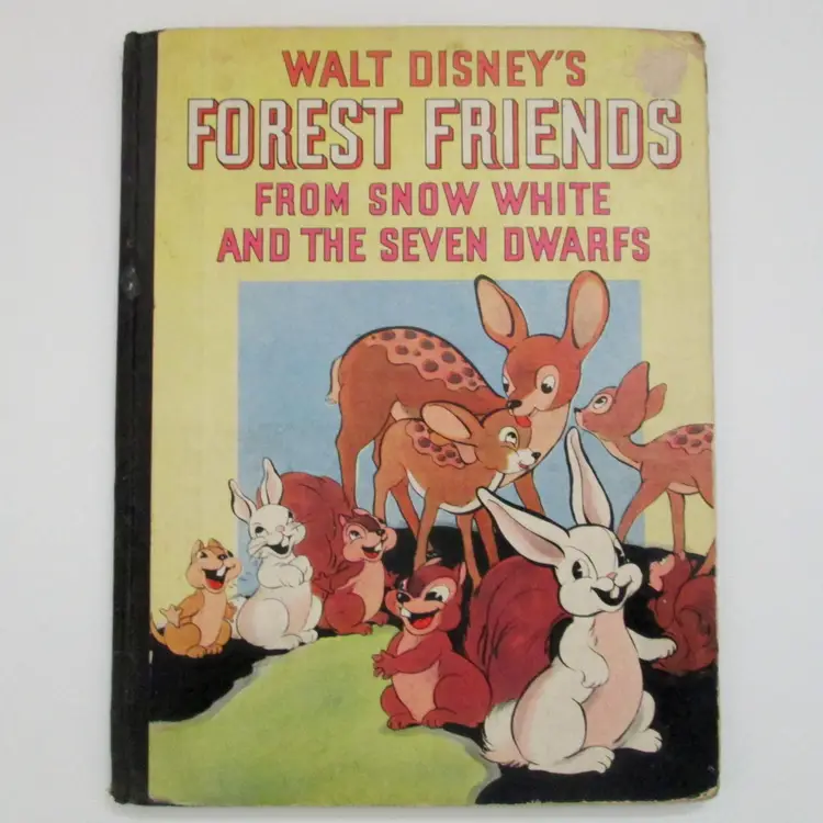 Walt Disney Forest Friends Children's book from 1938. Forest Friends from Snow White and the Seven Dwarfs. Illustrated, with black and white pages and some color panels. Front and back covers have wear, especially on corners. Also, one B&W page has some coloring marks. Pages have some yellowing and either stains or foxing spots.
