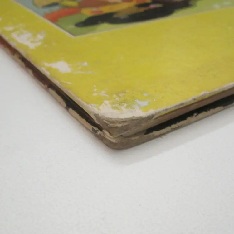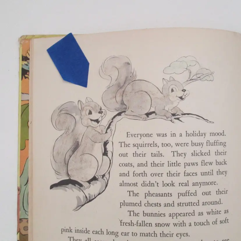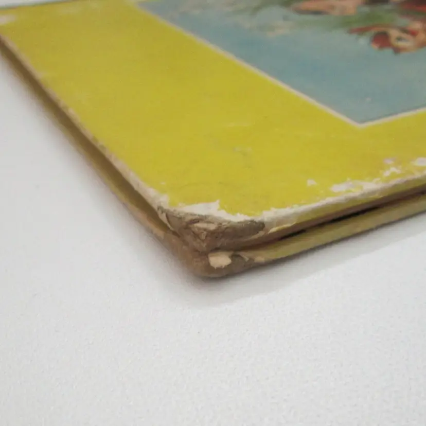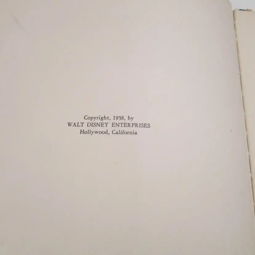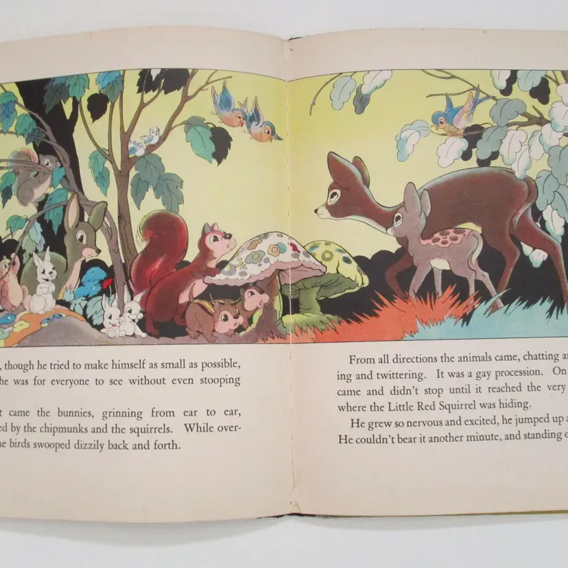 Walt Disney Forest Friends Children's book from 1938. Forest Friends from Snow White and the Seven Dwarfs. Illustrated, with black and white pages and some color panels. Front and back covers have wear, especially on corners. Also, one B&W page has some coloring marks. Pages have some yellowing and either stains or foxing spots.