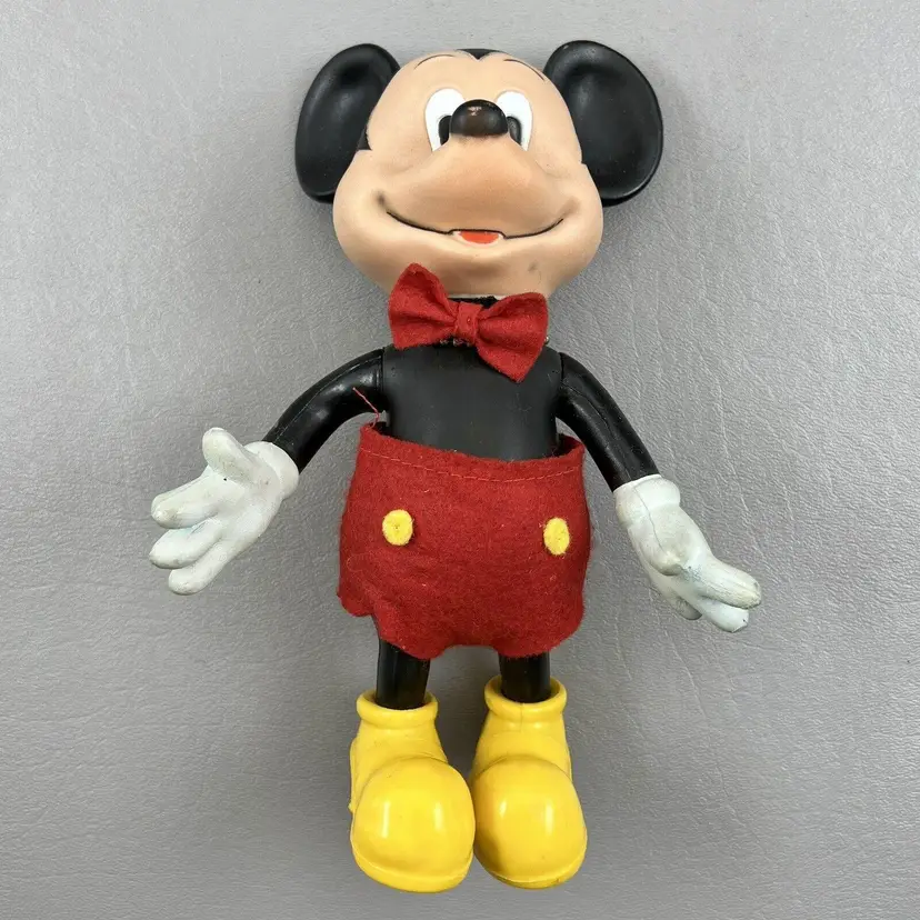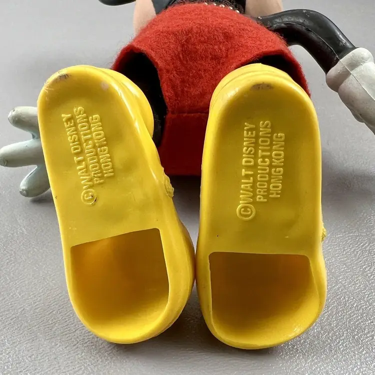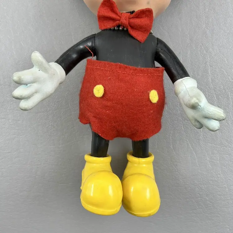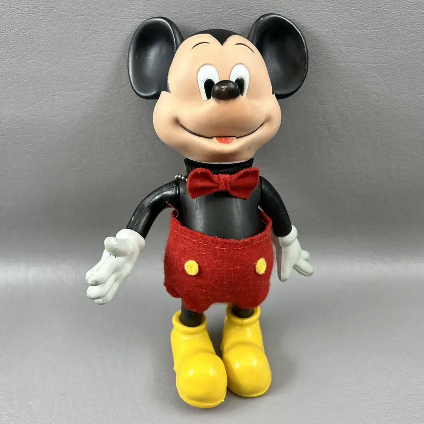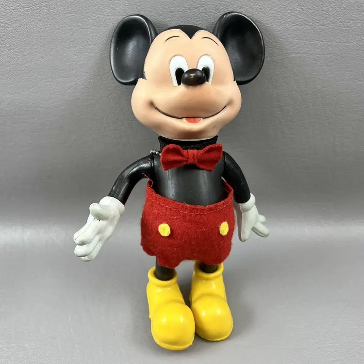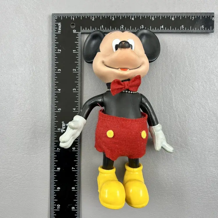 This vintage Walt Disney Productions Mickey Mouse articulated figure stands at 7.5 inches tall and was made in Hong Kong. It features the beloved character Mickey Mouse, and is a perfect addition to any Disneyana or collectibles collection. The figure shows the attention to detail that is characteristic of Disney products. It will make a great addition to any fan's collection.