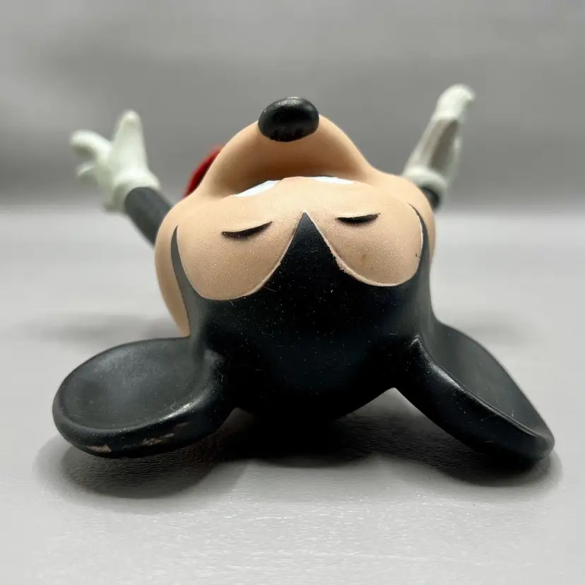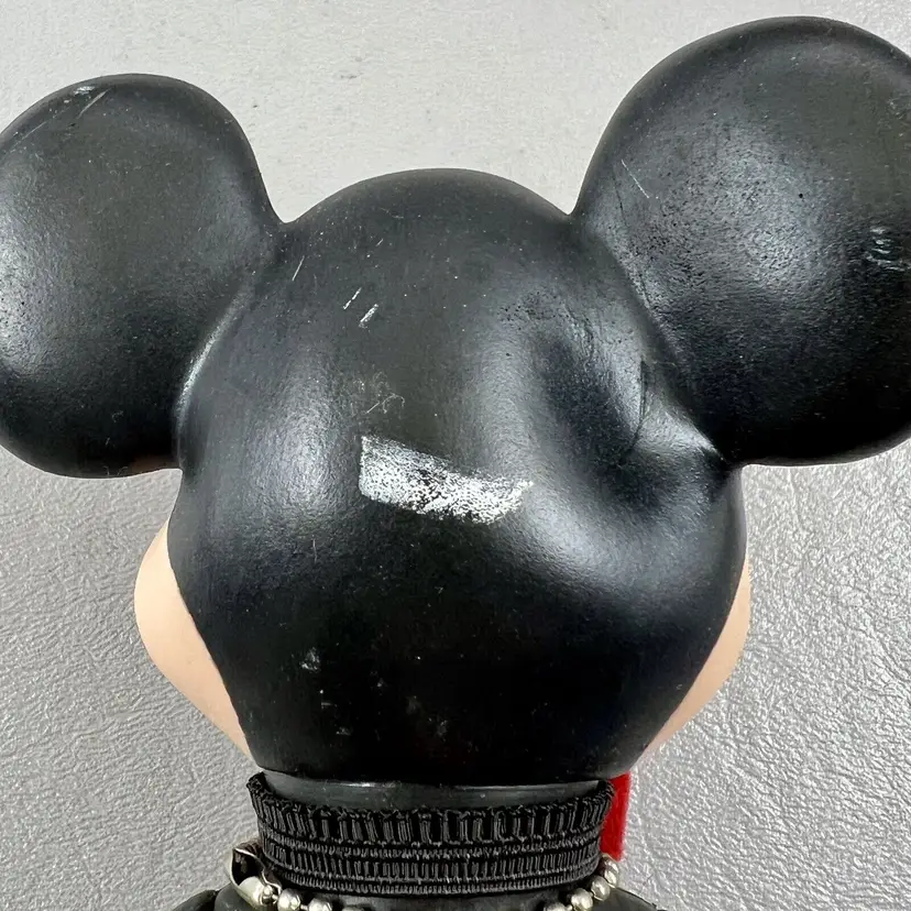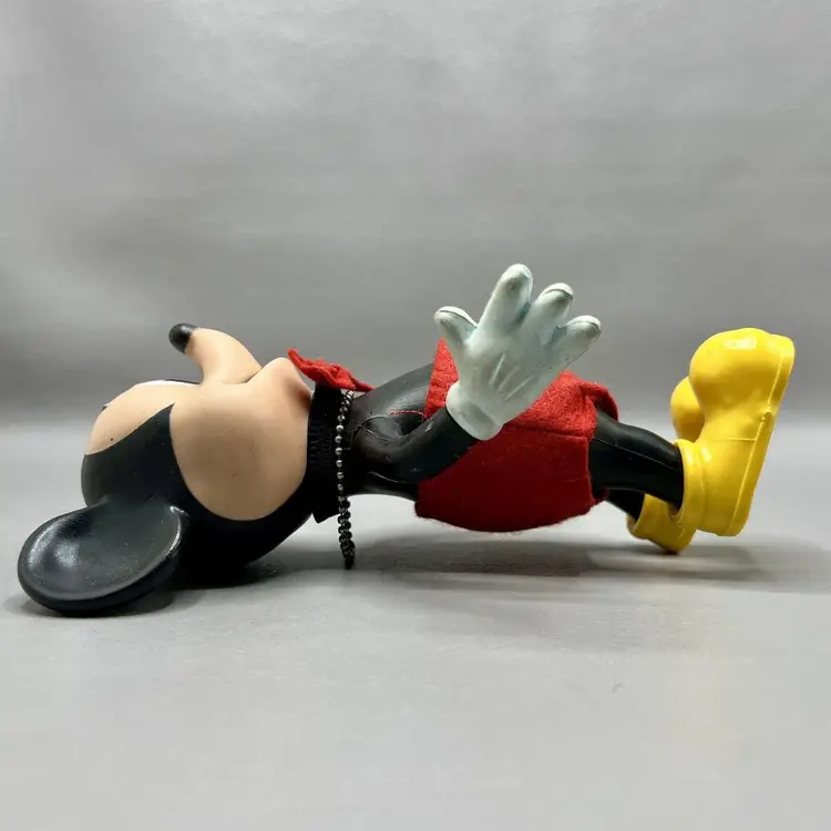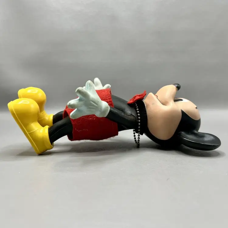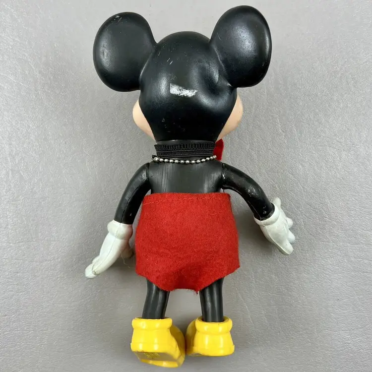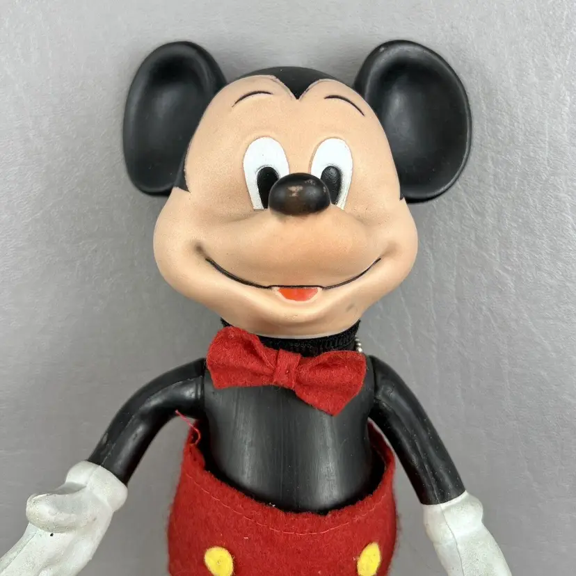 This vintage Walt Disney Productions Mickey Mouse articulated figure stands at 7.5 inches tall and was made in Hong Kong. It features the beloved character Mickey Mouse, and is a perfect addition to any Disneyana or collectibles collection. The figure shows the attention to detail that is characteristic of Disney products. It will make a great addition to any fan's collection.